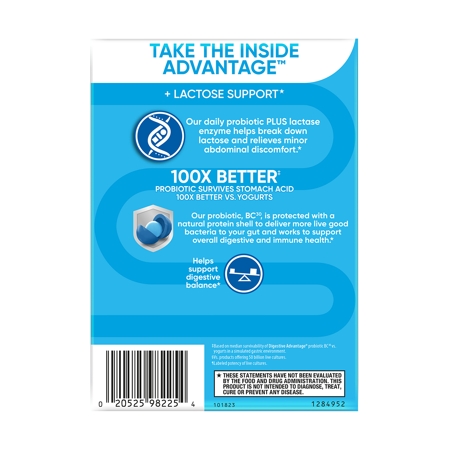 - ONE-HUNDRED TIMES BETTER: 1 Billion CFUs of patented BC-30 probiotics survives stomach acid 100X BETTER vs. yogurt. Based on median survivability of Digestive Advantage Probiotic BC30 vs. yogurts in a simulated gastric environment.