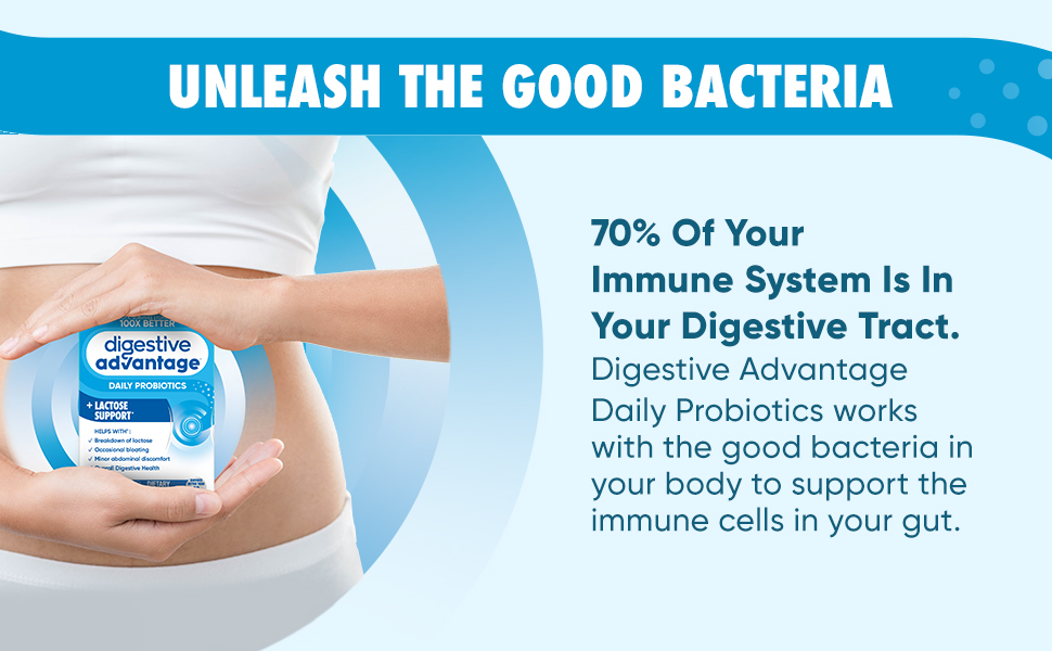 - IMMUNITY: 70% of your immune system is in your digestive tract. The good bacteria in Digestive Advantage Daily Probiotics helps support the immune cells in your gut.