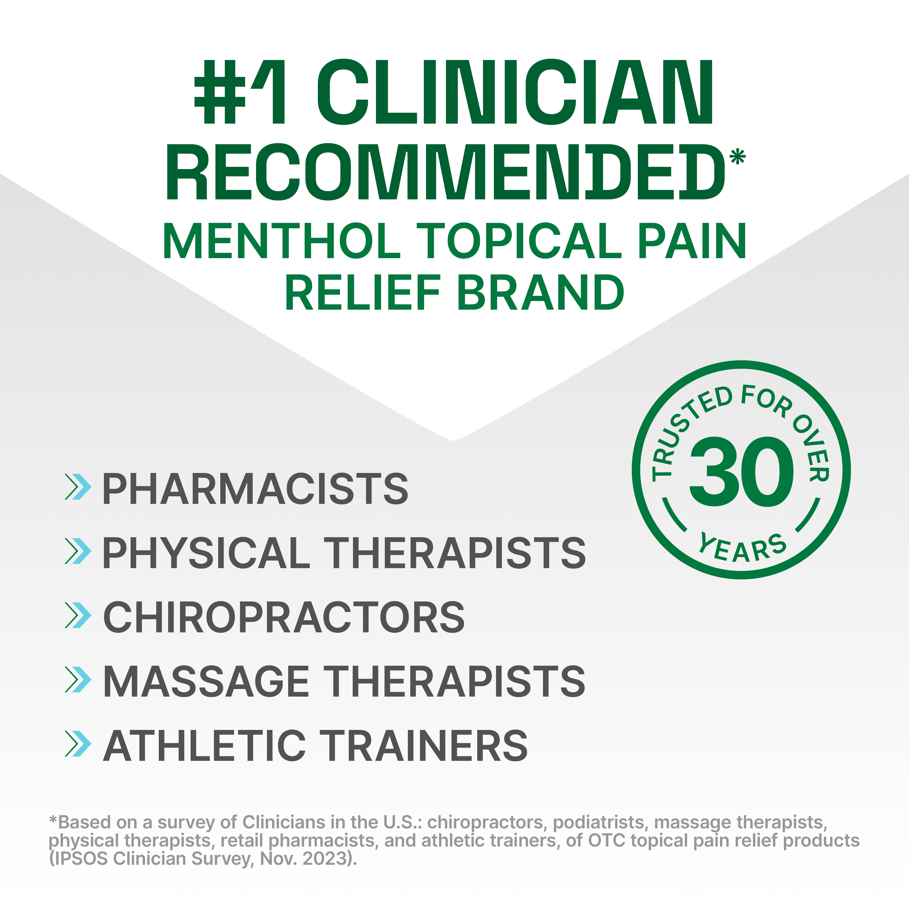 - *Based on an Ipsos Clinician Survey of: chiropractors, podiatrists, physical therapists, massage therapists, retail pharmacists, & athletic trainers, of OTC topical pain relief products; among clinicians who recommend brands containing menthol