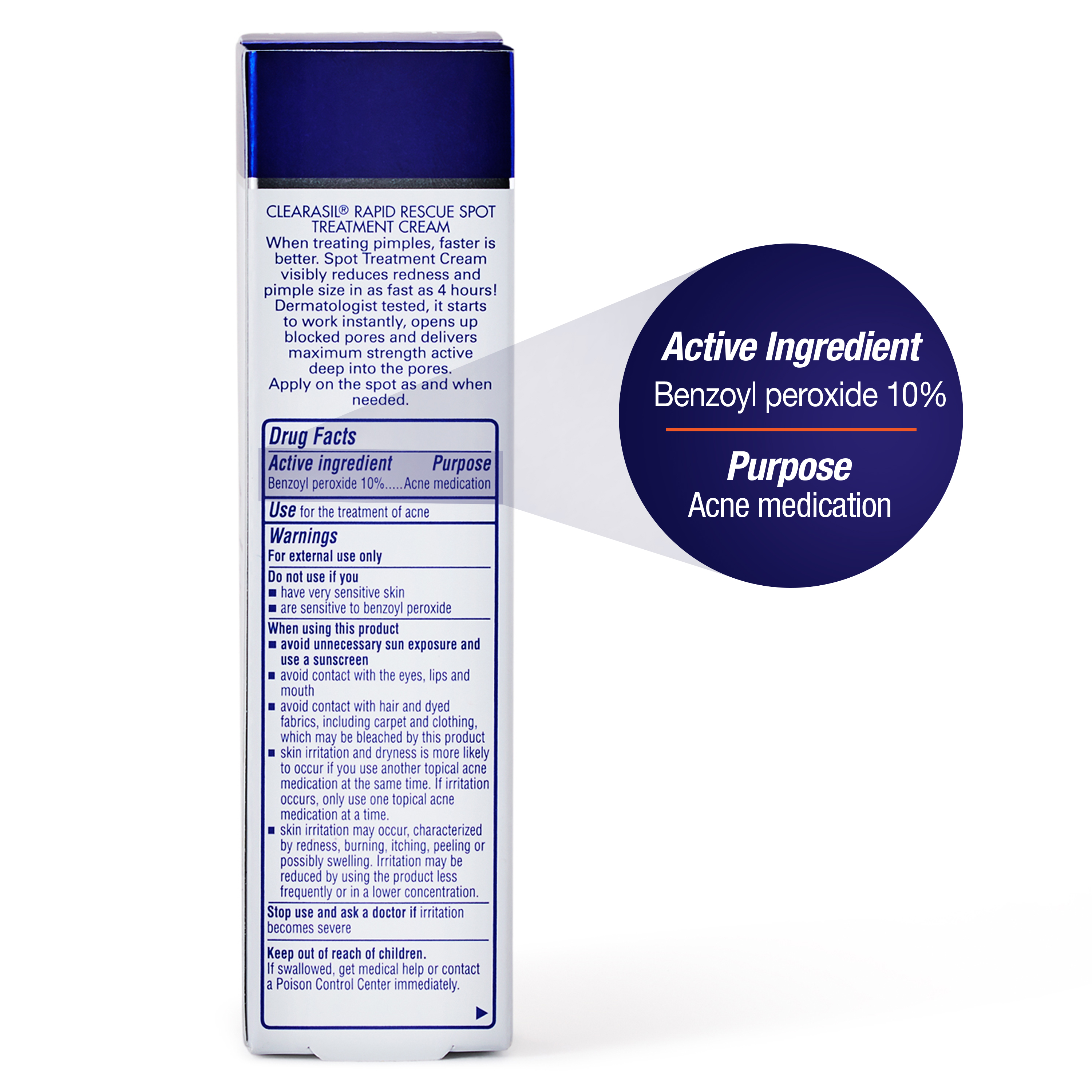 | Bullet Features | - [VISIBLE RESULTS IN 4 HOURS]: Clearasil Rapid Spot Treatment Cream reduces pimple size and redness in as little as four hours
