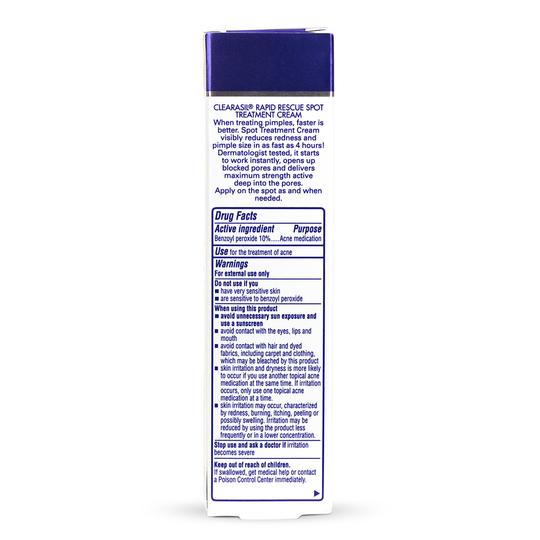 | Product Description | Clearasil Rapid Spot Treatment Cream is your one-stop solution to open blocked pores and reduce pimple size and redness within four hours to give you clear beautiful skin. The acne treatment cream comes with Benzoyl Peroxide Acne Medication that clears existing pimples and helps prevent new ones from forming. Clearasil cream always provides deep cleansing by tackling pimples above and below the skin surface for rapid treatment. The spot treatment cream starts working instantly to deliver maximum strength medicine deep into pores so you can live a carefree life today and tomorrow. This rapid-action cream absorbs quickly into the skin and penetrates your pores to fight breakouts. The cream is designed to use only for acne medication.