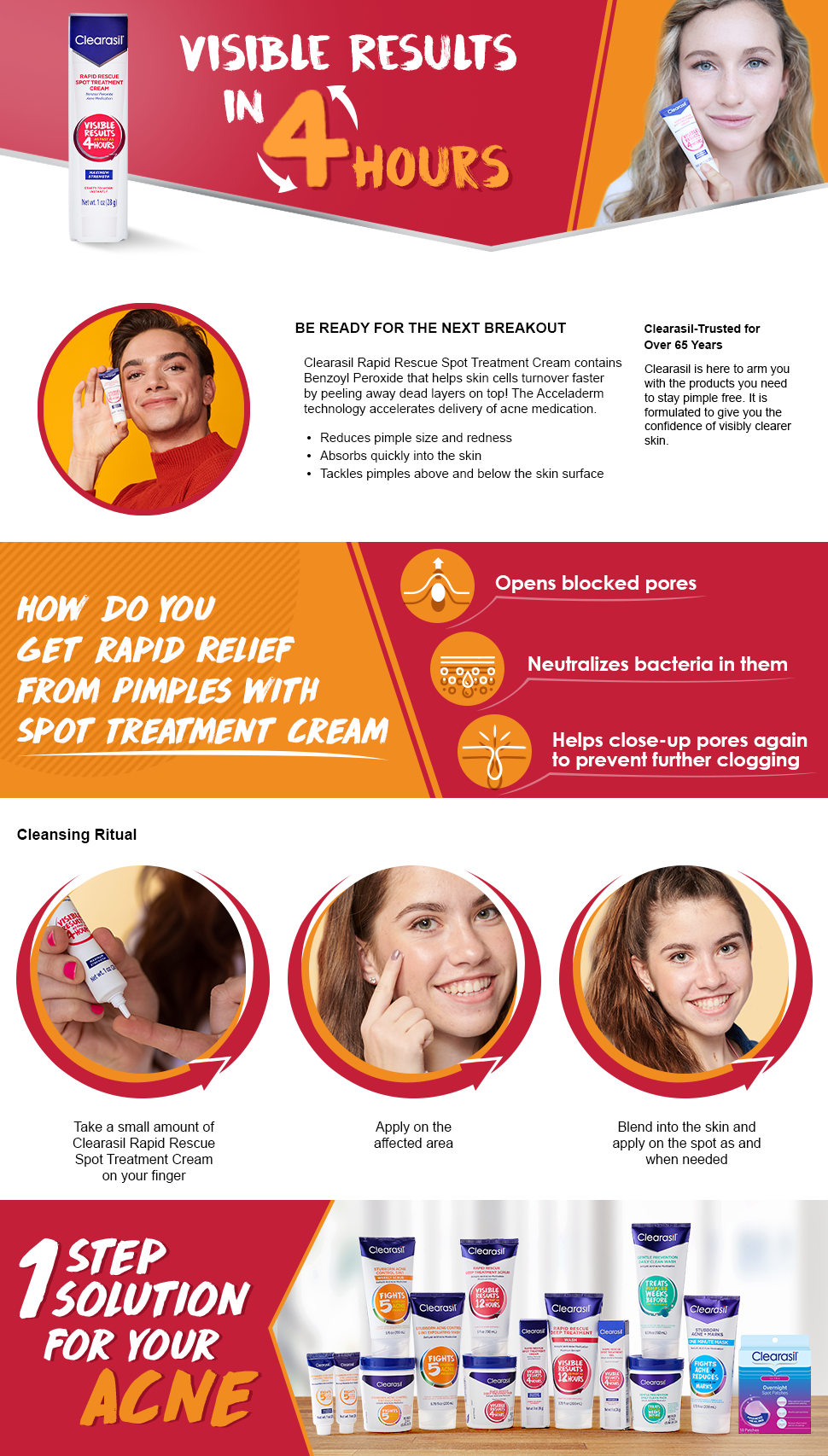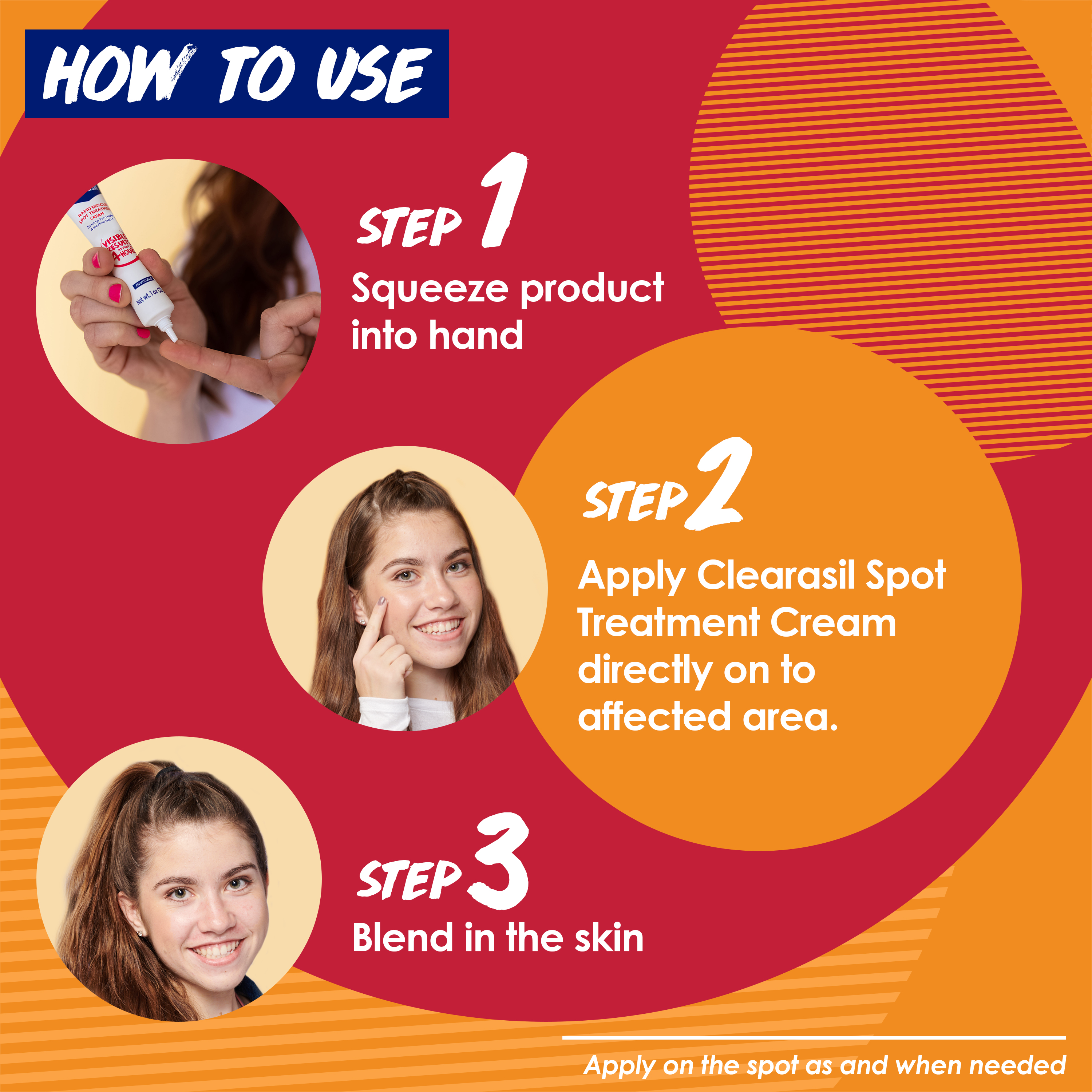 How To Use: Apply Clearasil Rapid Spot Treatment Cream directly onto the affected area and blend into the skin. Apply on the spot as and when needed.