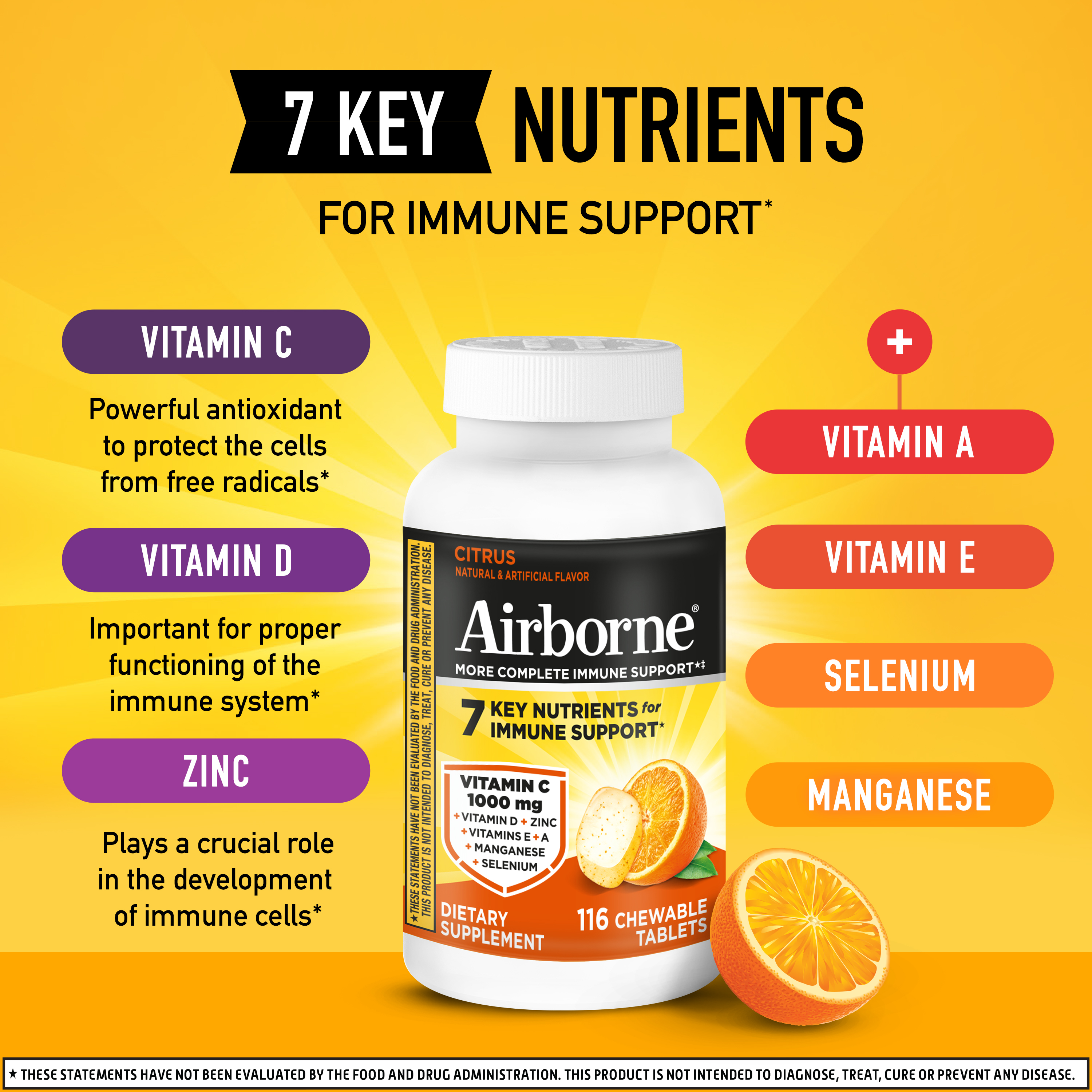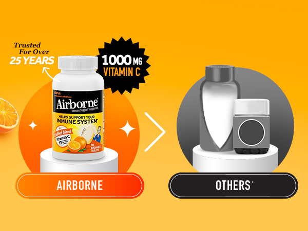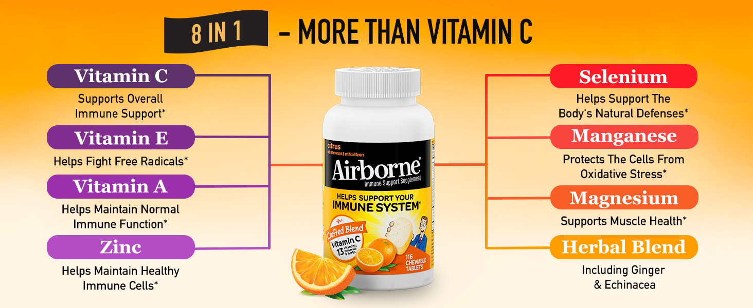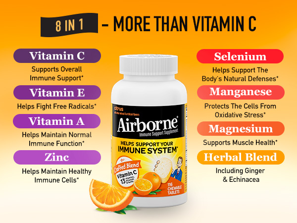 - VITAMIN C 1000mg: Airborne Vitamin C chewable Zinc tablets are packed with 1000mg Vitamin C per serving, which helps support your immune system.*