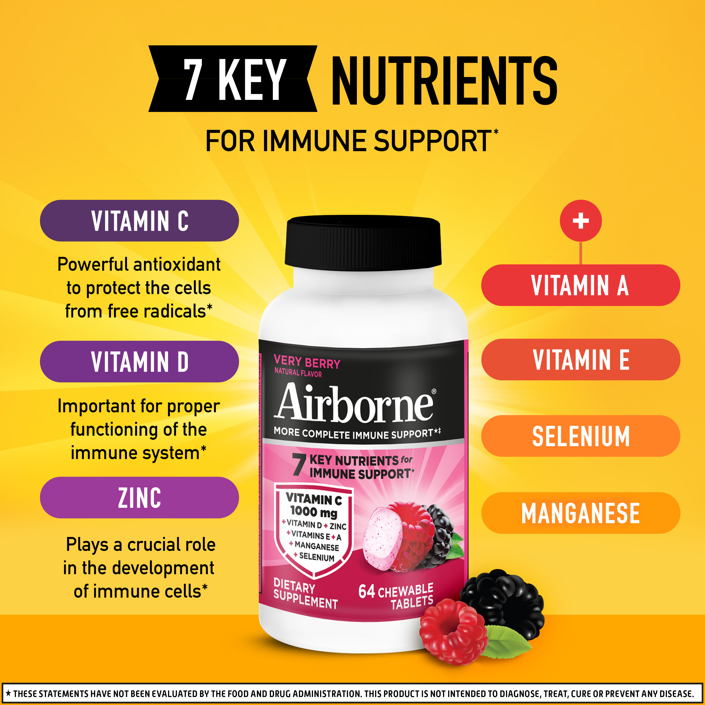 - VITAMIN C 1000mg: Airborne Vitamin C chewable Zinc tablets are packed with 1000mg Vitamin C per serving, which helps support your immune system.*