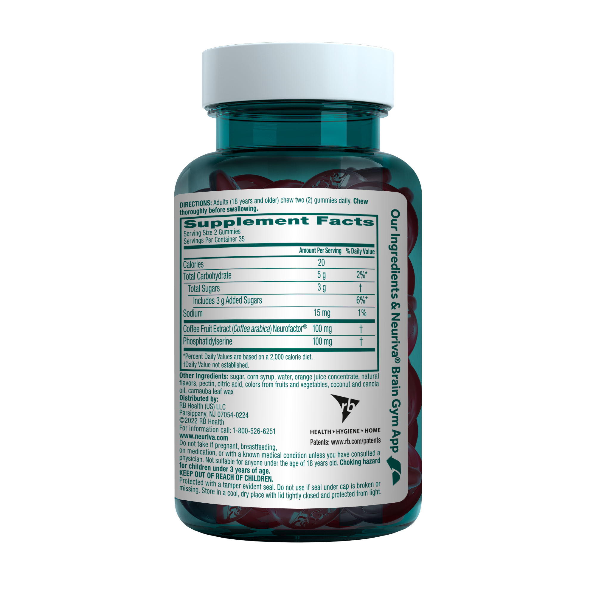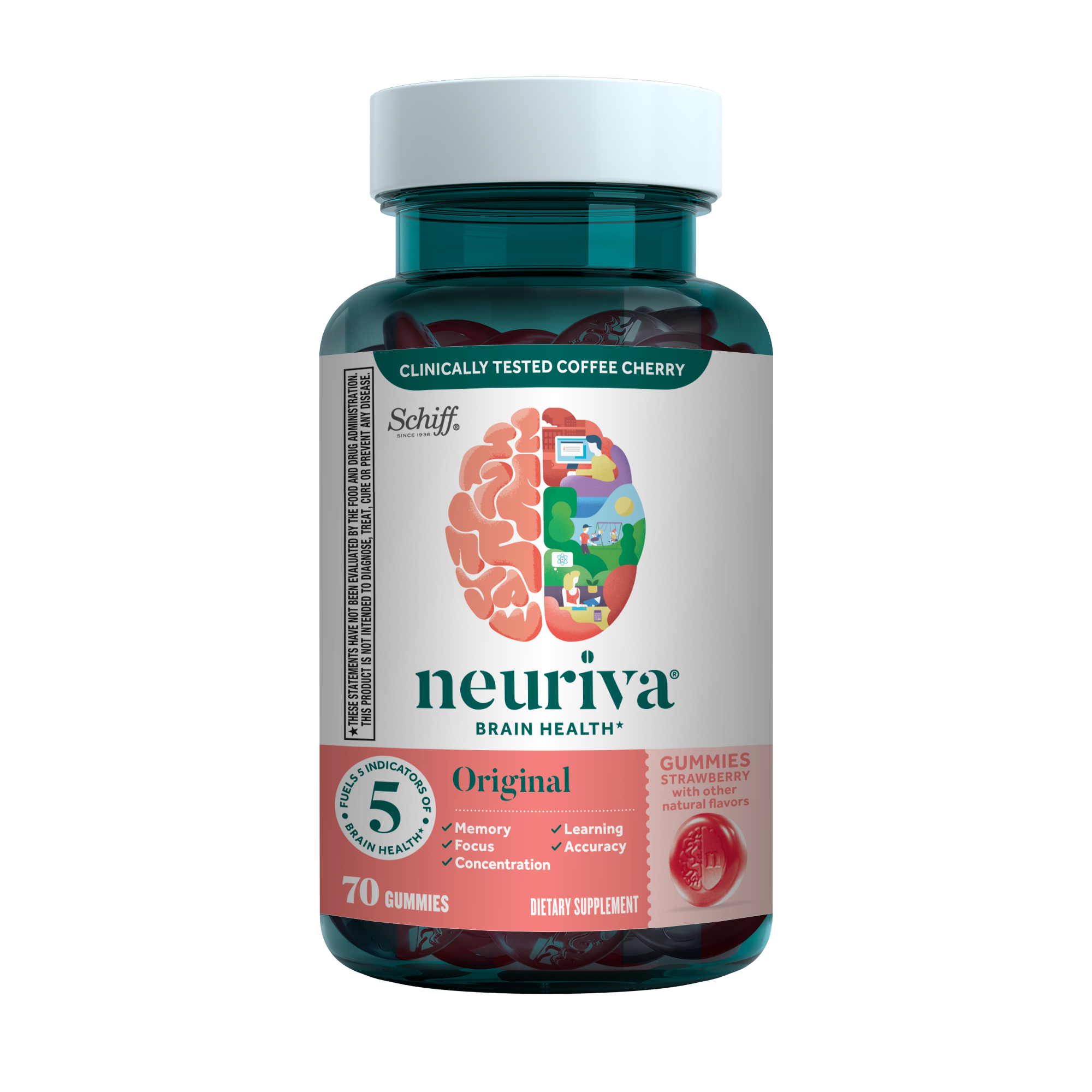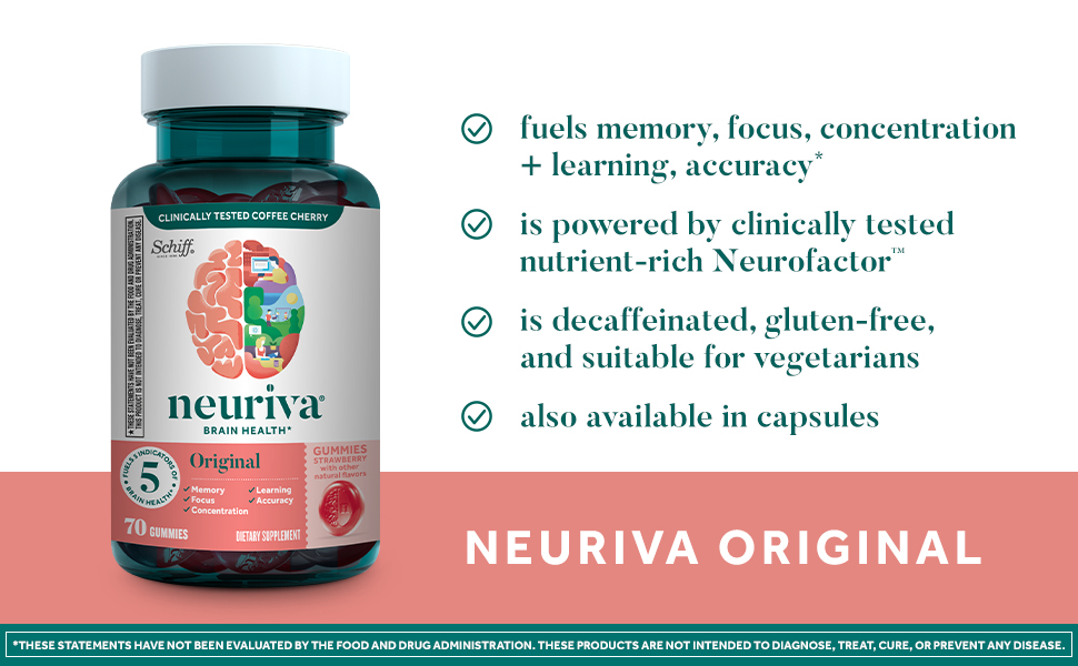 - FUELS 5 INDICATORS OF BRAIN PERFORMANCE*: Neuriva Original Gummies fuel 5 indicators of brain performance*: focus, memory, learning, accuracy and concentration. Neuriva Original Gummies are also decaffeinated, vegetarian, naturally flavored, and gluten-free.