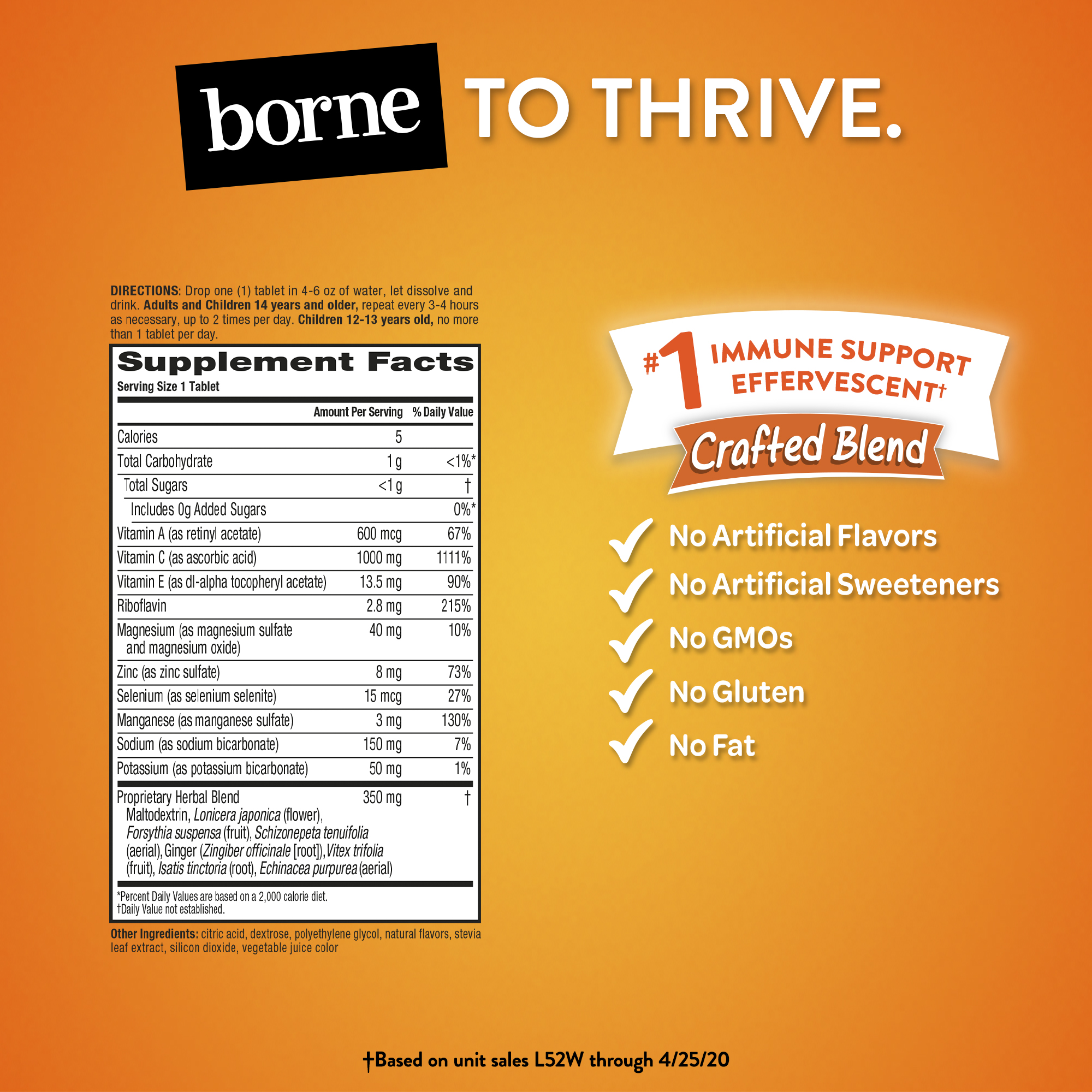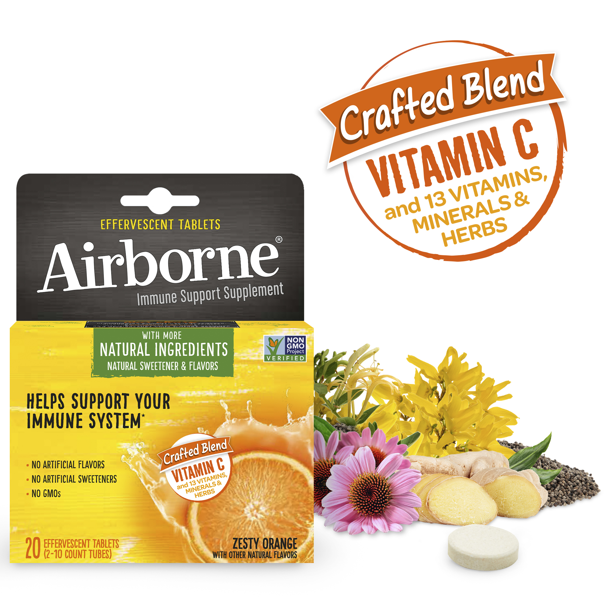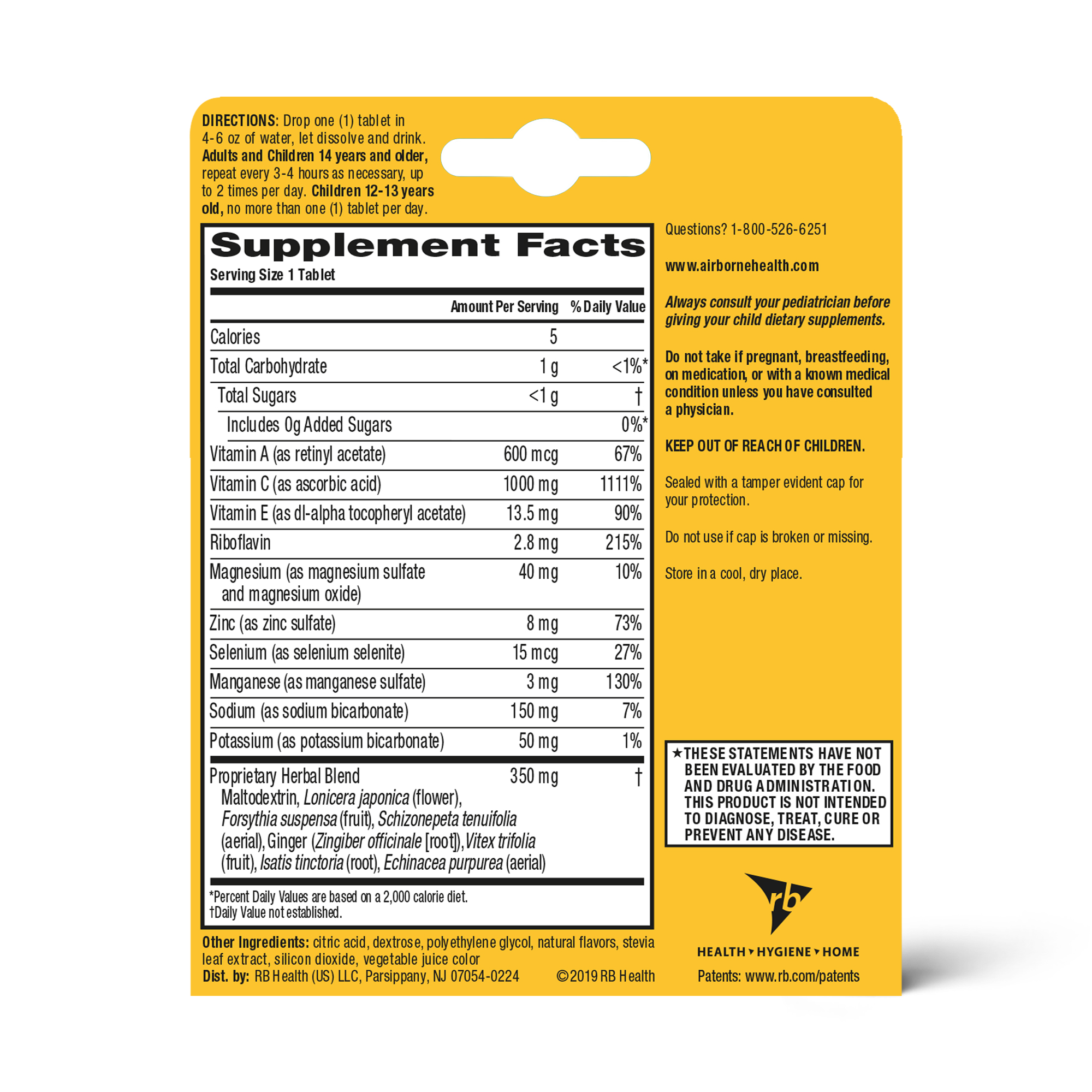 | Product Description | Airborne immune support effervescent tablets are packed with 1000mg Vitamin C per serving, which helps support your immune system.* These Vitamin C with Zinc effervescent tablets contain 73% of your daily value of Zinc, which plays a central role in your immune system and is essential for the functioning and signaling of immune cells.* Airborne immune support tablets contains the powerful antioxidants Vitamin A (to support immune health), Vit C (to support immune health) and Vitamin E (to help fight free radicals).* This crafted blend of 13 immune support vitamins, minerals & herbs is an excellent source of Zinc and Selenium.