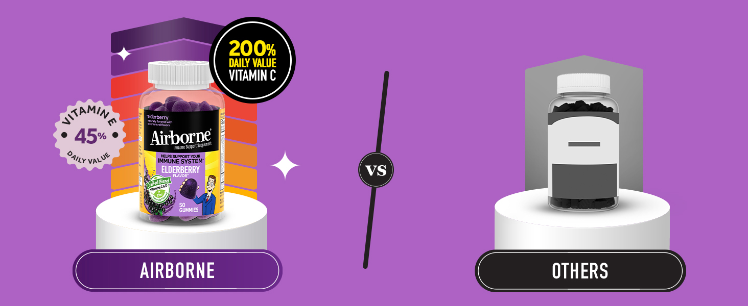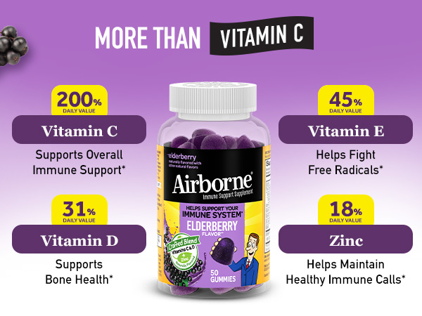 - VITAMIN C: Not all immune support gummies are created equal – and these stand out for good reason! These Airborne Elderberry flavored gummies are packed with 200% of your daily value of Vitamin C per serving (whoa!).