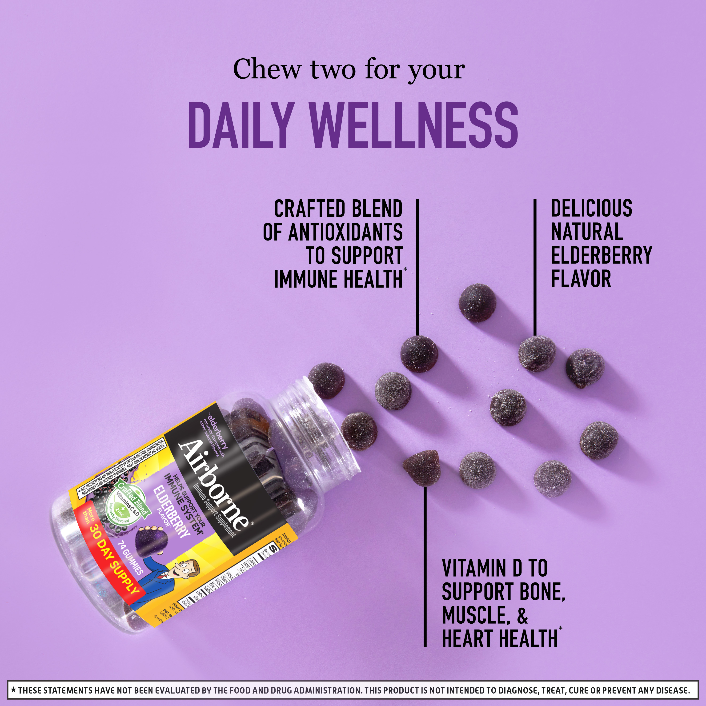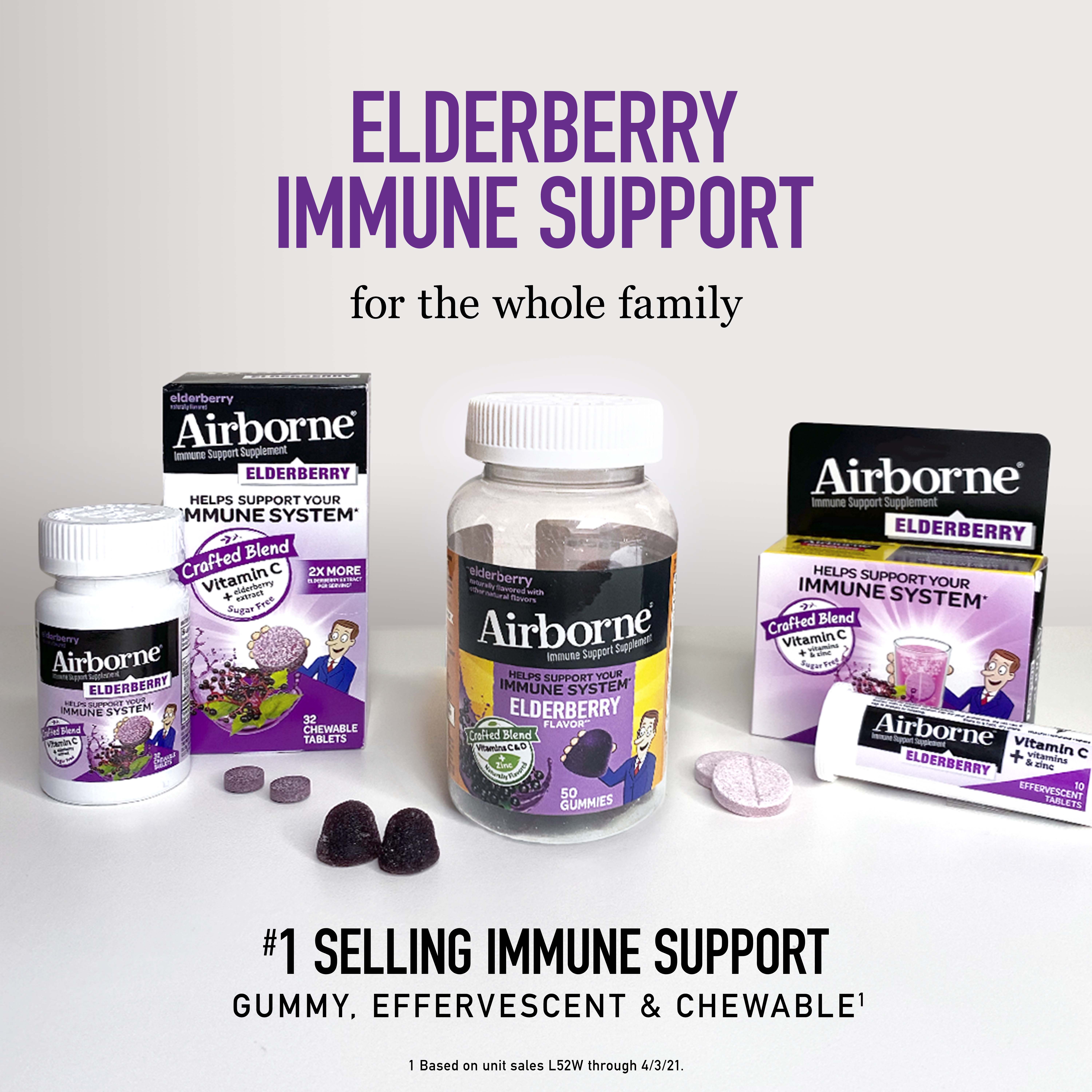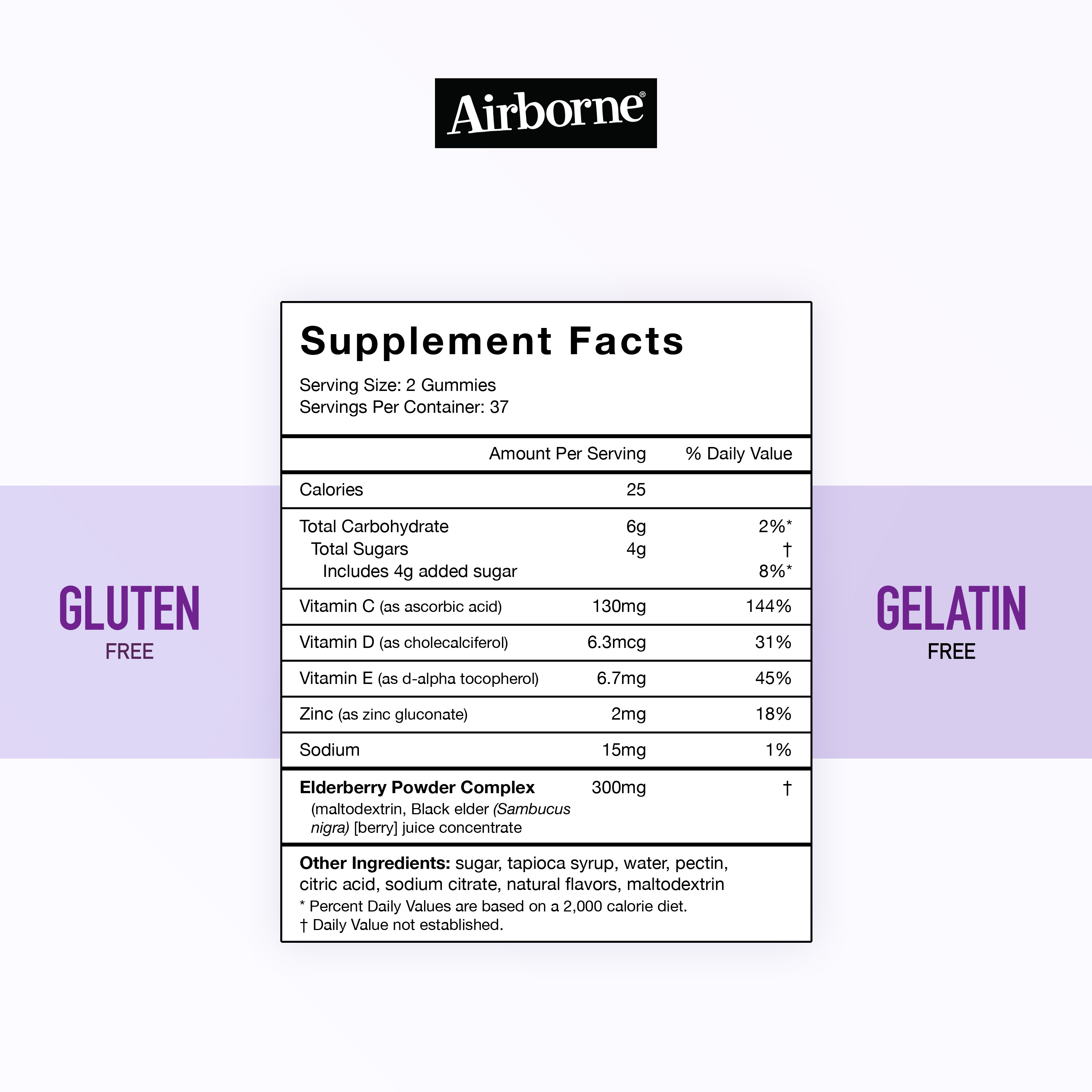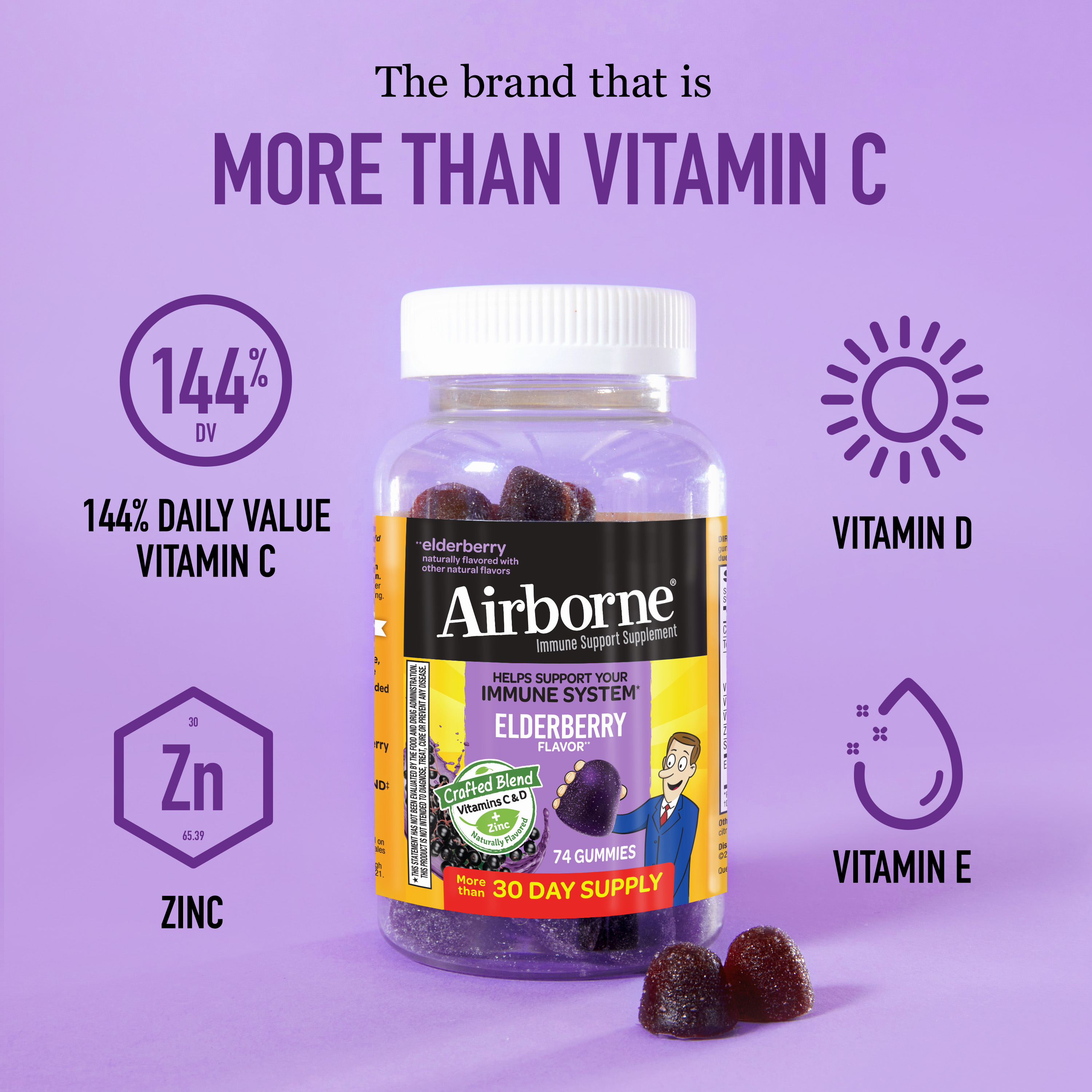- VITAMIN C: Not all immune support gummies are created equal – and these stand out for good reason! These Airborne Elderberry flavored gummies are packed with 200% of your daily value of Vitamin C per serving (whoa!).