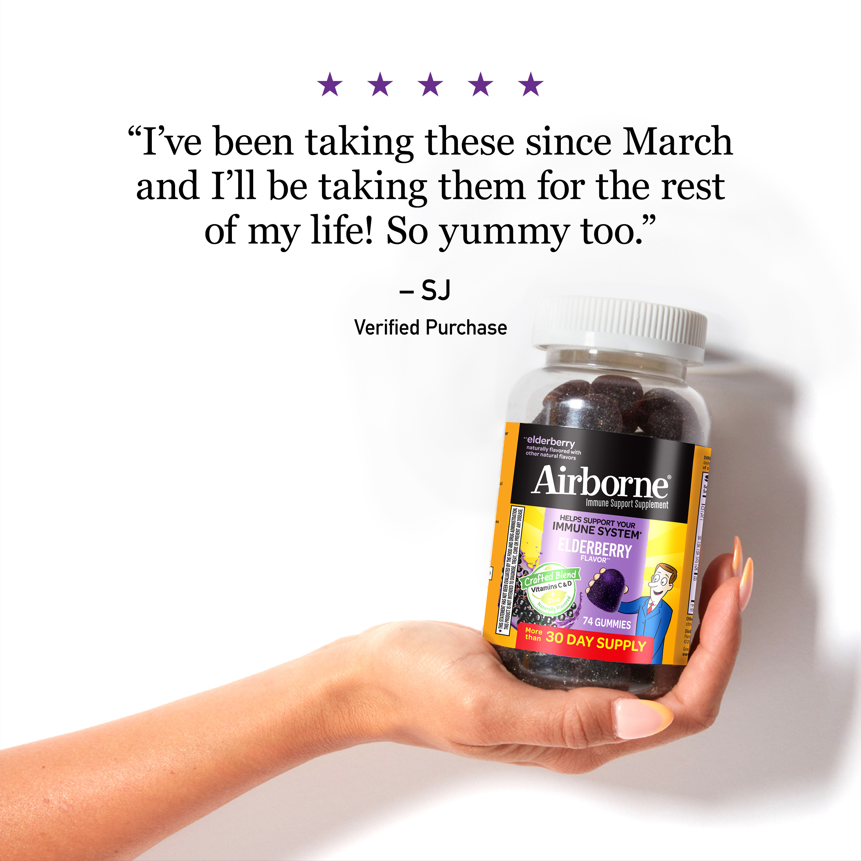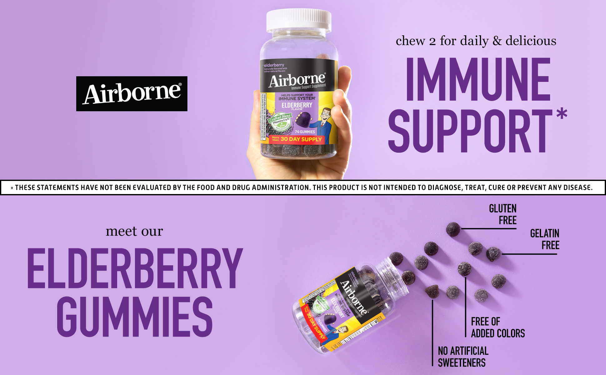 - AIRBORNE ELDERBERRY GUMMIES (+ ZINC & VITAMIN C): Daily immune support* full of benefits, bursting with flavor and oh-so seriously delicious? Yep, THIS. IS. IT!
