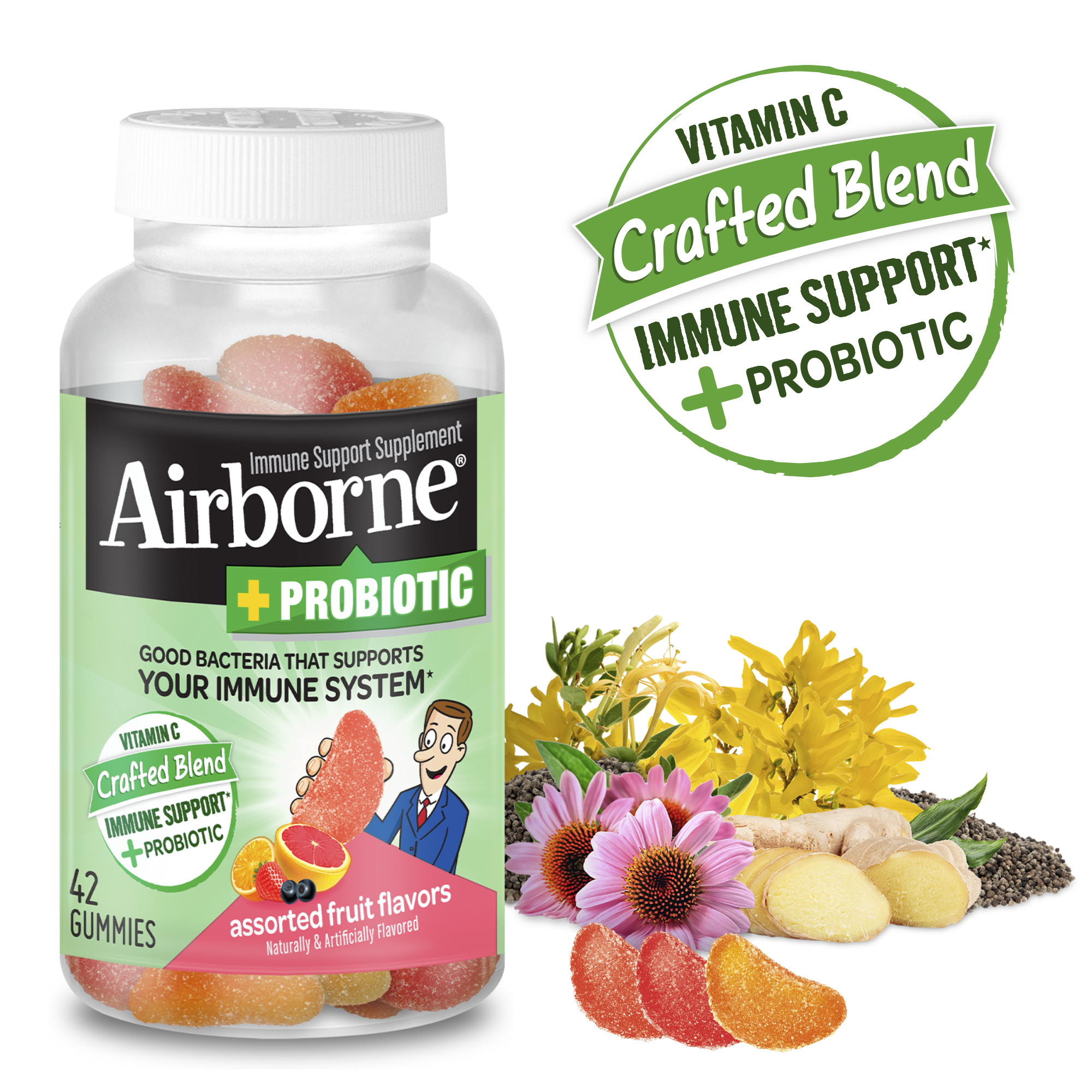 | Product Description | Airborne Plus probiotic Gummies help support your immune system with a specially crafted blend of vitamin C and 9 other vitamins, minerals & Herbs, plus a probiotic to balance the good bacteria in your intestine. Did you know that 70% of your immune system lives in your gut. Take the immune support Supplement that packs 750mg of Vitamin C plus a probiotic and 9 other vitamins, minerals and herbs to promote immune health.