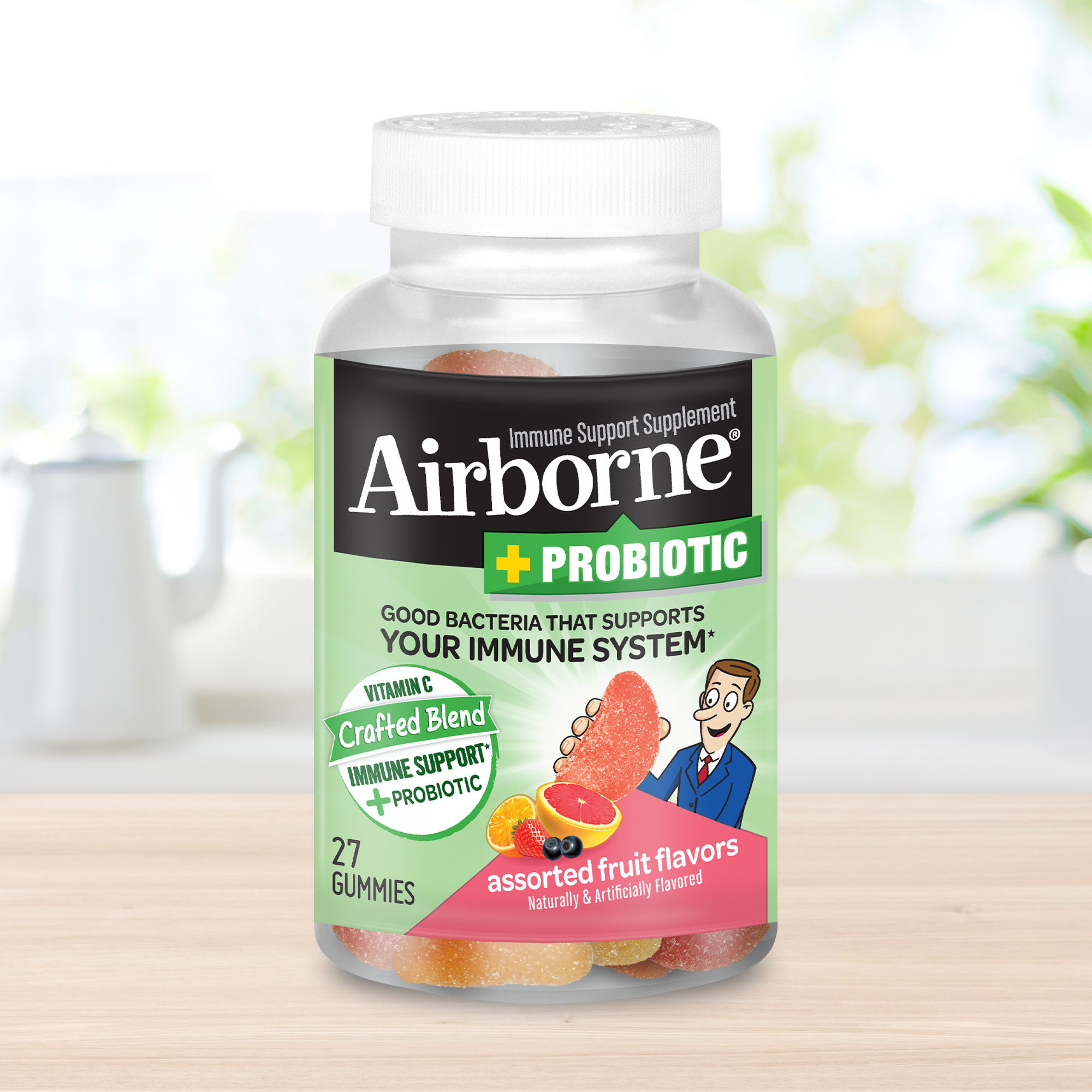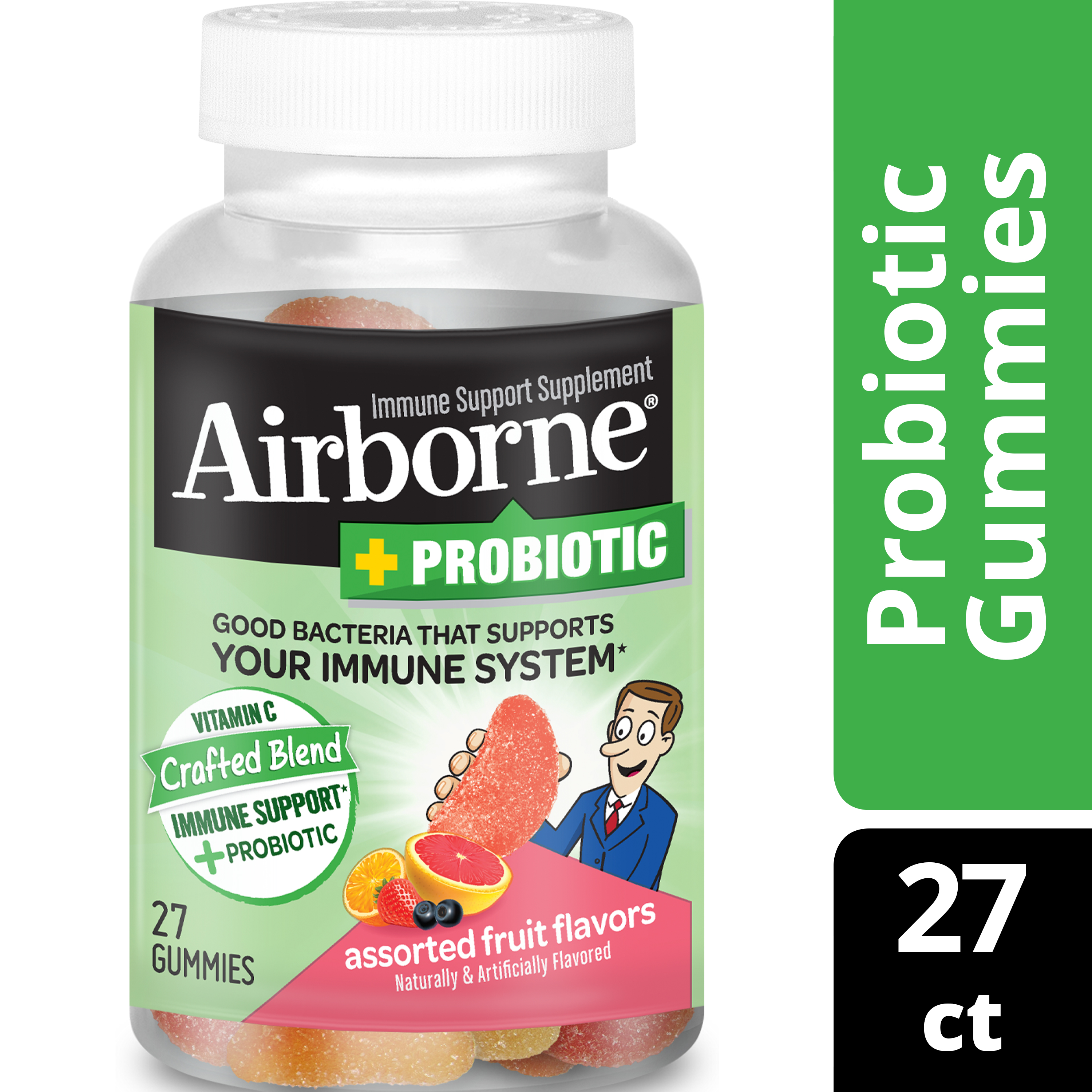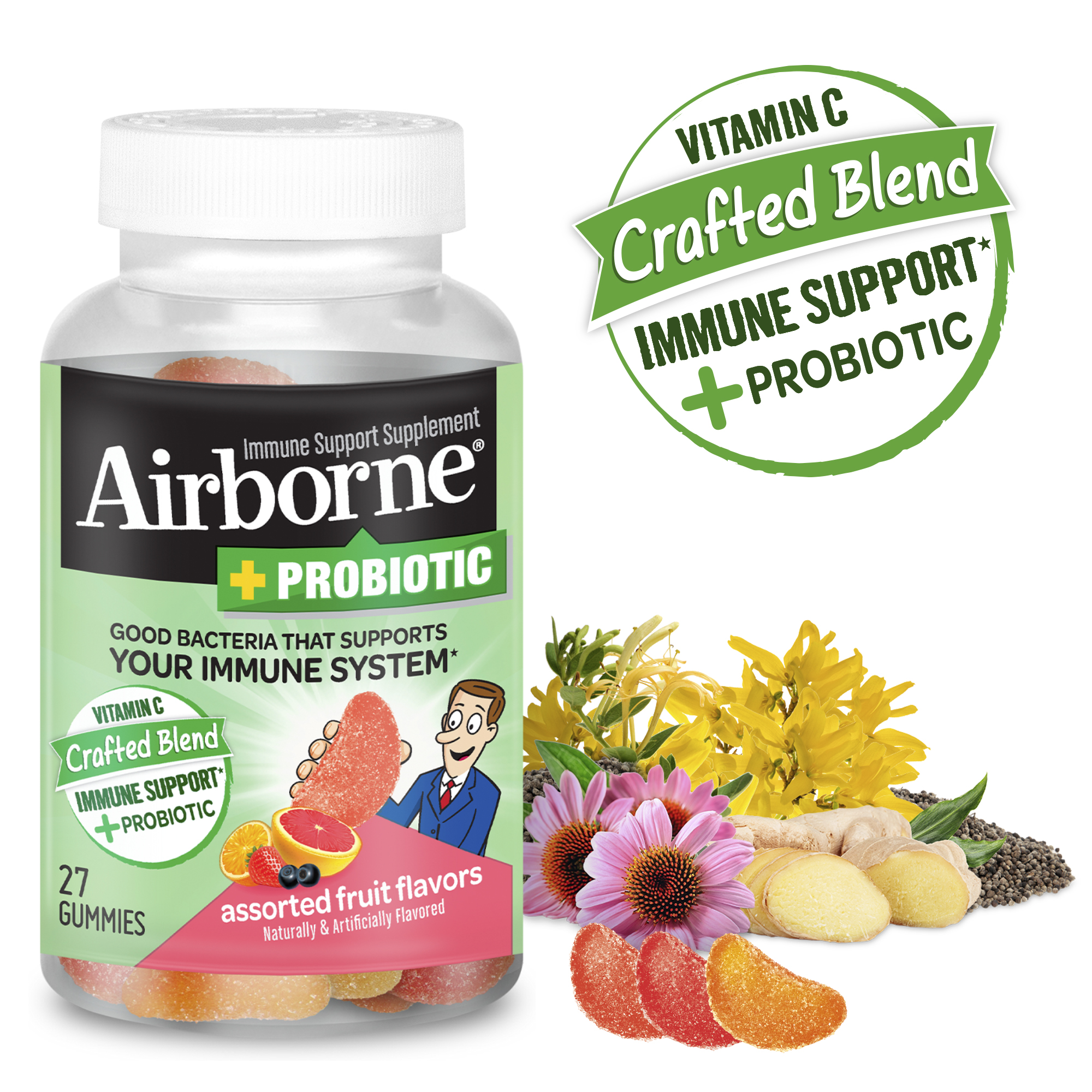| Product Description | Airborne Plus Probiotic gummies help support your immune system with a specially crafted blend of Vitamin C and 9 other vitamins, minerals & herbs, PLUS a Probiotic to balance the good bacteria in your intestine.* Did you know that 70% of your immune system lives in your gut. Take the Immune Support Supplement that packs 750mg of Vitamin C plus a Probiotic and 9 other vitamins, minerals and herbs to promote immune health.