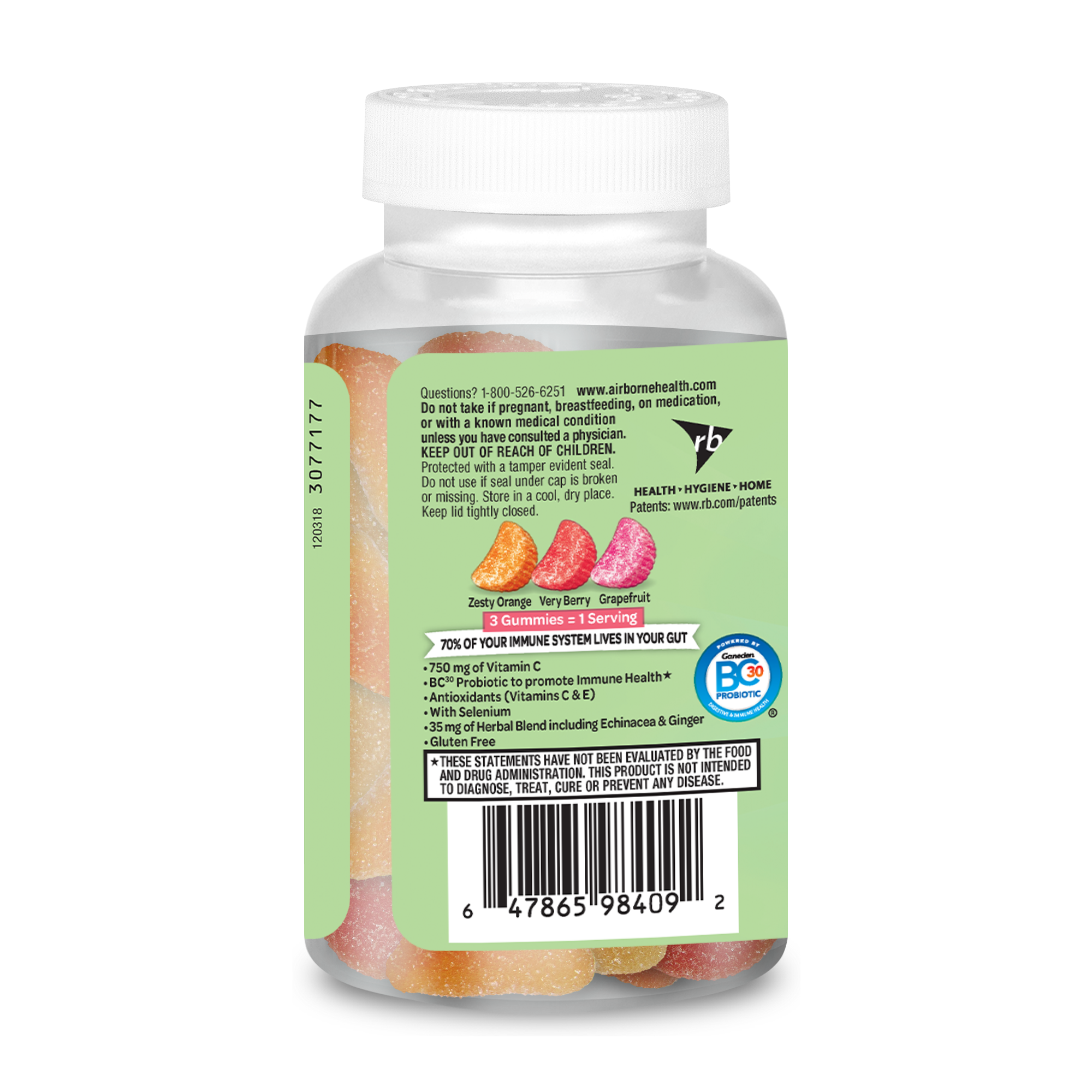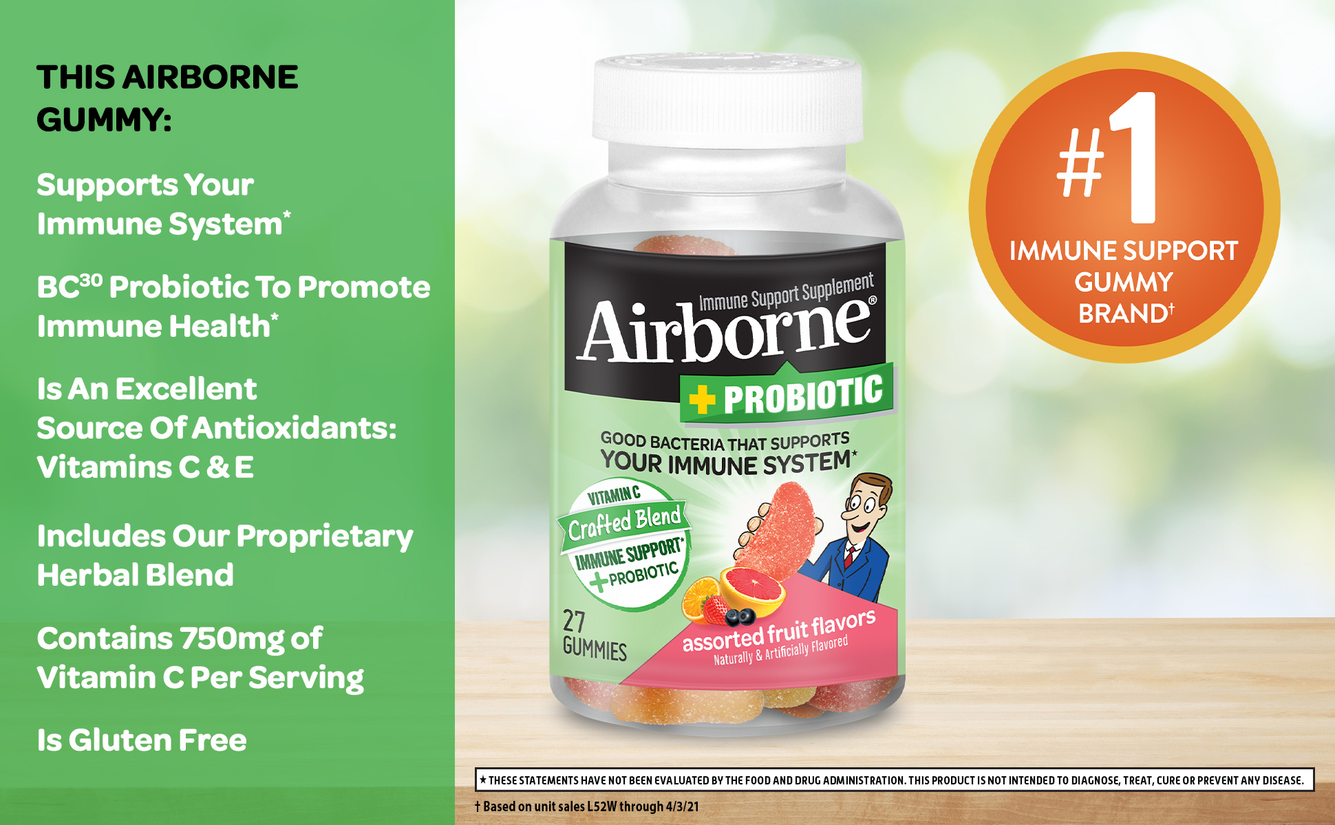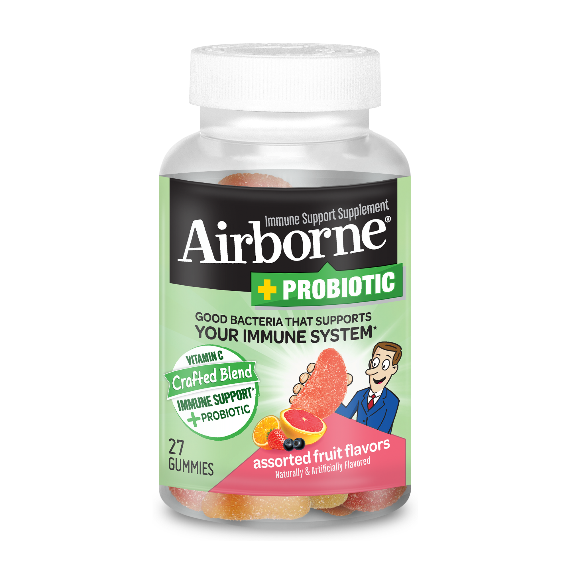 | Product Description | Airborne Plus Probiotic gummies help support your immune system with a specially crafted blend of Vitamin C and 9 other vitamins, minerals & herbs, PLUS a Probiotic to balance the good bacteria in your intestine.* Did you know that 70% of your immune system lives in your gut. Take the Immune Support Supplement that packs 750mg of Vitamin C plus a Probiotic and 9 other vitamins, minerals and herbs to promote immune health.
