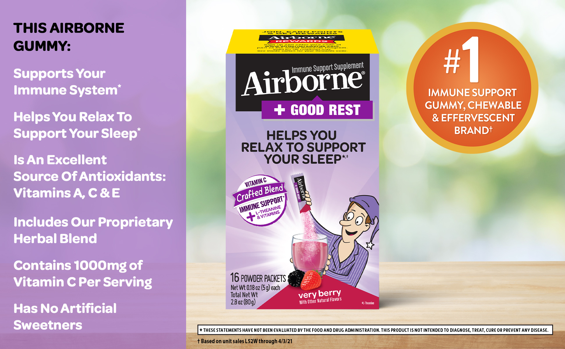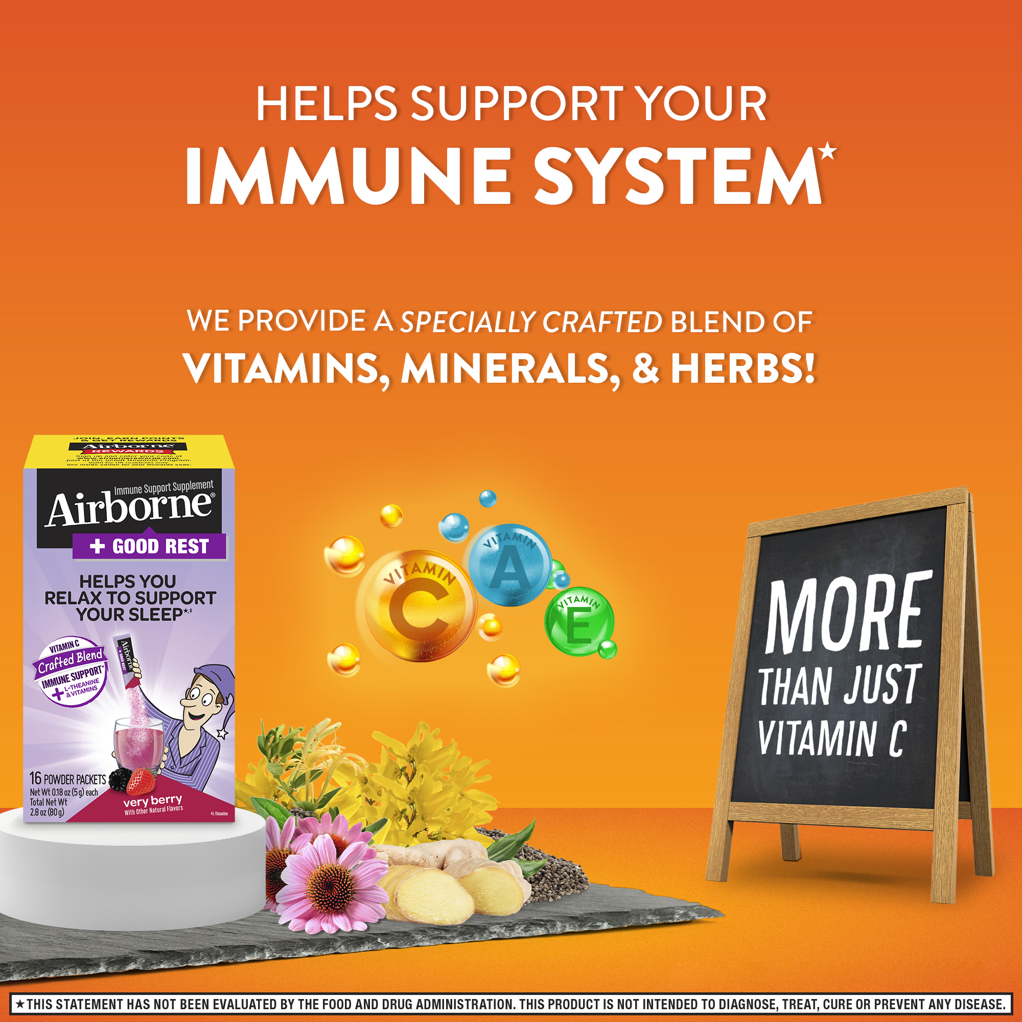 - WHY TO TAKE AIRBORNE: Airborne is the #1 Immune Support Gummy, Effervescent & Chewable Brand.¹ This powder is easy to take on the go or when you want to relax. Vitamin C is among the most important vitamin and antioxidant in immune health.*