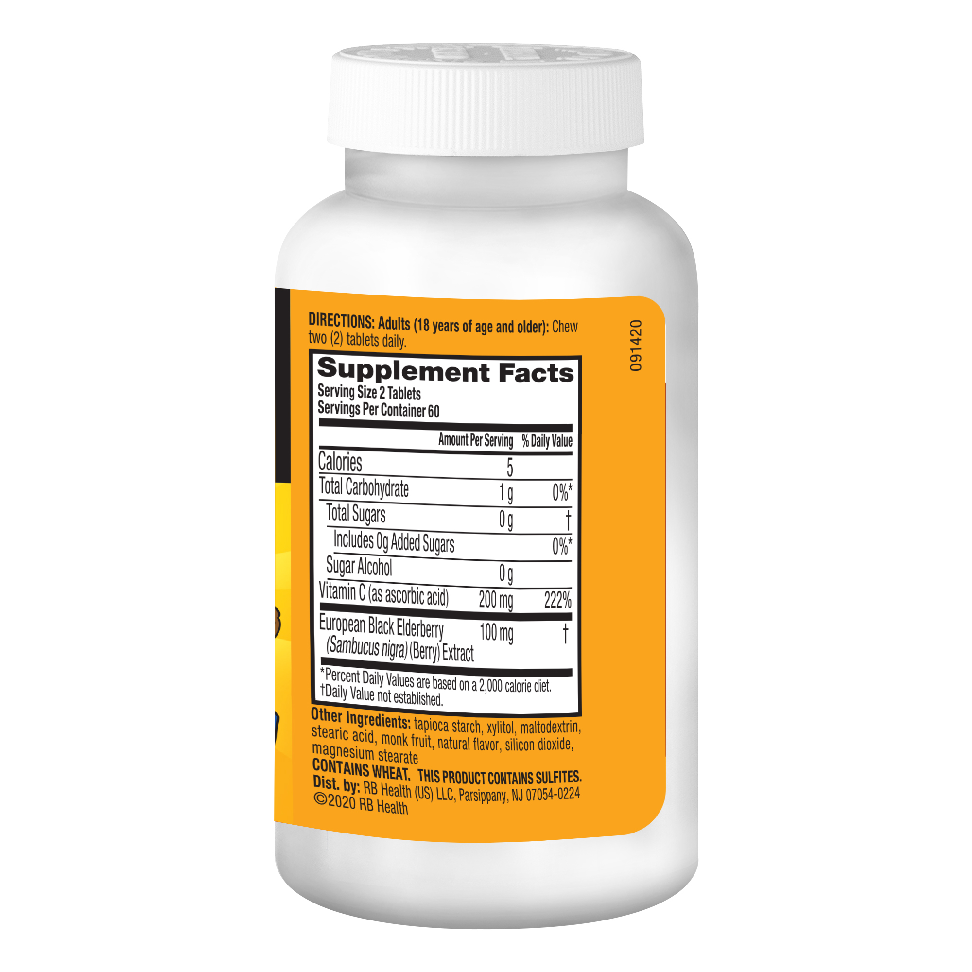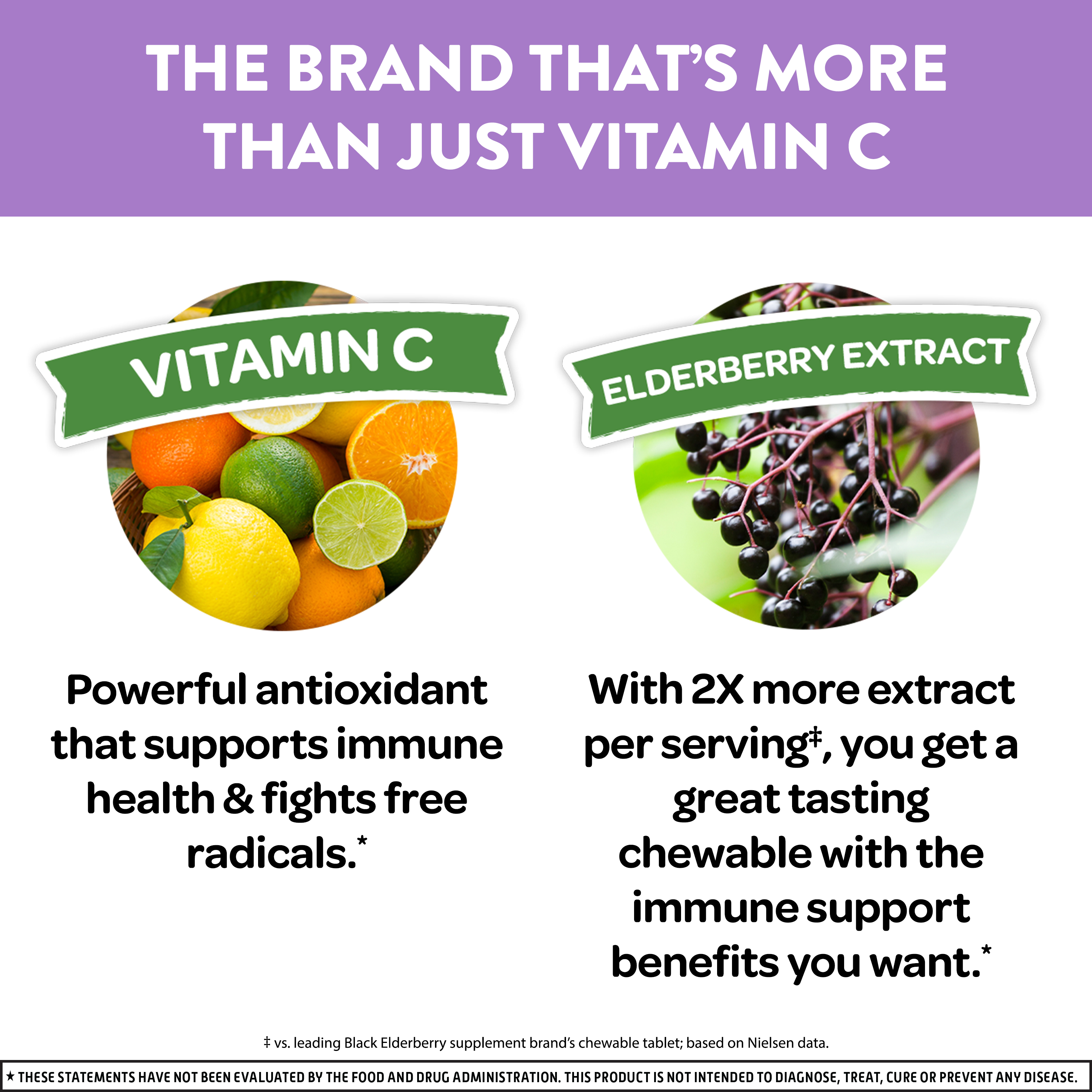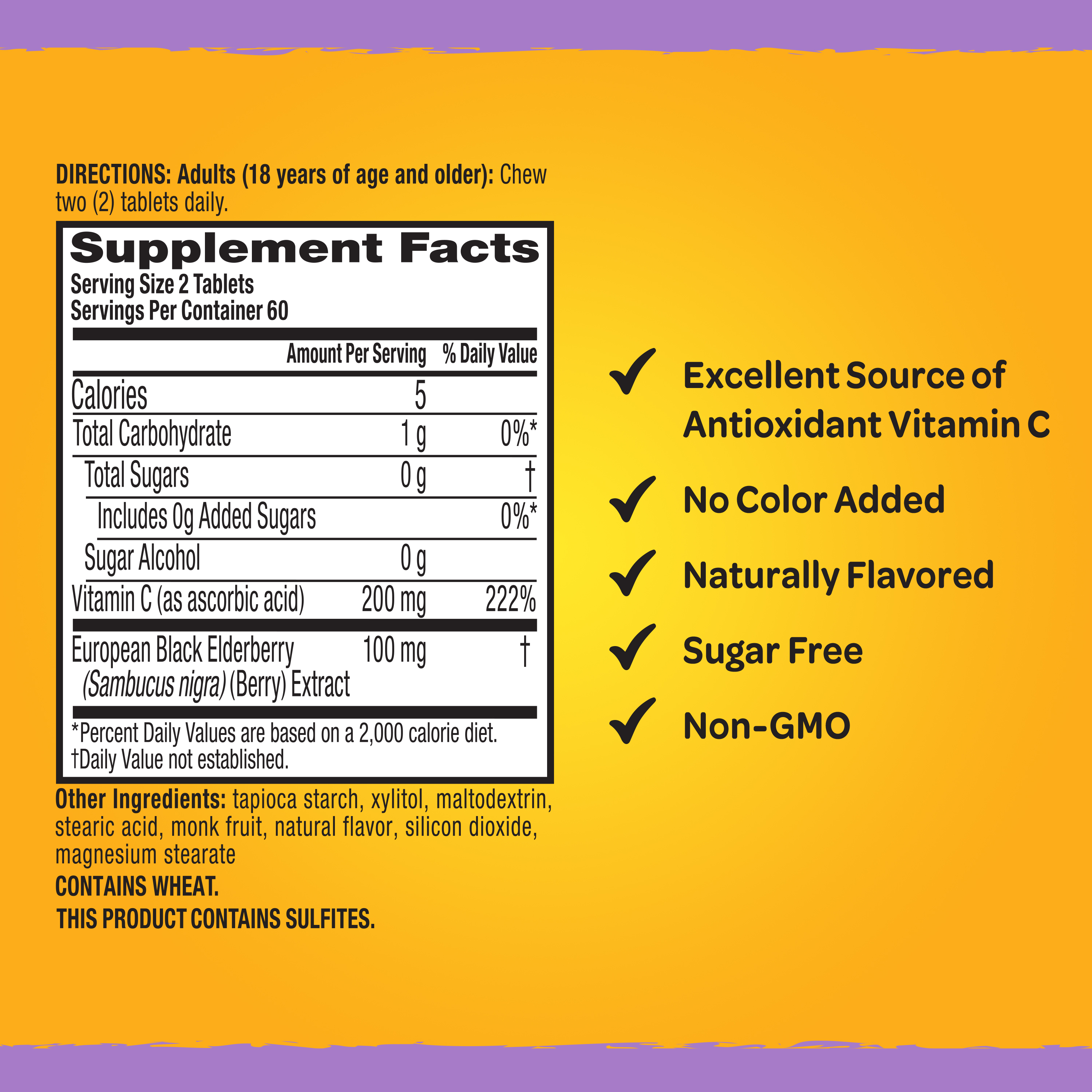 - POWERFUL IMMUNE SUPPORT*: One serving (2 chewable tablets) provide 200mg of Vitamin C, and 100mg of Elderberry Extract! Pretty amazing, huh?
