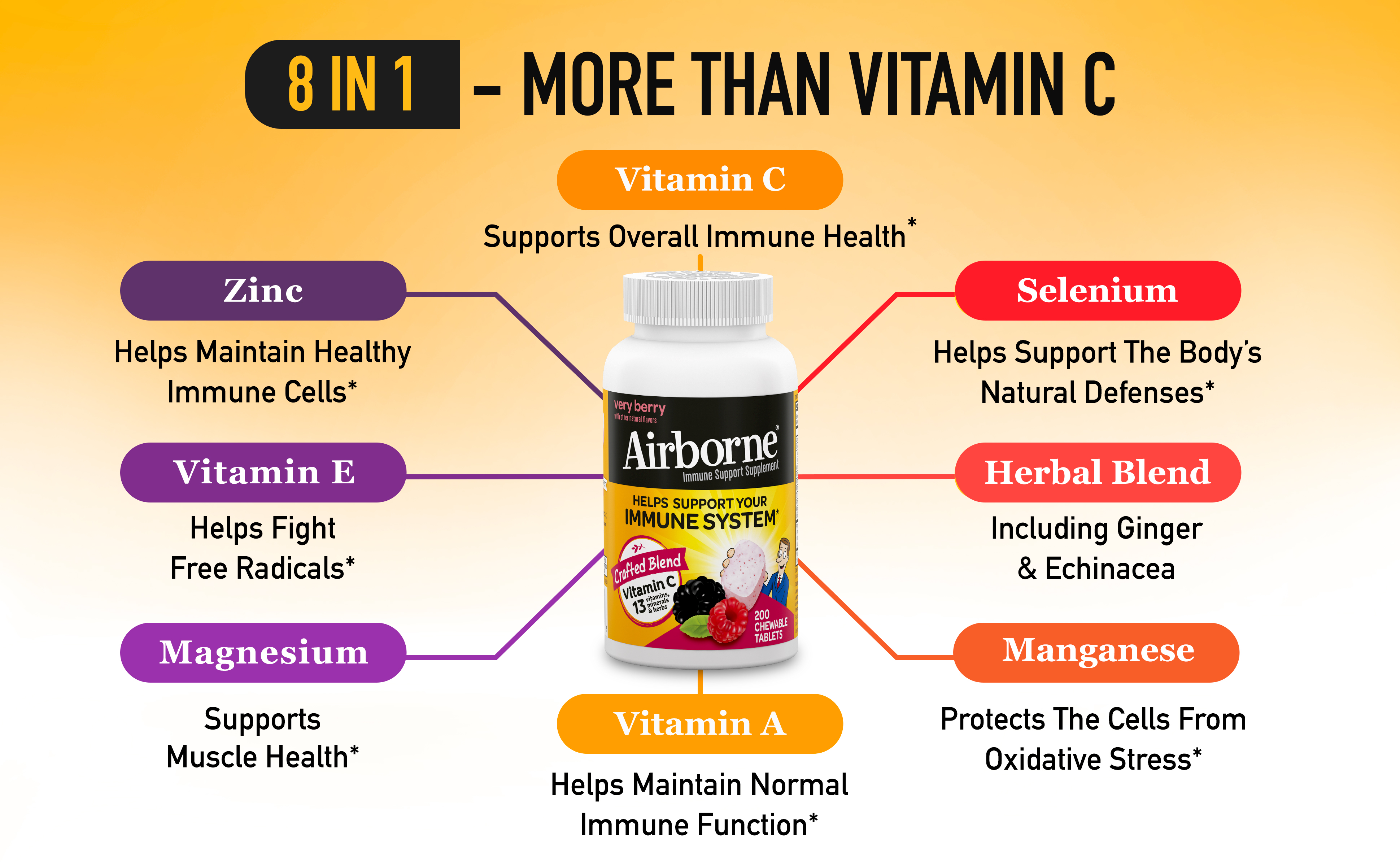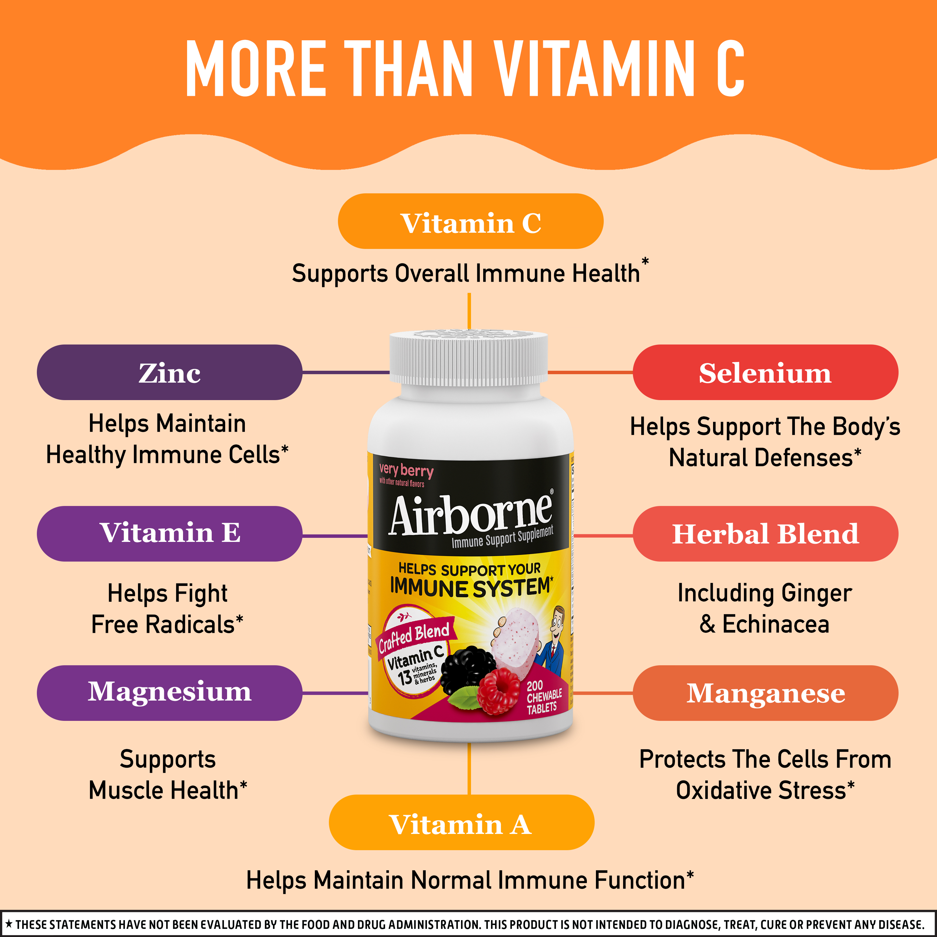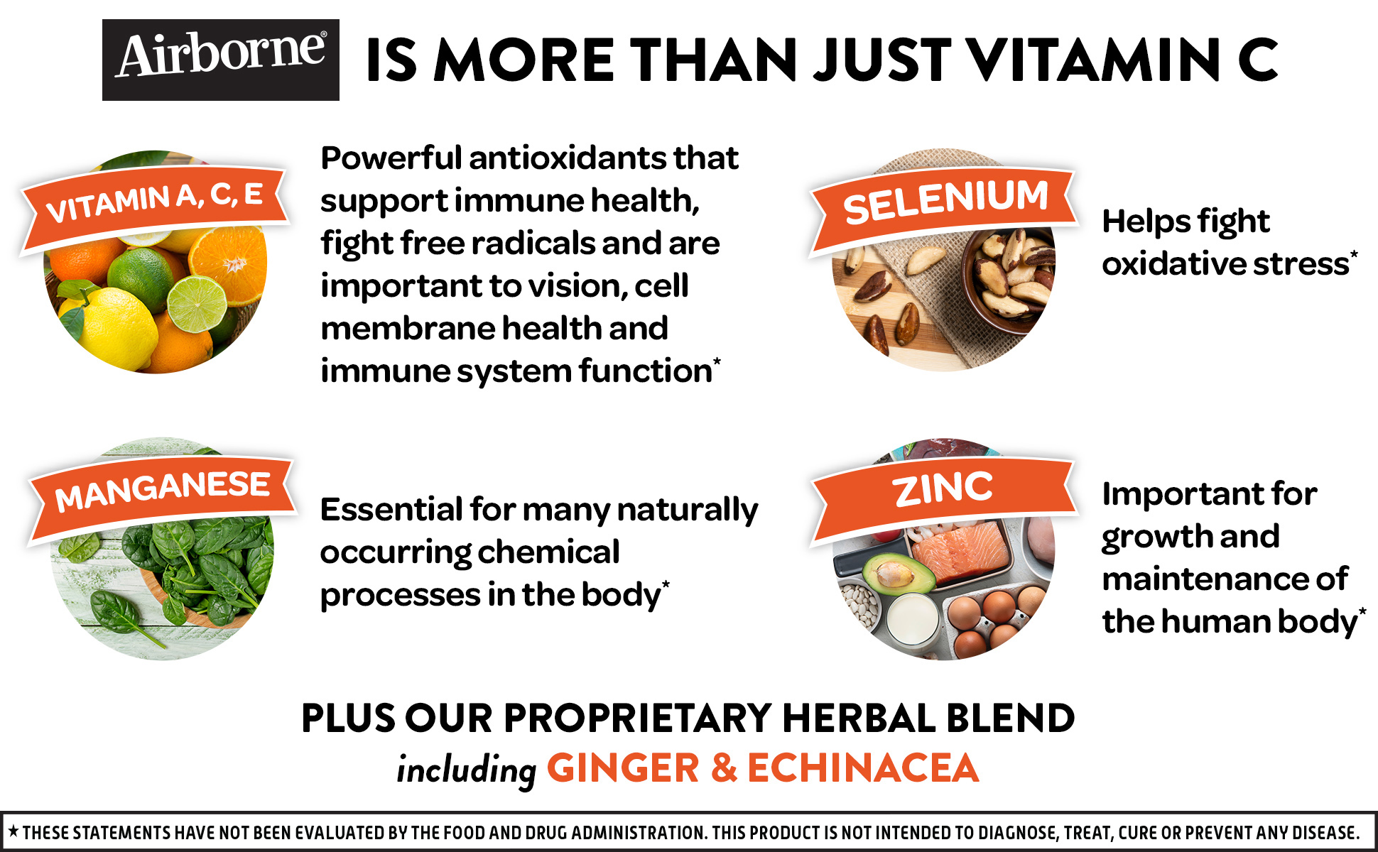 - VITAMIN C 1000mg: Airborne Vitamin C chewable Zinc tablets are packed with 1000mg Vitamin C per serving, which helps support your immune system.*