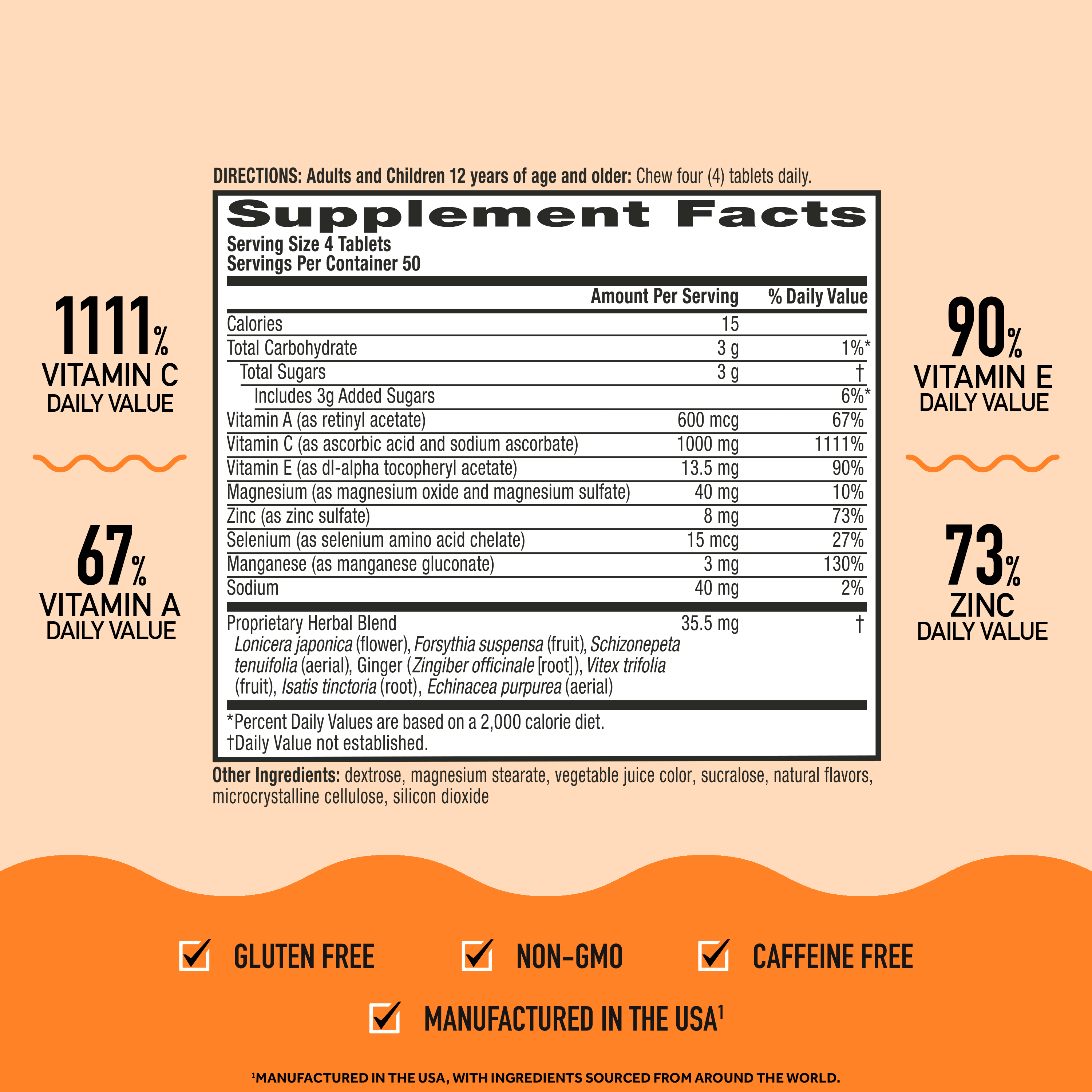 - ZINC SUPPLEMENT: These Chewable Vitamin C with Zinc tablets contain 73% of your daily value of Zinc, which plays a central role in your immune system and is essential for the functioning and signaling of immune cells.*
