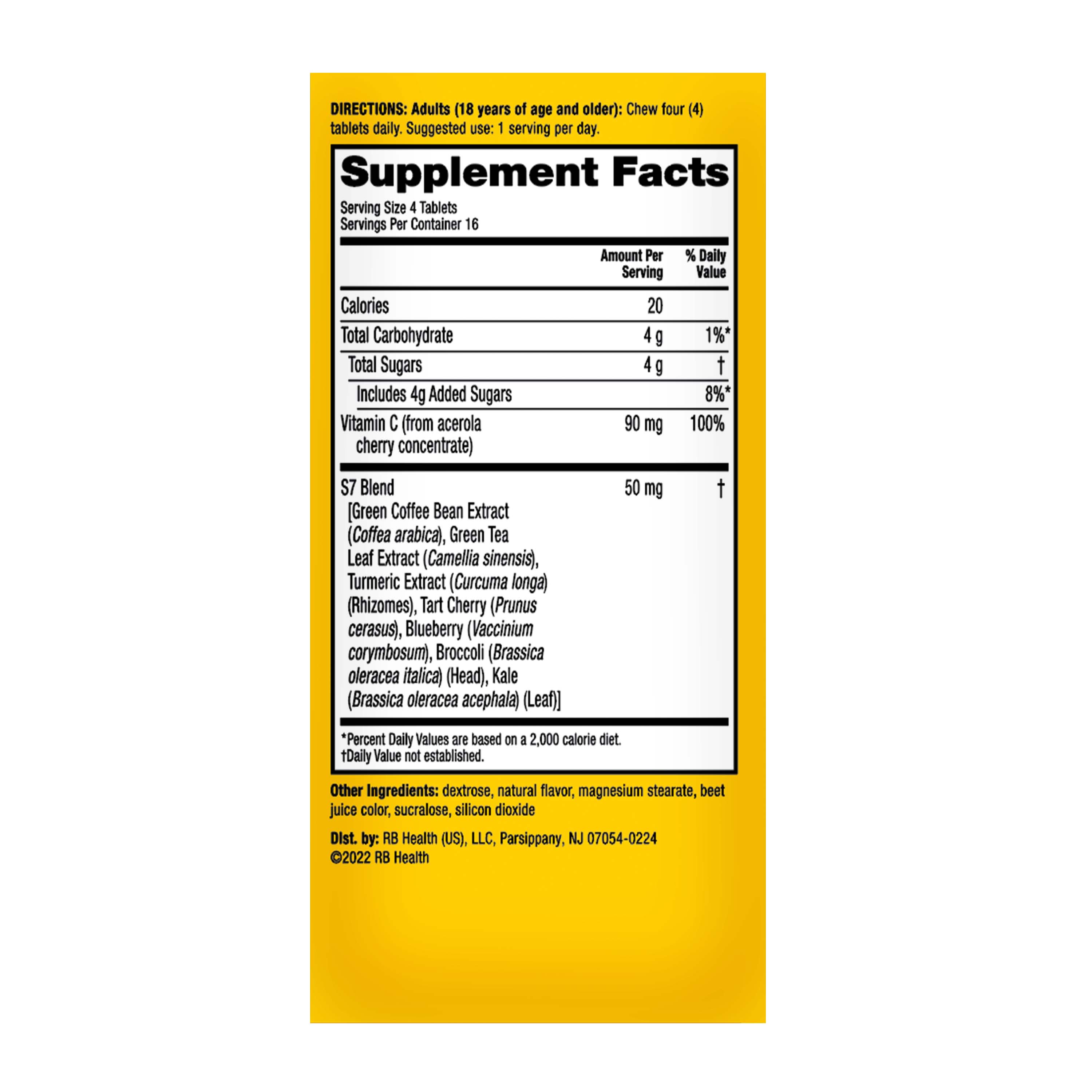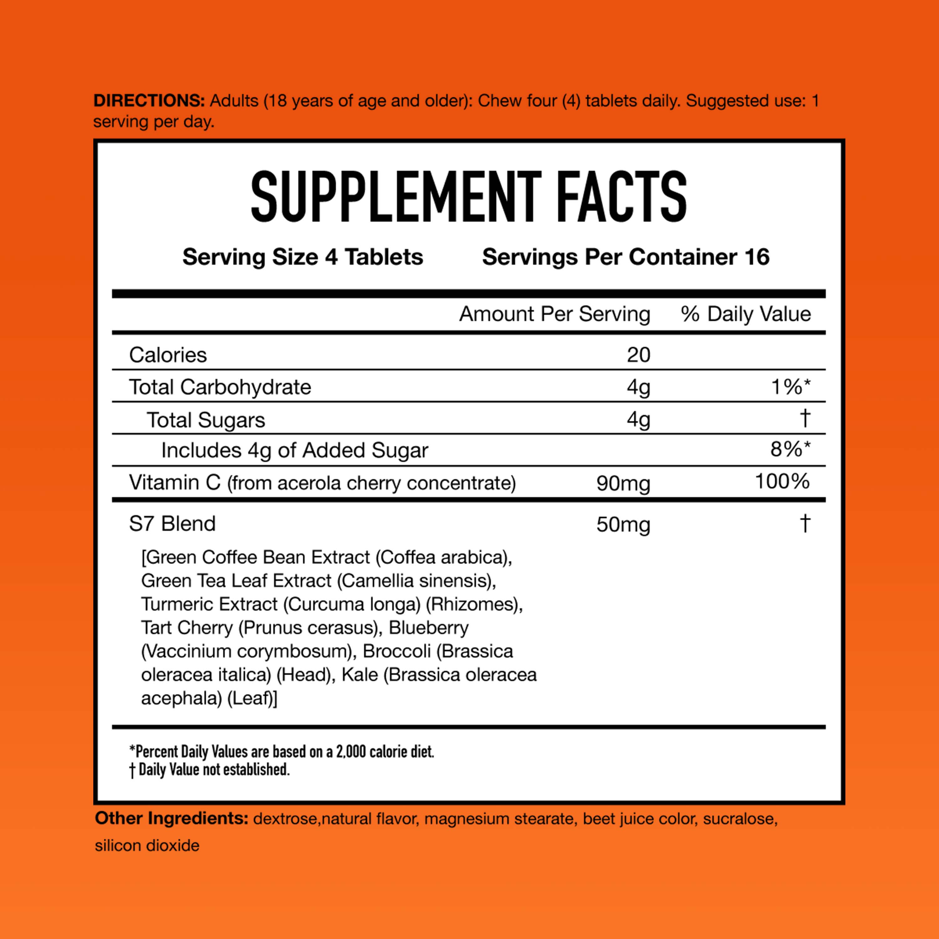 - HOW TO ENJOY: Adults (18 years of age and older): Chew four (4) tablets daily. Suggested use: 1 serving per day. One serving of (4) chewable tablets provides 100% of your daily value of VITAMIN C!