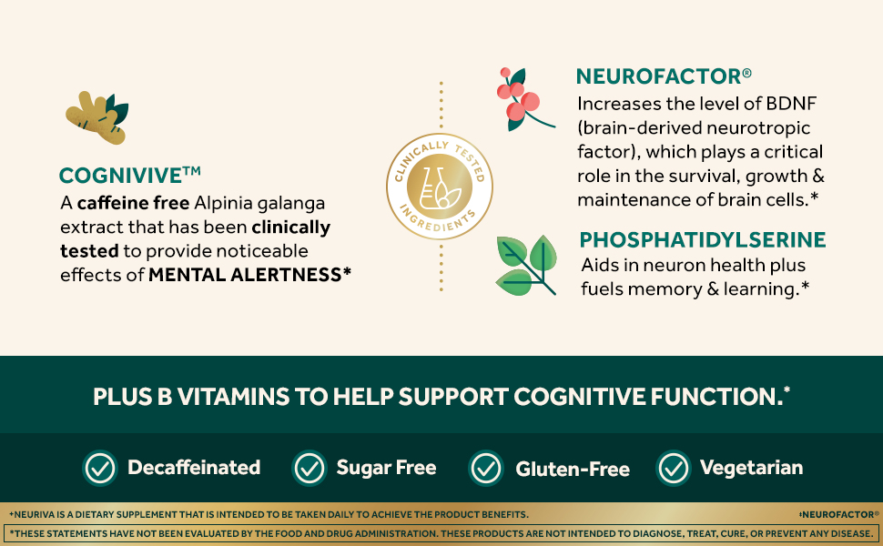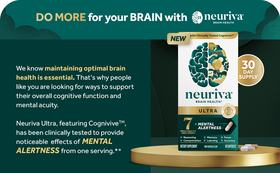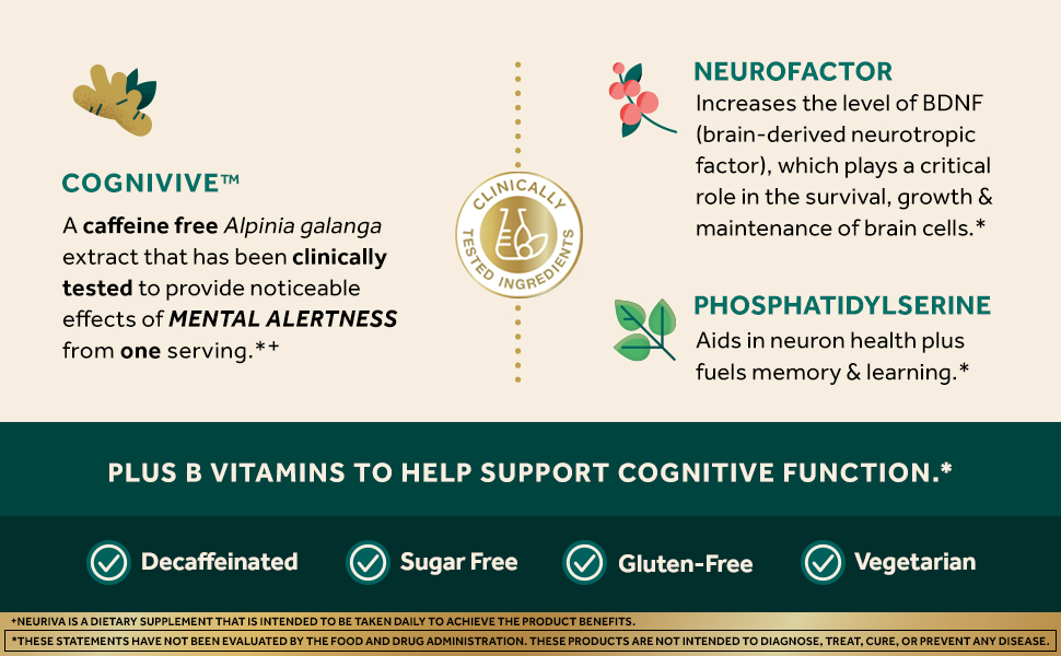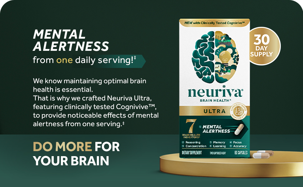 - BRAIN HEALTH SUPPORT FOR ADULTS: Neuriva Ultra contains clinically tested, naturally sourced, ingredients like as CogniviveTM, NeurofactorTM plus Phosphatidylserine, and B Vitamins which, together, promote cognitive function and support memory and focus.*