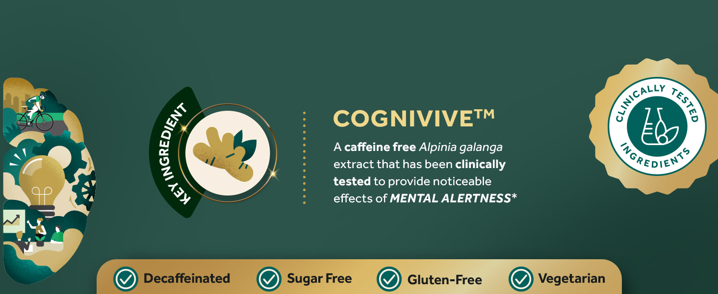 - MENTAL ALERTNESS* WITH COGNIVIVETM: A caffeine free Alpinia galanga extract that provides noticeable effects of Mental Alertness from just one serving.*