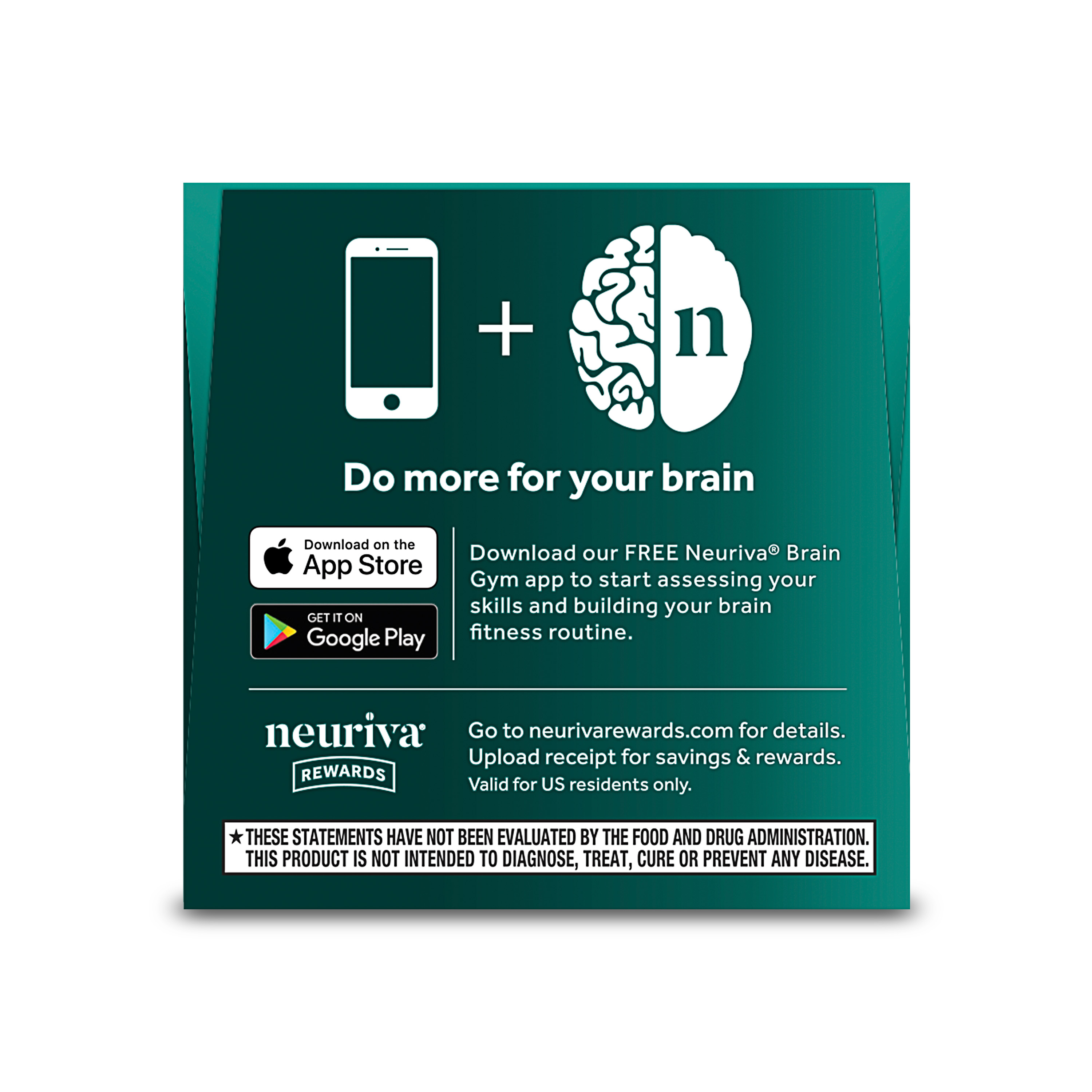 - +Neuriva is a dietary supplement that is intended to be taken daily to achieve the product benefits. *These statements have not been evaluated by the Food and Drug Administration. This product is not intended to diagnose, treat, cure or prevent any disease.