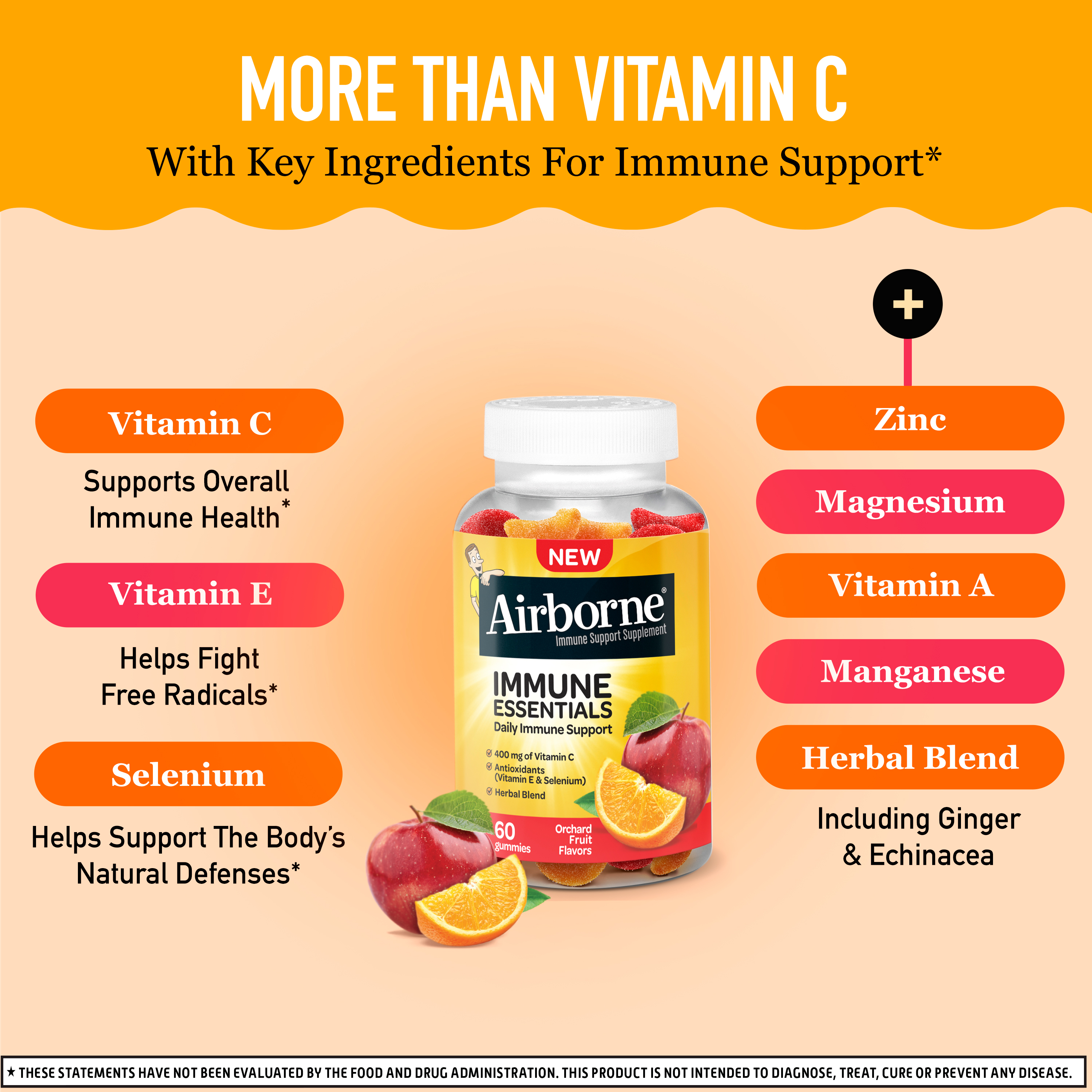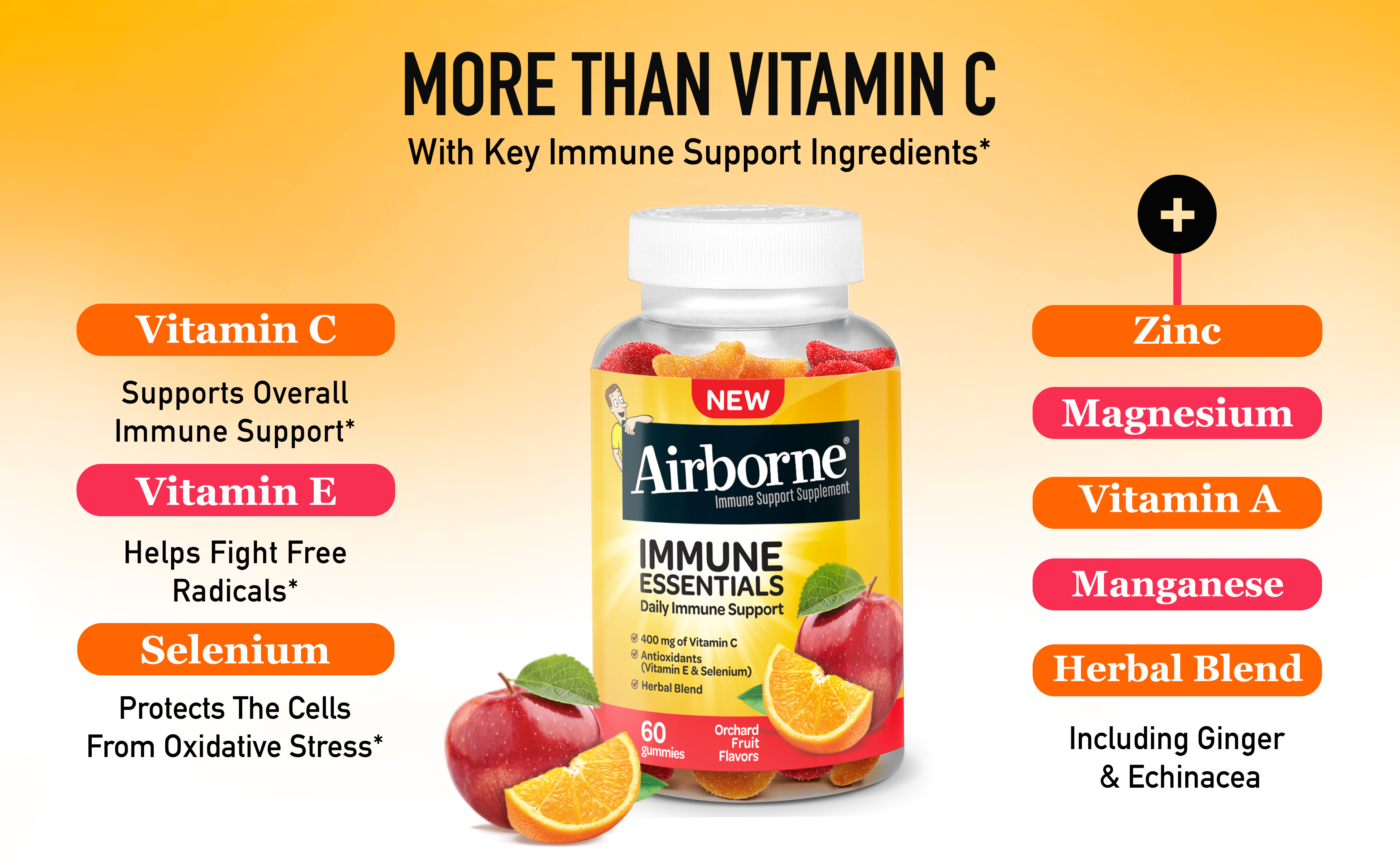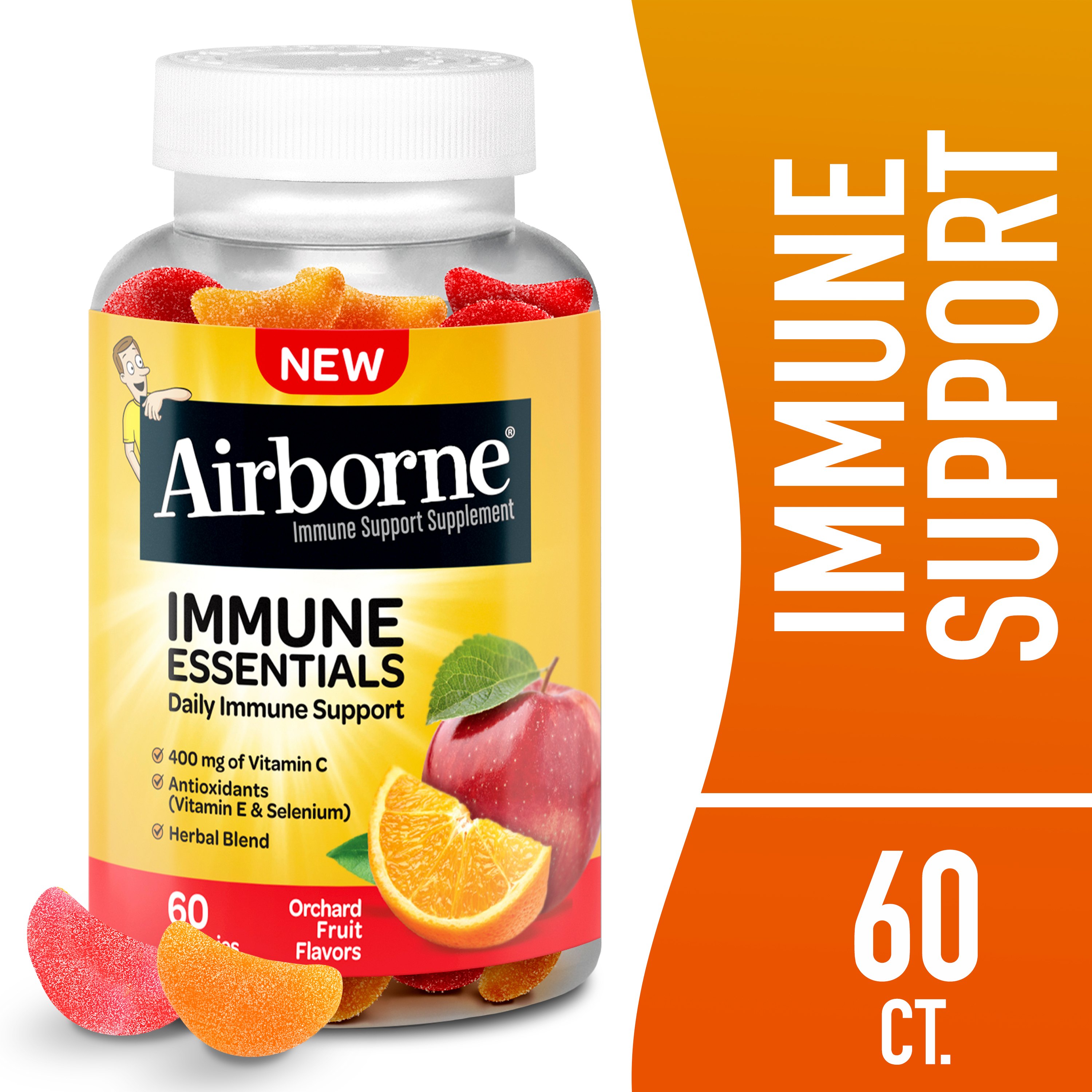 - GRAB & GO GUMMIES: Airborne’s Immune Essentials Gummies are an easy way to put your well-being first and support your immune system.* Chew three daily – whether at home or while on the go!