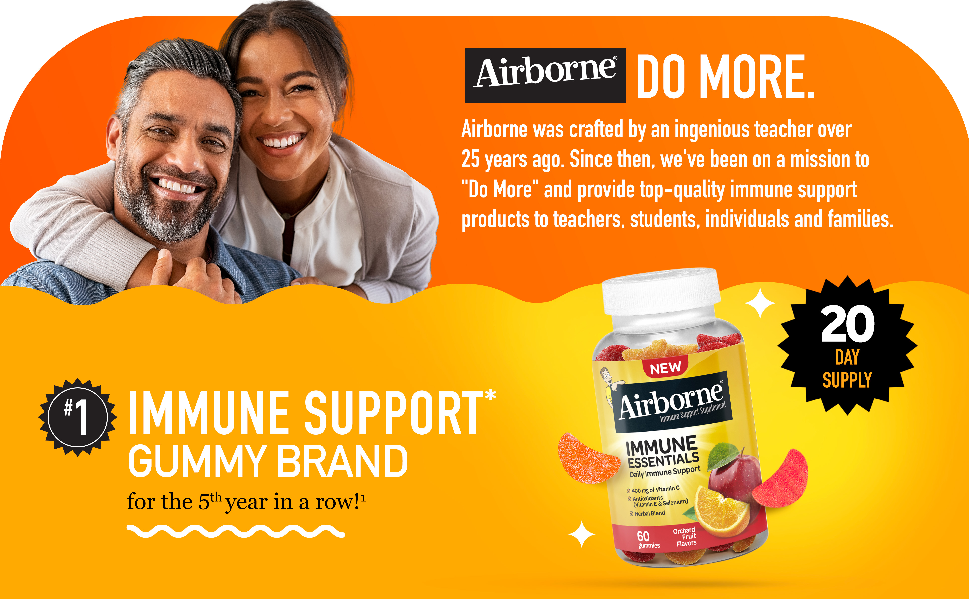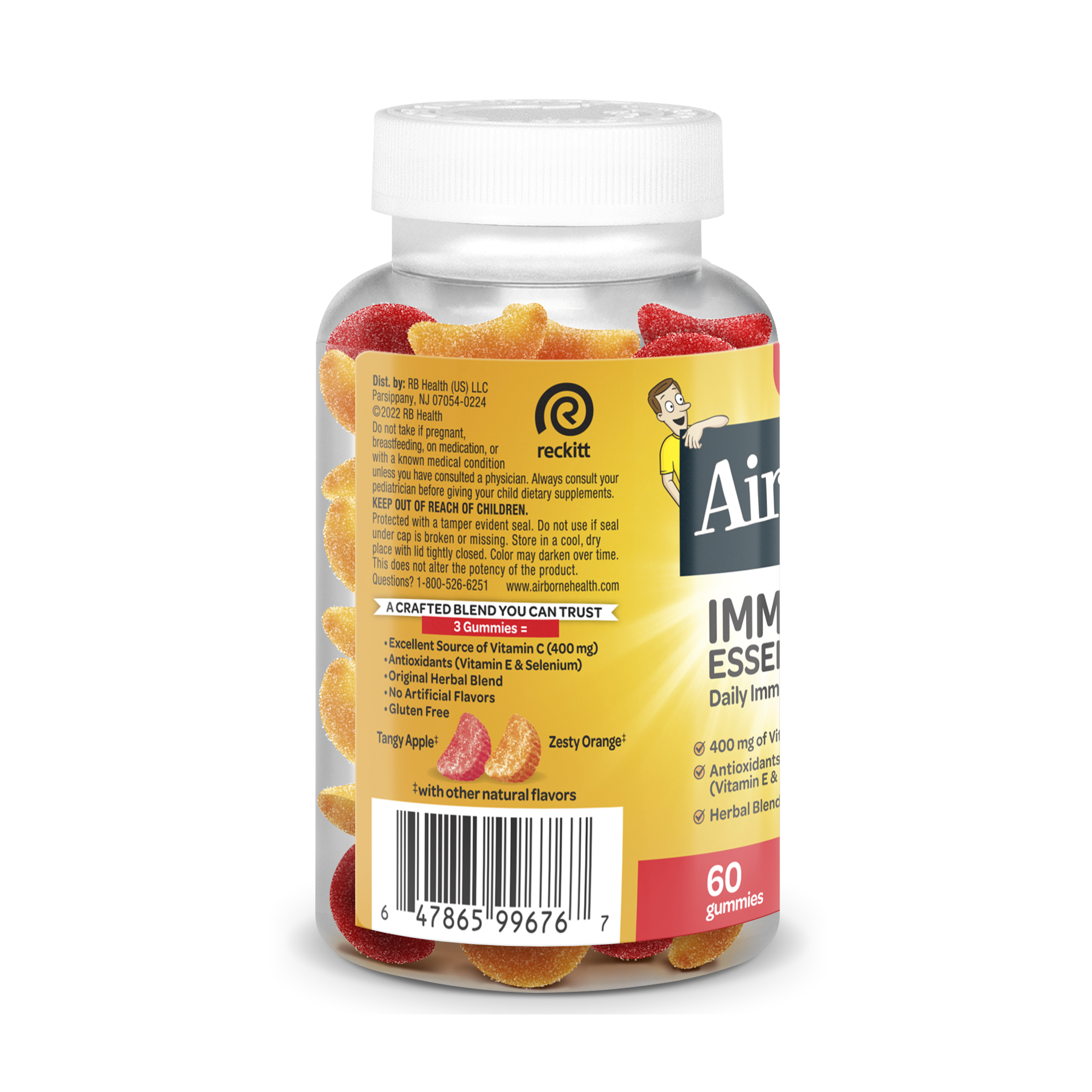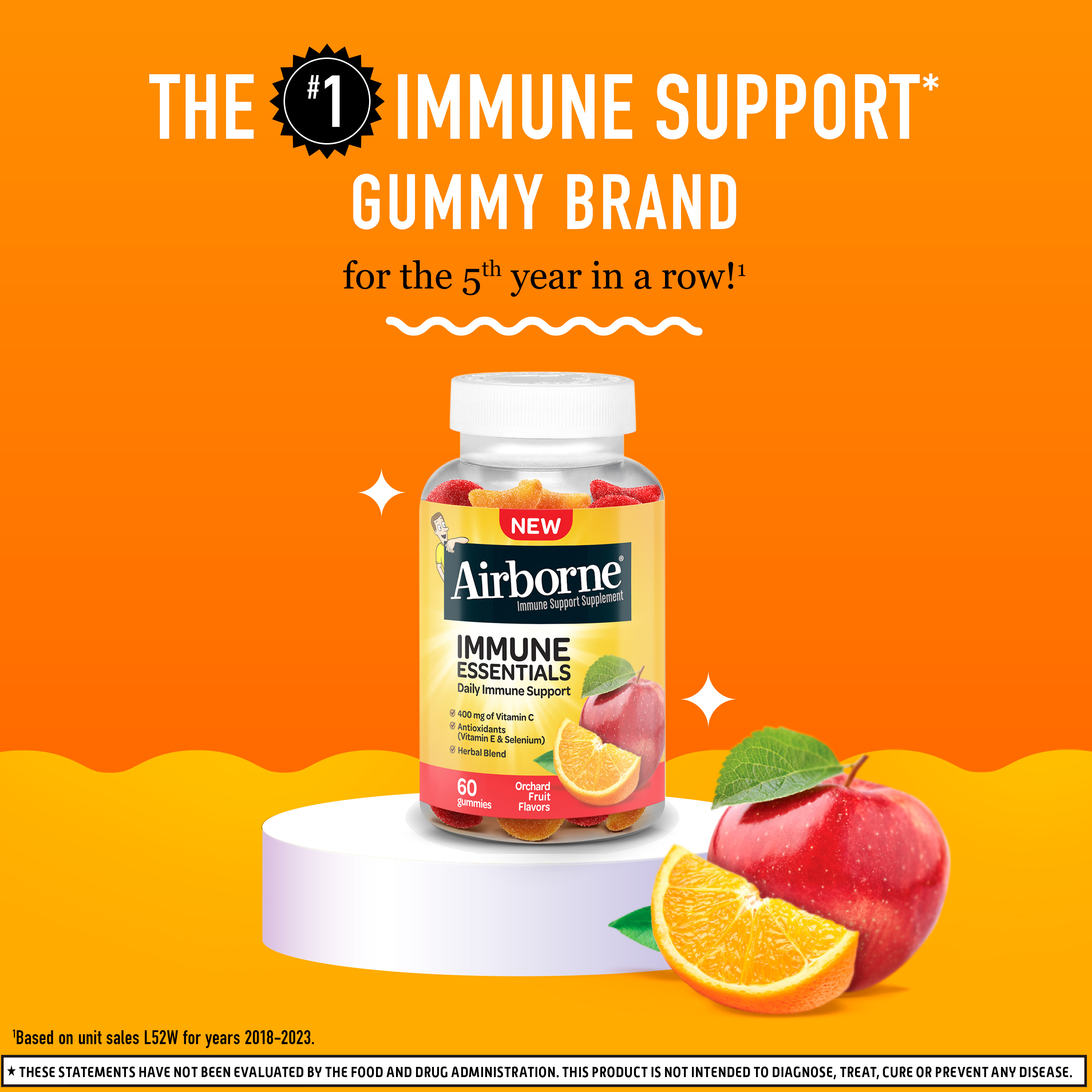 - GRAB & GO GUMMIES: Airborne’s Immune Essentials Gummies are an easy way to put your well-being first and support your immune system.* Chew three daily – whether at home or while on the go!
