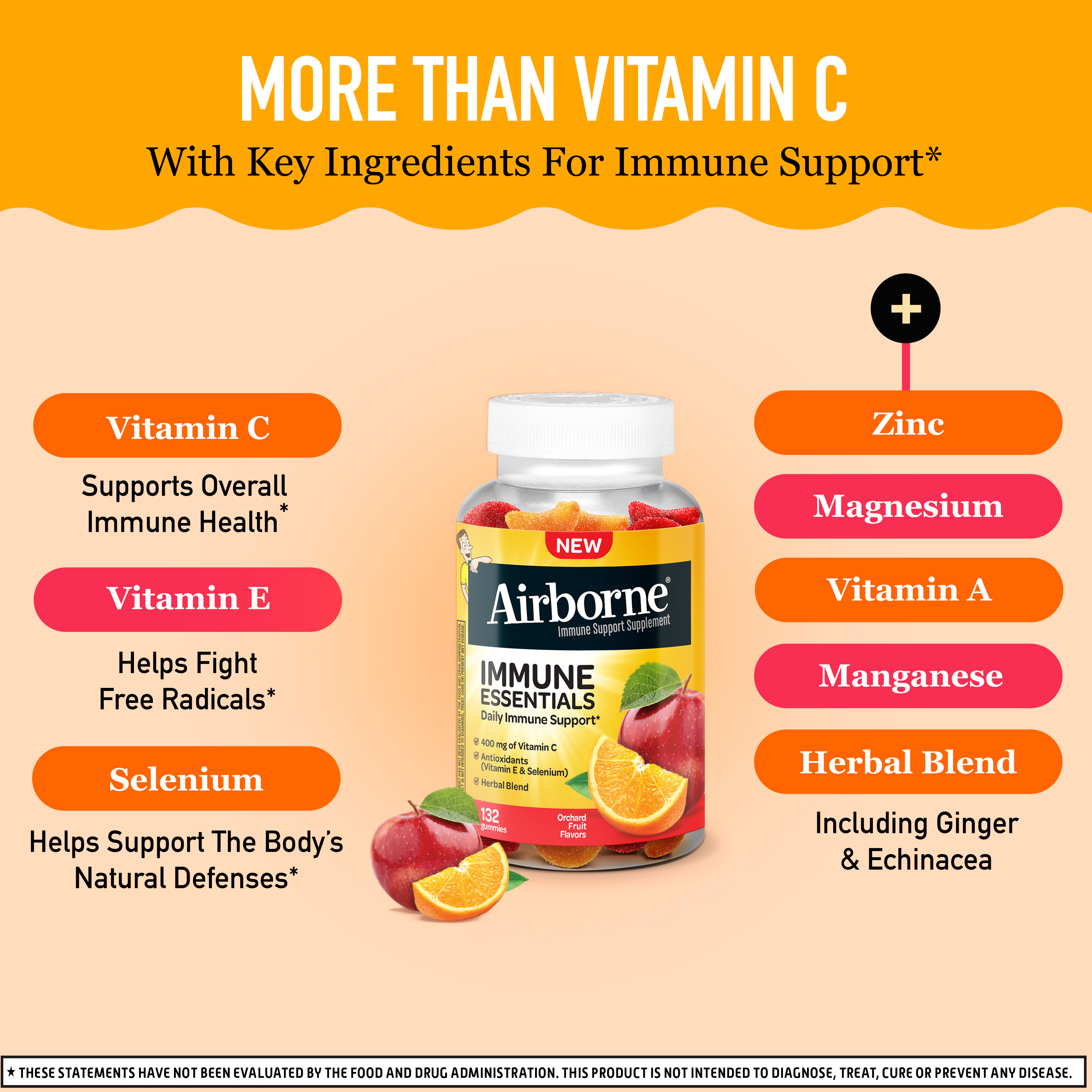 - YOUR GO-TO IMMUNE SUPPORT SUPPLEMENT: Airborne Immune Essentials Gummies offer daily immune support with vitamins like C, E and antioxidant Selenium. In addition, each serving has our proprietary herbal blend.*