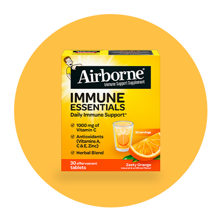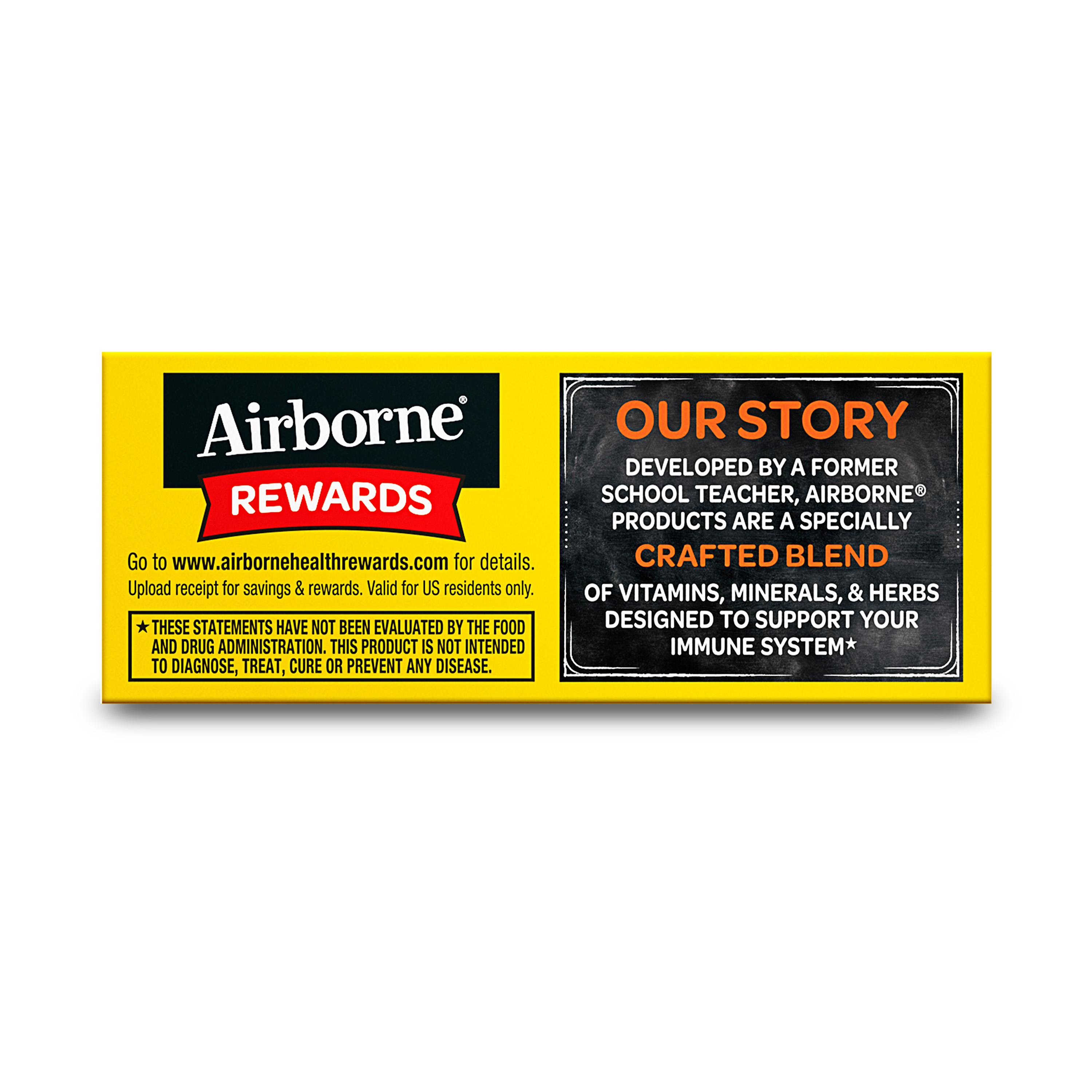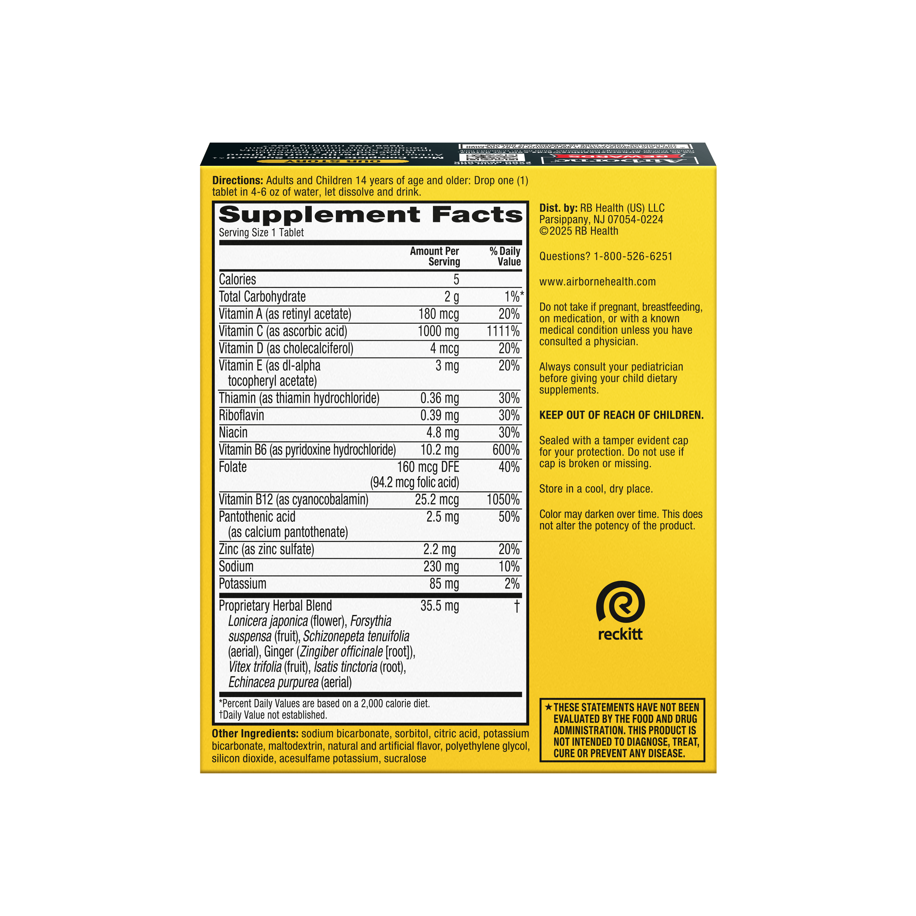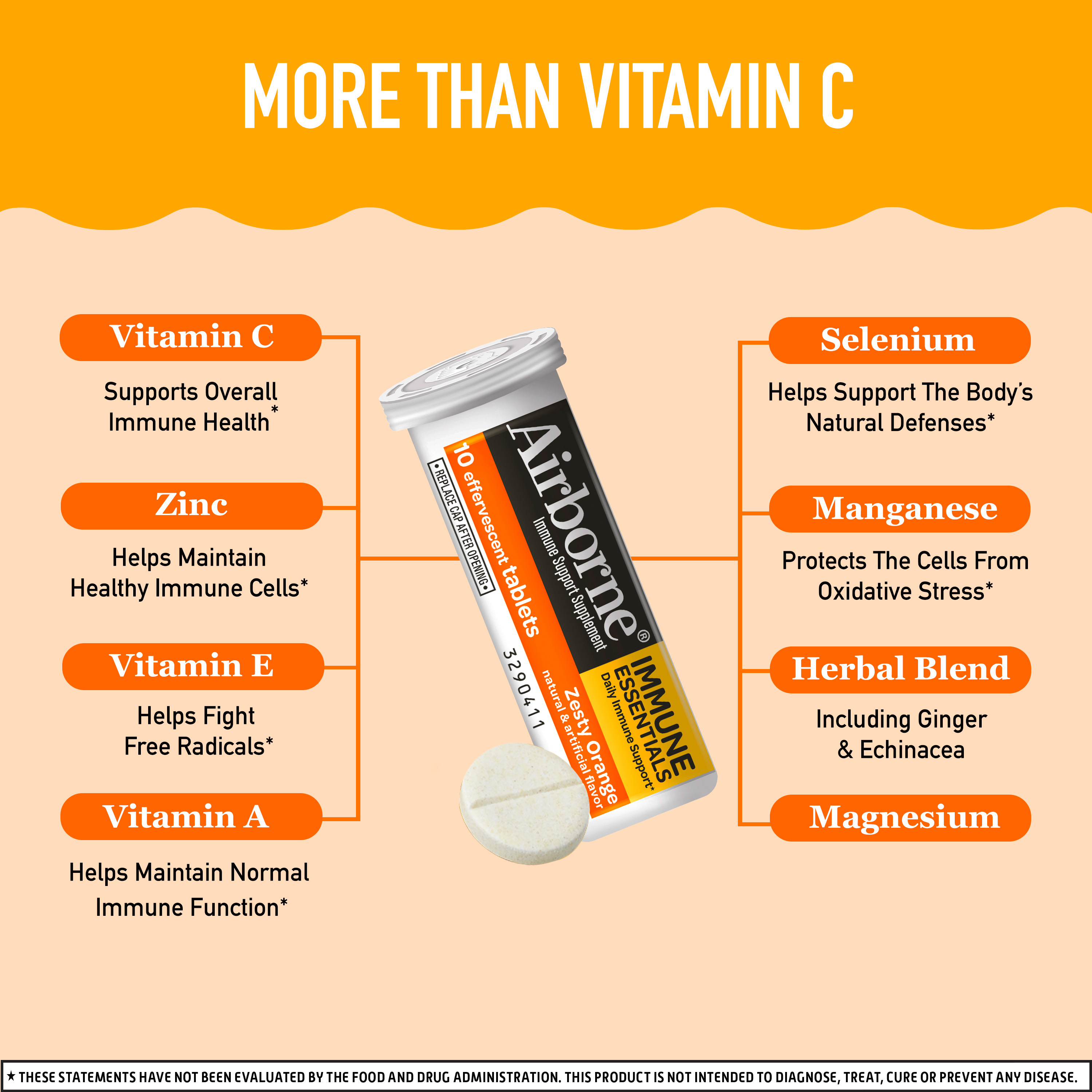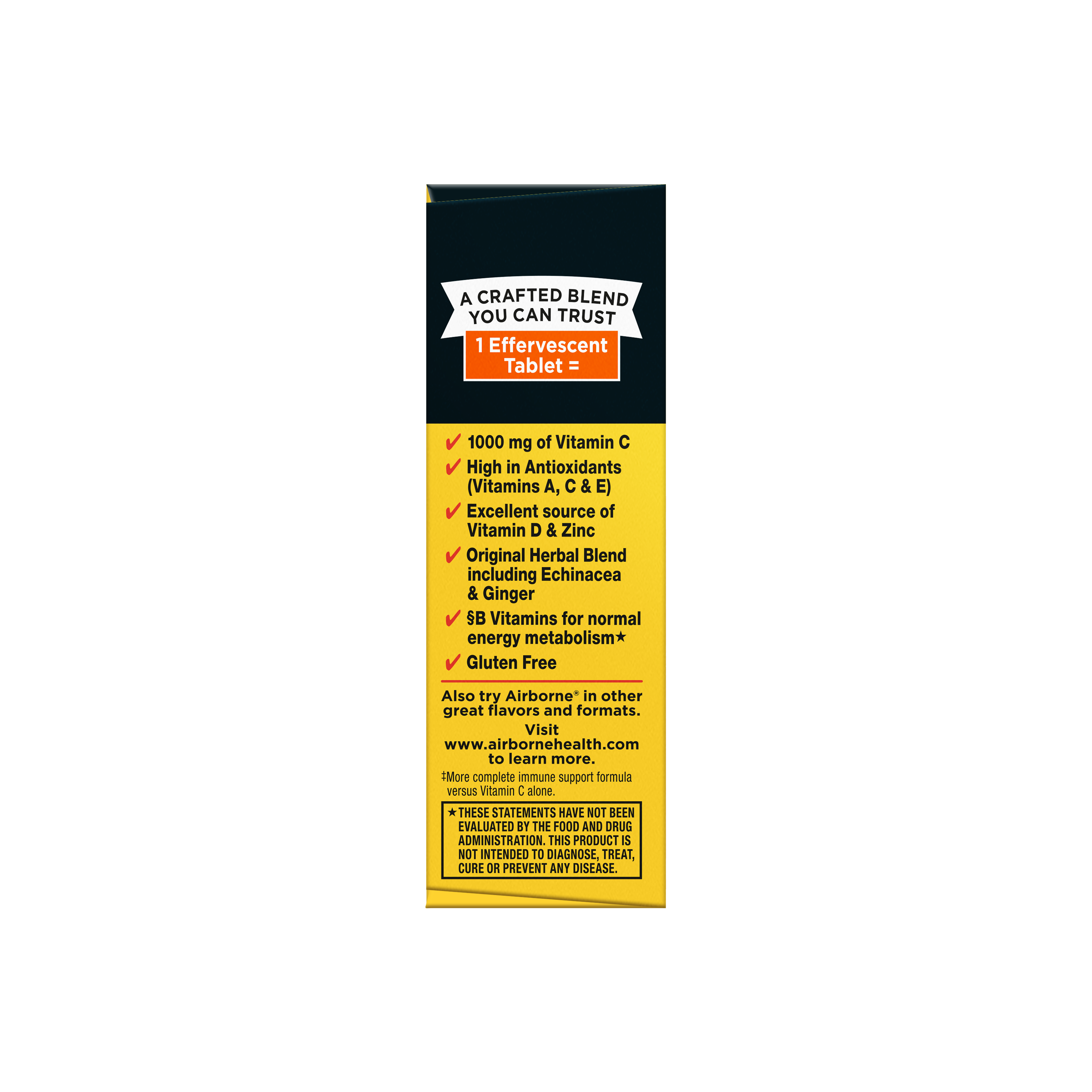 | Product Description | Airborne immune support effervescent tablets are packed with 1000mg Vitamin C per serving, which helps support your immune system.* Vitamin C with Zinc effervescent tablets contain 73% of your daily value of Zinc, which plays a central role in your immune system and is essential for the functioning and signaling of immune cells.* These immunity vitamins contain the powerful antioxidants Vitamin A (to support immune health), Vitamin C (to support immune health) and Vitamin E (to help fight free radicals).* This crafted blend of 8 immune support vitamins, minerals & herbs is an excellent source of Zinc and Selenium. Airborne is the #1 Immune Support Gummy, Effervescent & Chewable Brand1. These refreshing, Zesty Orange flavored, dissolvable Vitamin C tablets are convenient and easy for adults and for kids 12+ to take at home or on the go. Drop one (1) tablet into 4-6 ounces of water, let dissolve and drink. Adults and children 14 years and older, repeat every 3-4 hours as necessary, up to 2 times per day. Children 12-13 years old, no more than (1) tablet per day. *These statements have not been evaluated by the Food and Drug Administration. This product is not intended to diagnose, treat, cure or prevent any disease. ¹Based on unit sales L52W through 6/10/2023. |