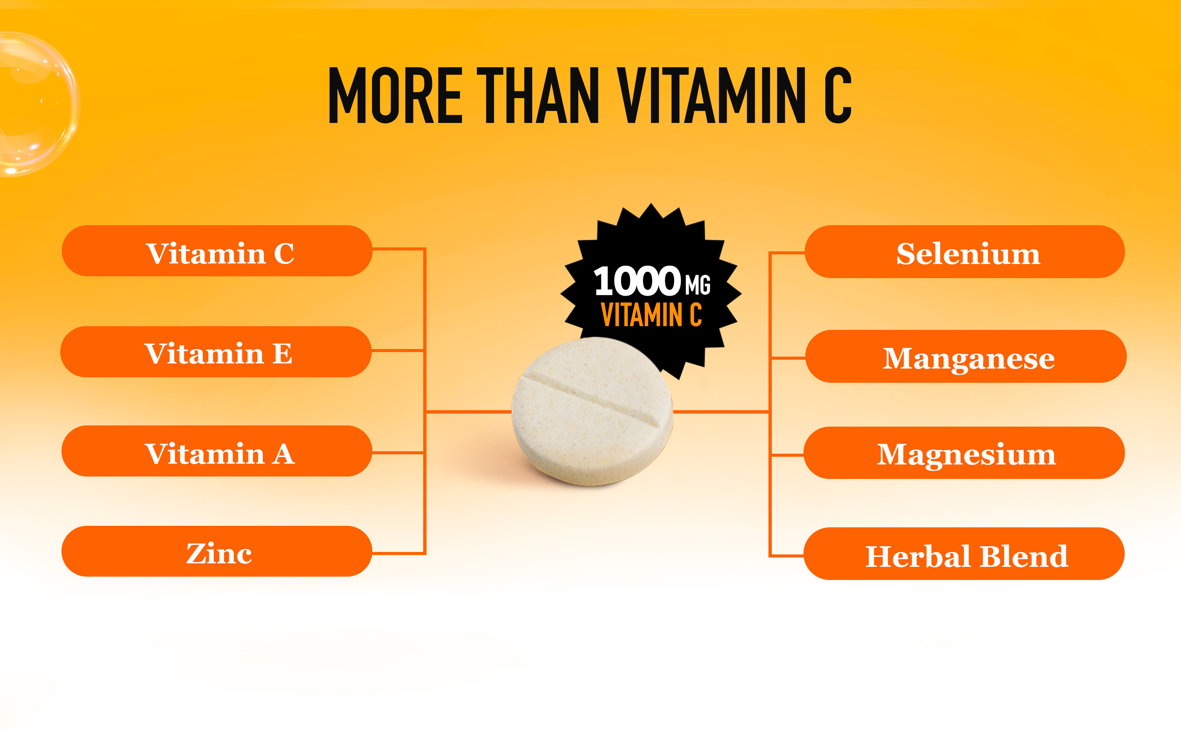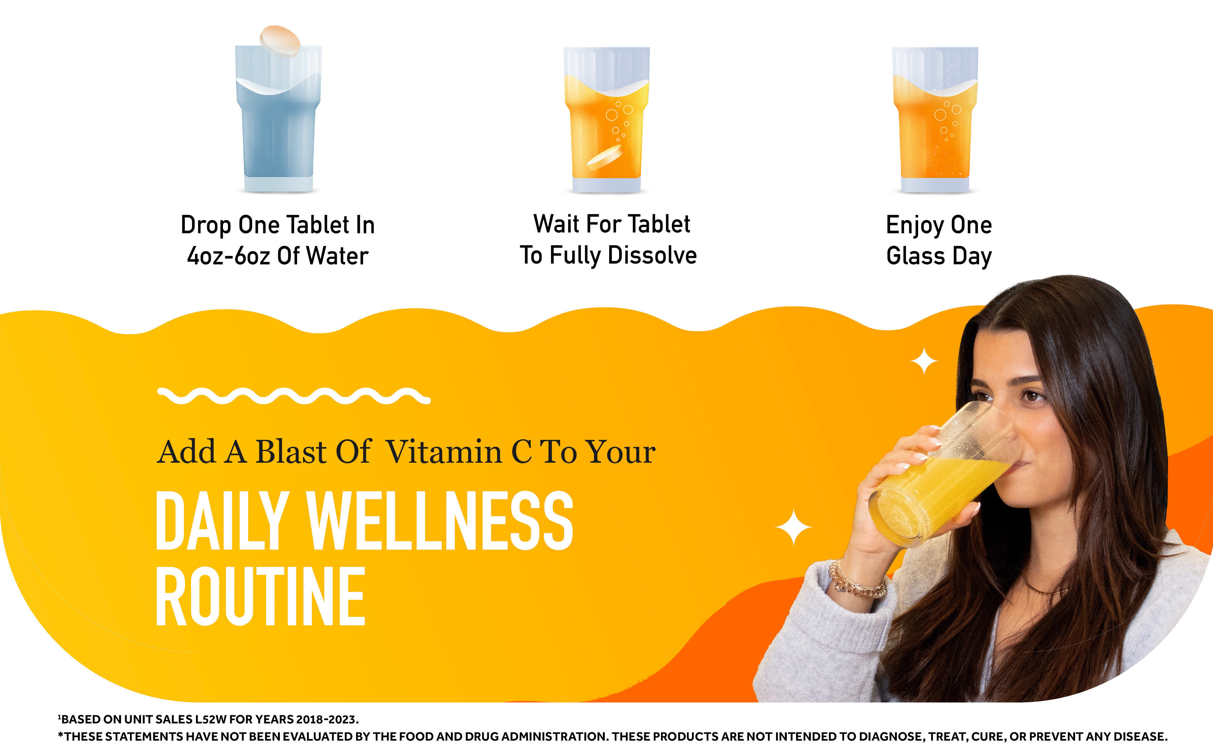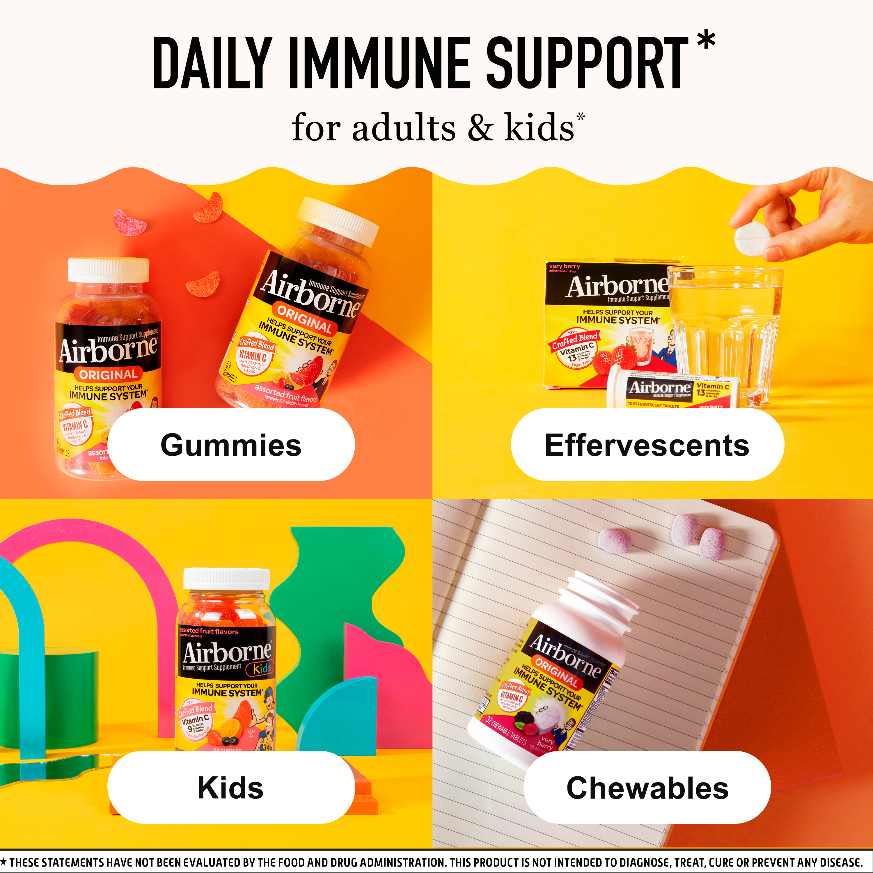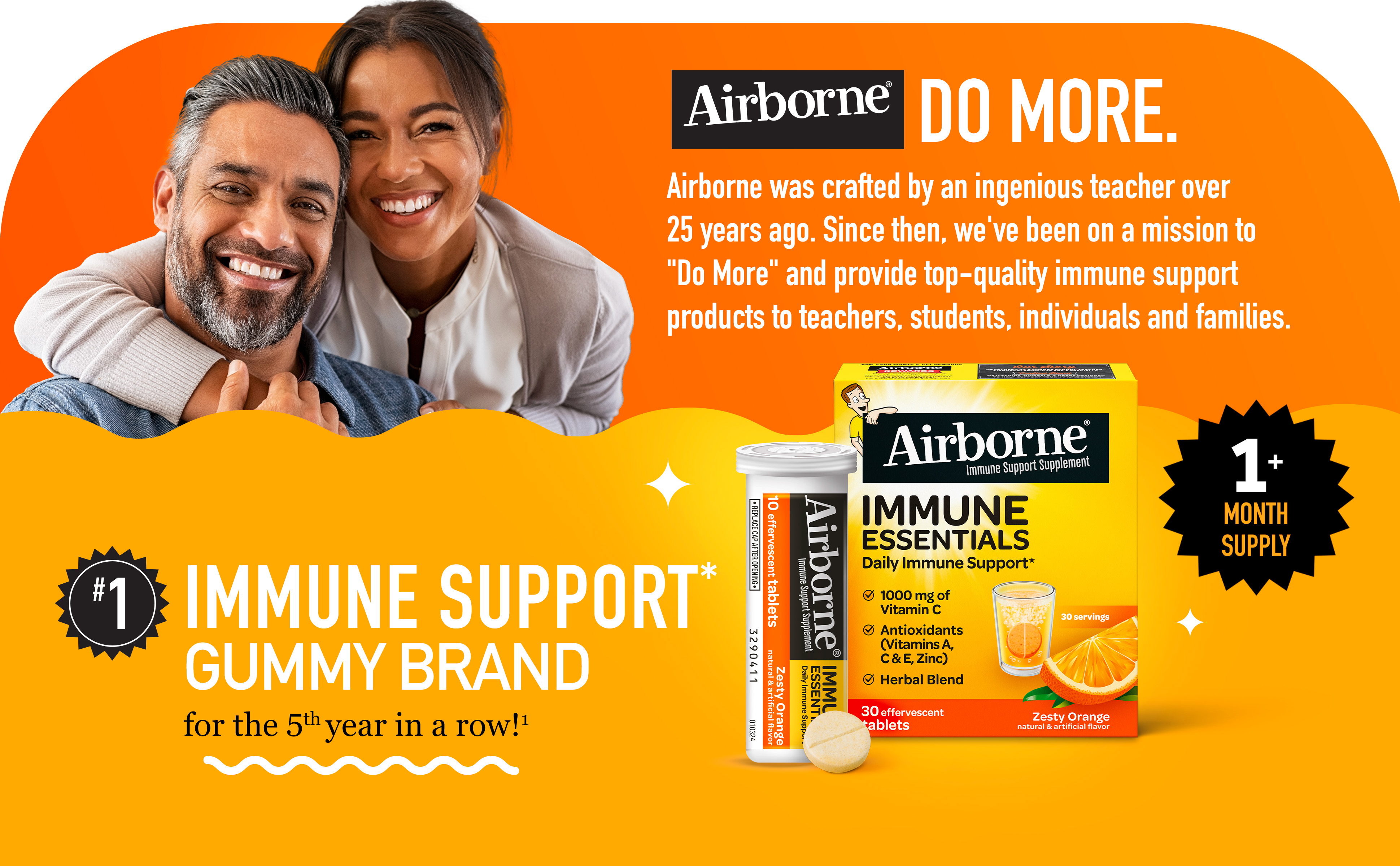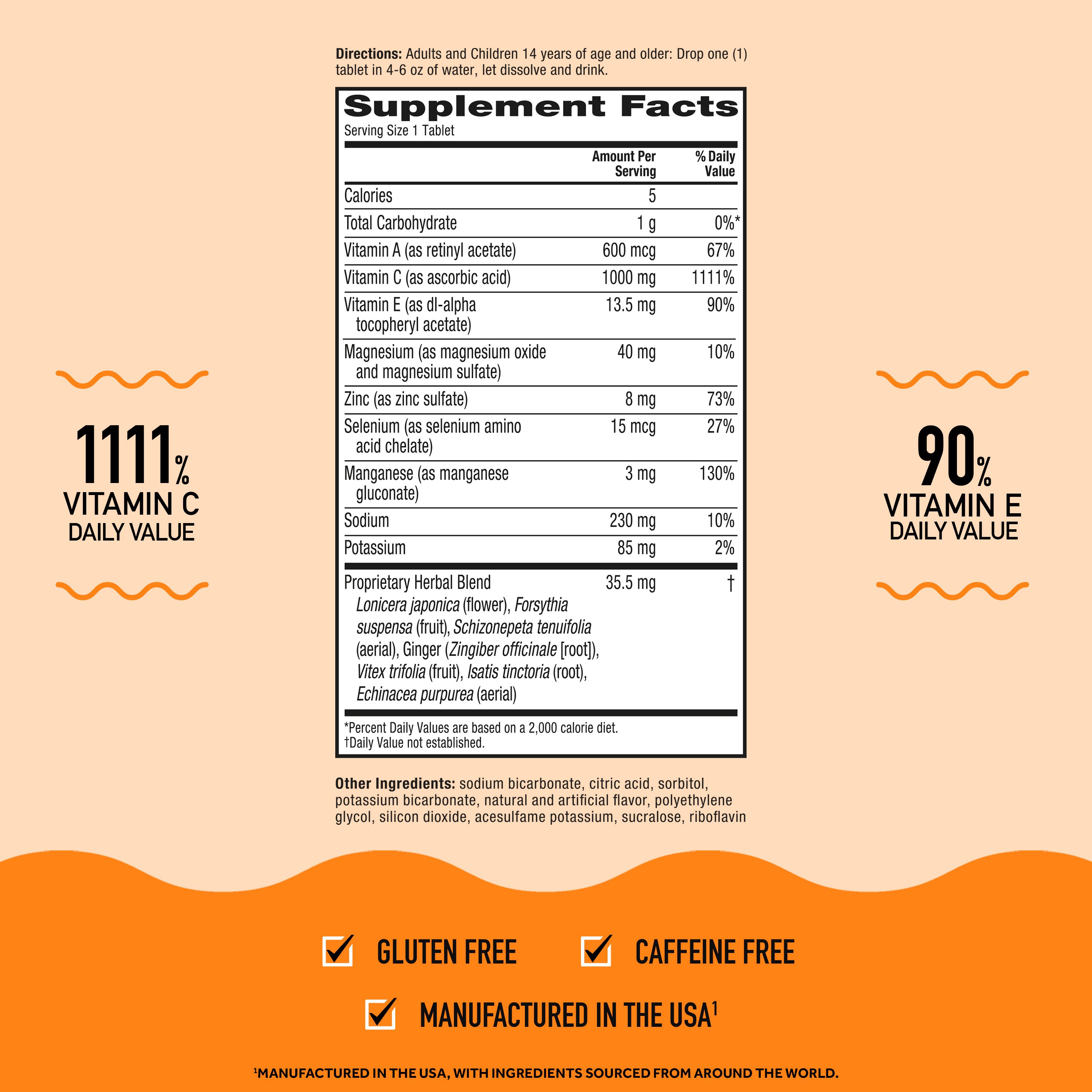 | Product Description | Airborne immune support effervescent tablets are packed with 1000mg Vitamin C per serving, which helps support your immune system.* Vitamin C with Zinc effervescent tablets contain 73% of your daily value of Zinc, which plays a central role in your immune system and is essential for the functioning and signaling of immune cells.* These immunity vitamins contain the powerful antioxidants Vitamin A (to support immune health), Vitamin C (to support immune health) and Vitamin E (to help fight free radicals).* This crafted blend of 8 immune support vitamins, minerals & herbs is an excellent source of Zinc and Selenium. Airborne is the #1 Immune Support Gummy, Effervescent & Chewable Brand1. These refreshing, Zesty Orange flavored, dissolvable Vitamin C tablets are convenient and easy for adults and for kids 12+ to take at home or on the go. Drop one (1) tablet into 4-6 ounces of water, let dissolve and drink. Adults and children 14 years and older, repeat every 3-4 hours as necessary, up to 2 times per day. Children 12-13 years old, no more than (1) tablet per day. *These statements have not been evaluated by the Food and Drug Administration. This product is not intended to diagnose, treat, cure or prevent any disease. ¹Based on unit sales L52W through 6/10/2023. |