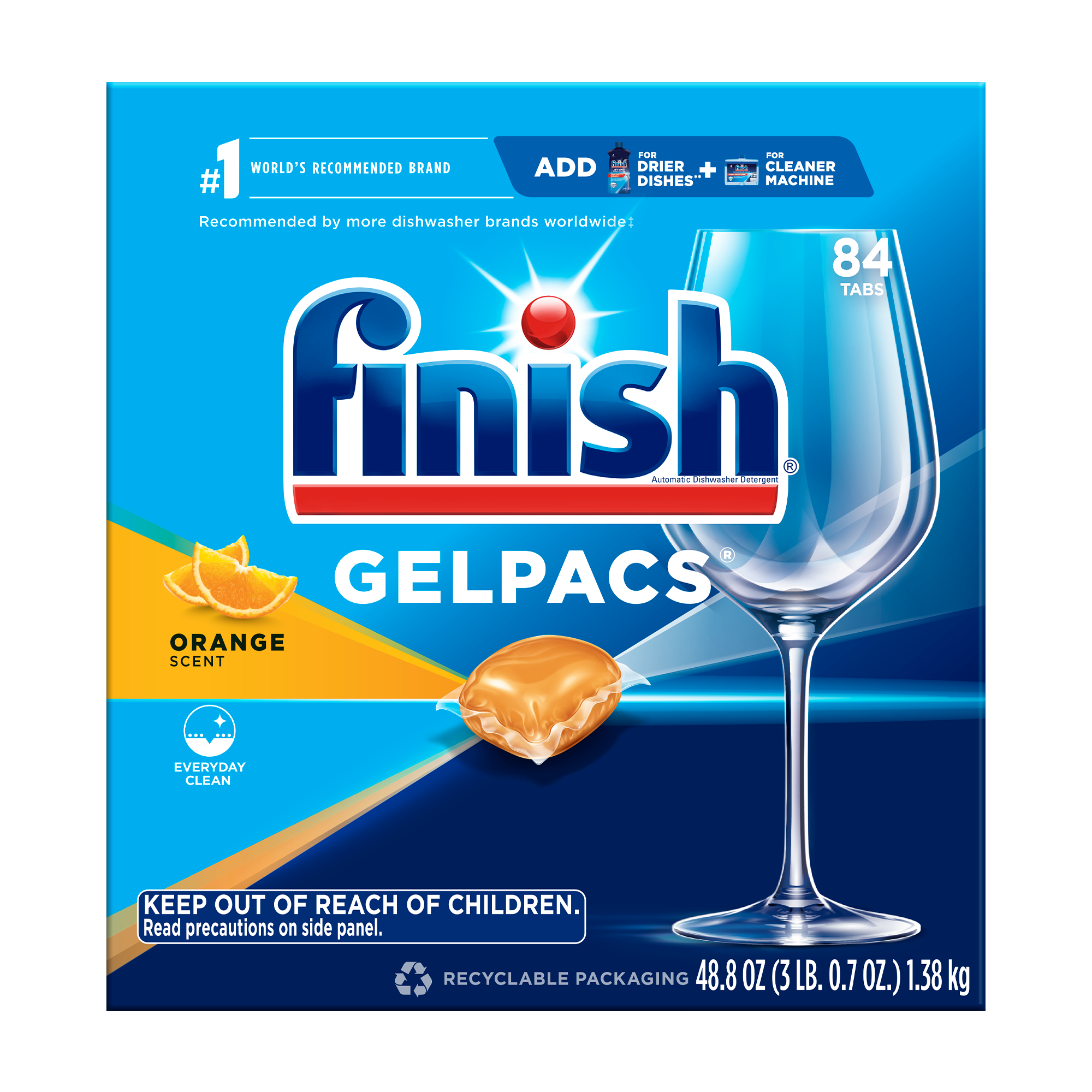 From the World's #1 Recommended Brand*, Finish All In 1 Gelpacs tackle tough messes. It has 3X concentrated cleaning power of regular Finish Gel. Our revolutionary Pre-Soakers burst into action to scrub away tough food residues like baked-on lasagna and dried-on oatmeal. Our Powerful Cleaners remove even the toughest stains and gently scrub your dishes and glasses sparkling clean. All In 1 Gelpacs are easy-to-use and pre-measured pods with a refreshing orange scent that are safe for septic systems. *More Dishwasher Brands Recommend Finish products Worldwide than any other brand. Recommendations as part of Co-marketing Agreements.