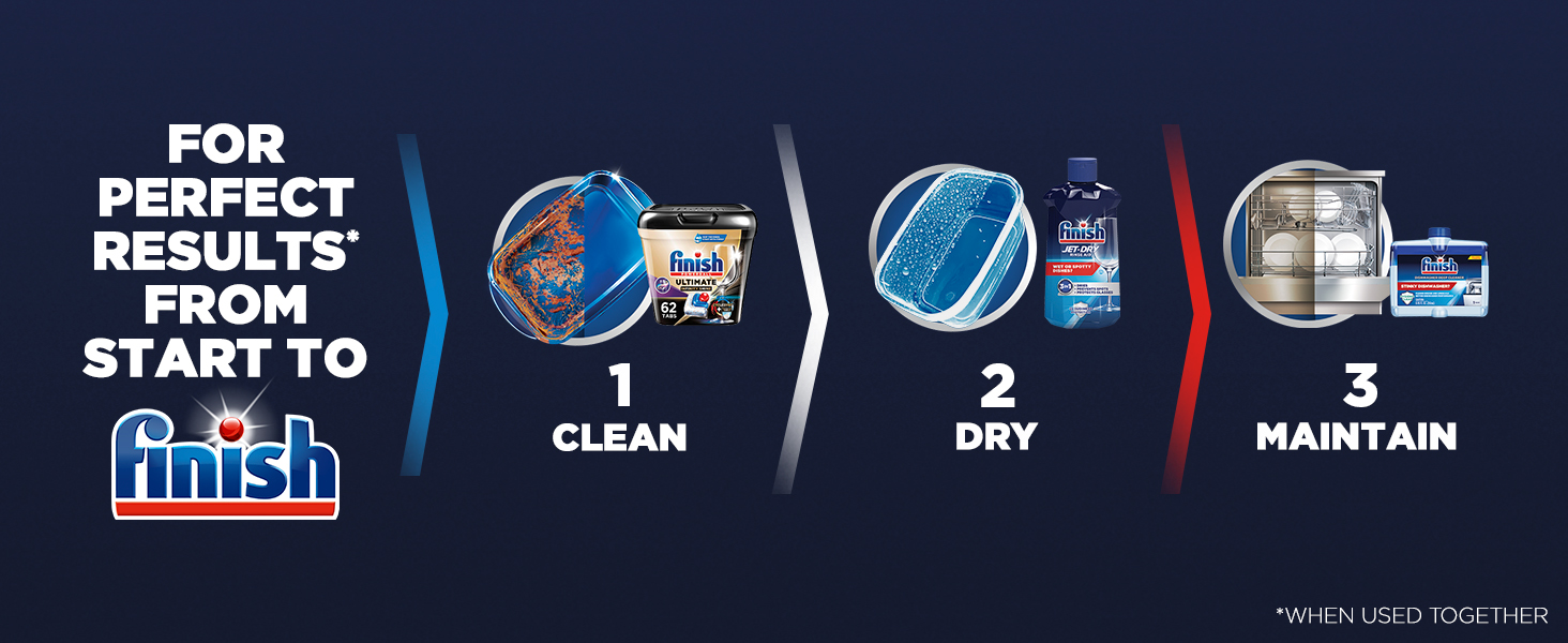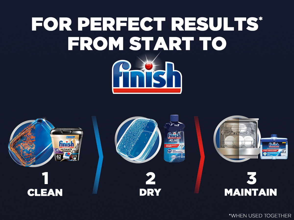- FINISH YOUR CLEAN: Use Finish Jet Dry with Finish Ultimate dishwasher detergent pod for the optimal dishwashing experience. Shop our range of dishwasher supplies, like Finish dishwasher tablets, and dishwasher cleaner liquid & tablets.