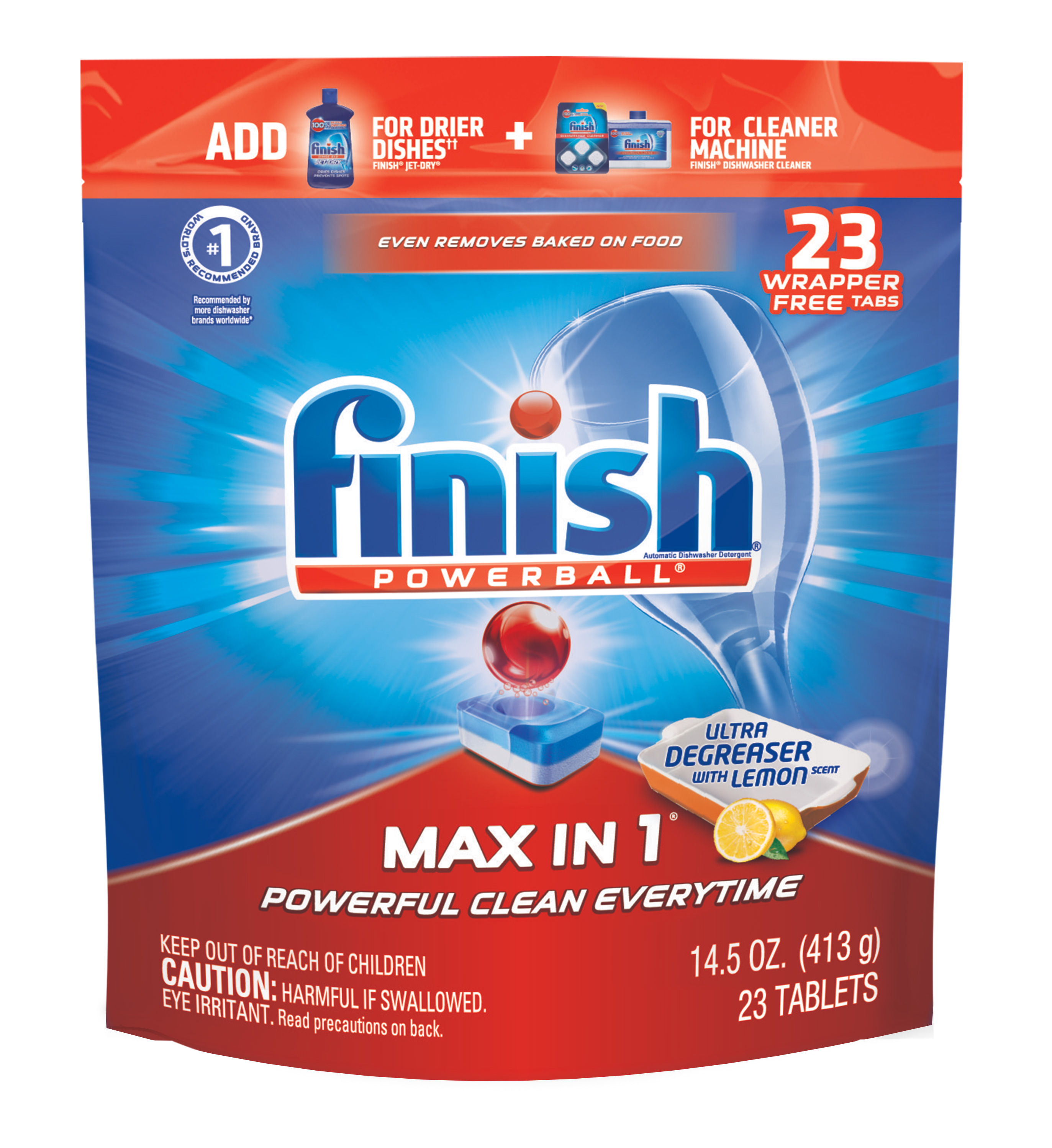 - No need to pre-soak or pre-rinse with Powerball that powers away tough grease & scrubs away burnt & dried-on food