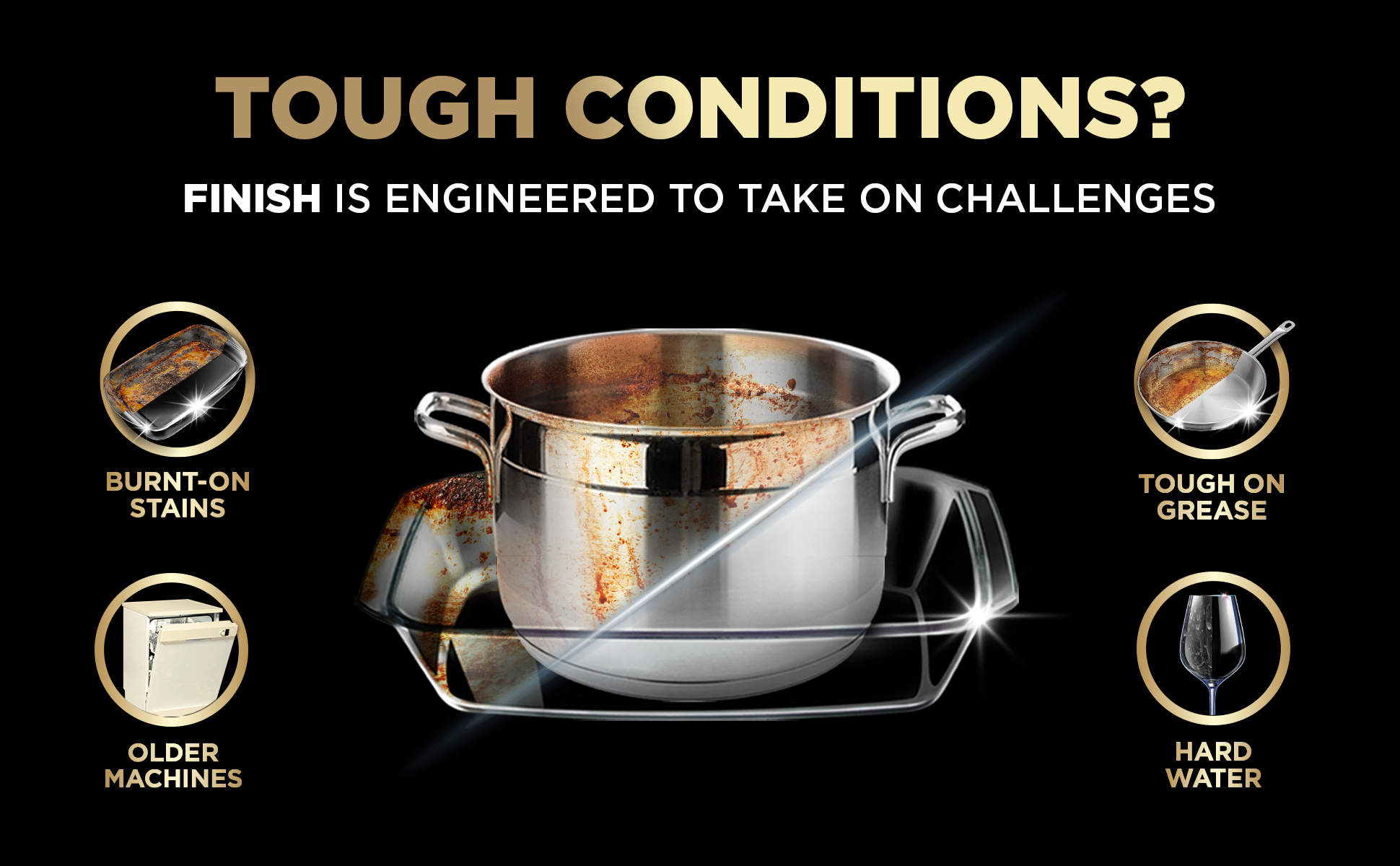 - POWERFUL DISHWASHER DETERGENT: These Finish dishwasher pods are engineered for tough conditions, including burnt-on stains, dried-on stains, older dishwasher models, and hard water conditions.