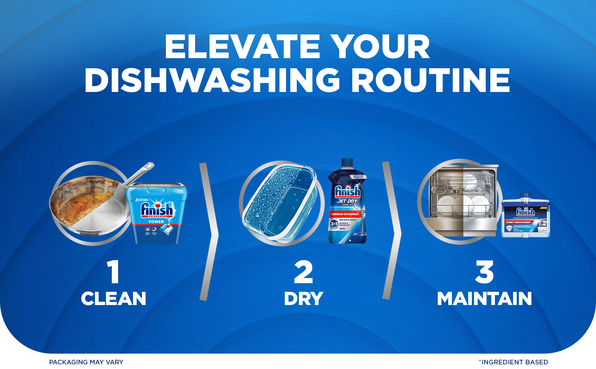 FINISH YOUR CLEAN: Shop our range of dishwasher supplies, including Finish Ultimate Dishwasher Tablets, Jet Dry Rinse Aid, Dishwasher Cleaner Liquid, and Dishwasher Cleaner Tablets. Start with Finish!