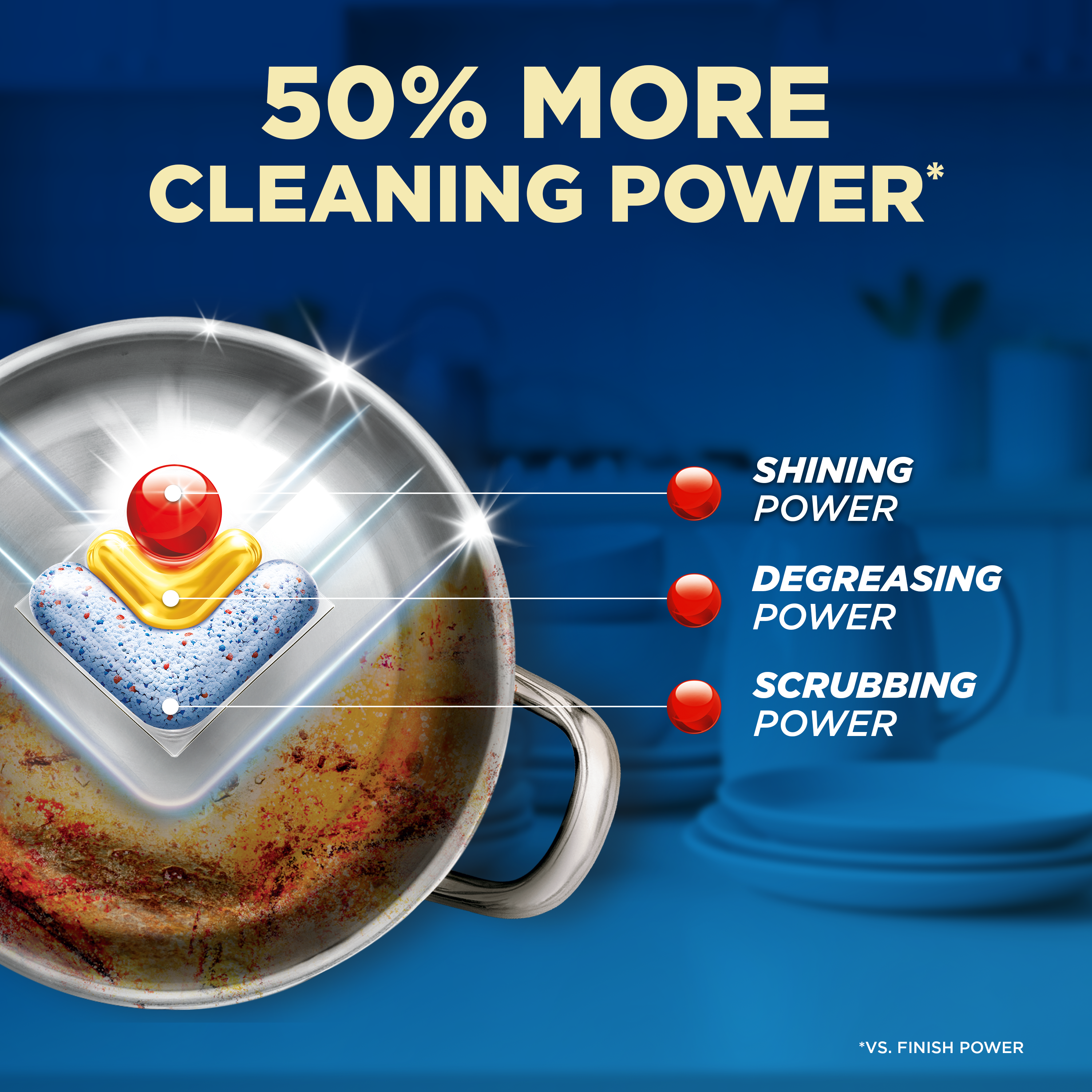 - Disclaimer: ** based on increased ingredients vs. Finish Power. *** based on cleaning ingredients vs. Finish Power. *vs. Finish Power. 1Based on combined unit sales of automatic dishwashing detergents, rinse aids, and other additives.
