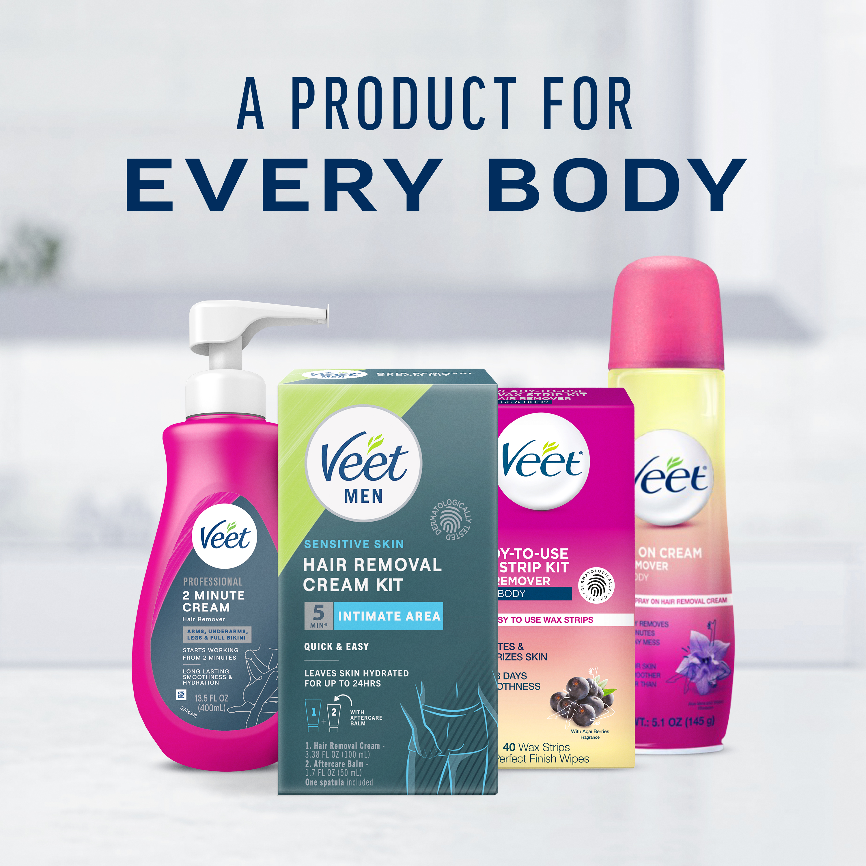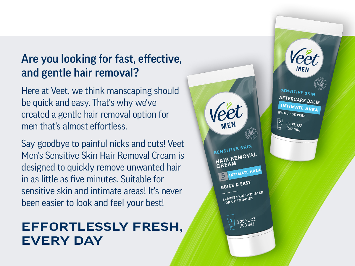 - VEET HAIR REMOVAL CREAM FOR MEN: Veet Men's Sensitive Skin Hair Removal Cream is developed with men's hair and skin in mind, and is suitable for use on various body parts, including the groin, pubic area, buttocks, chest, back, legs, arms & underarms