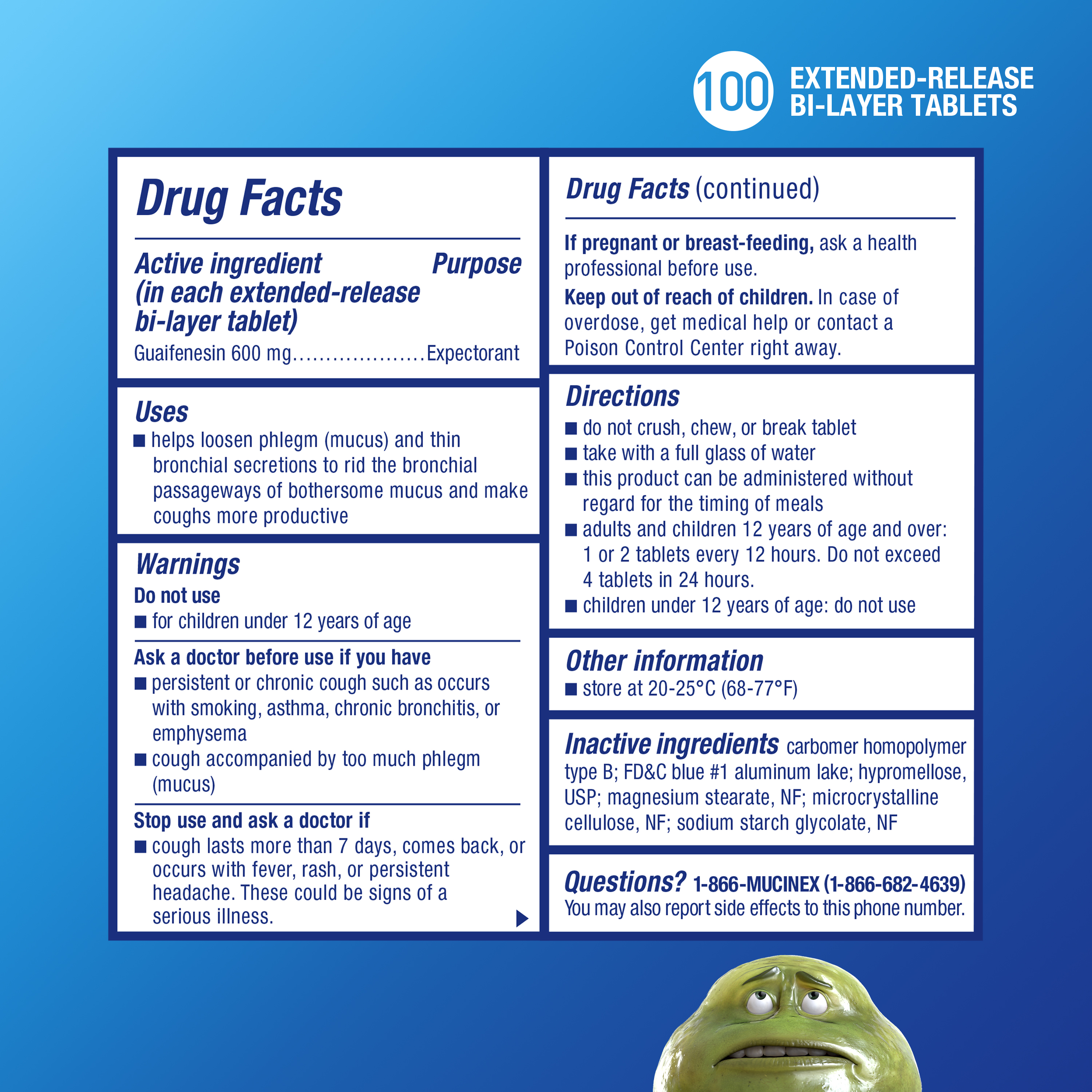 - EXTENDED RELEASE GUAIFENESIN: Experience long-lasting excess mucus relief with Mucinex's 12hr extended-release 600mg guaifenesin tablets; our original bi-layer tablets have both immediate & extended release