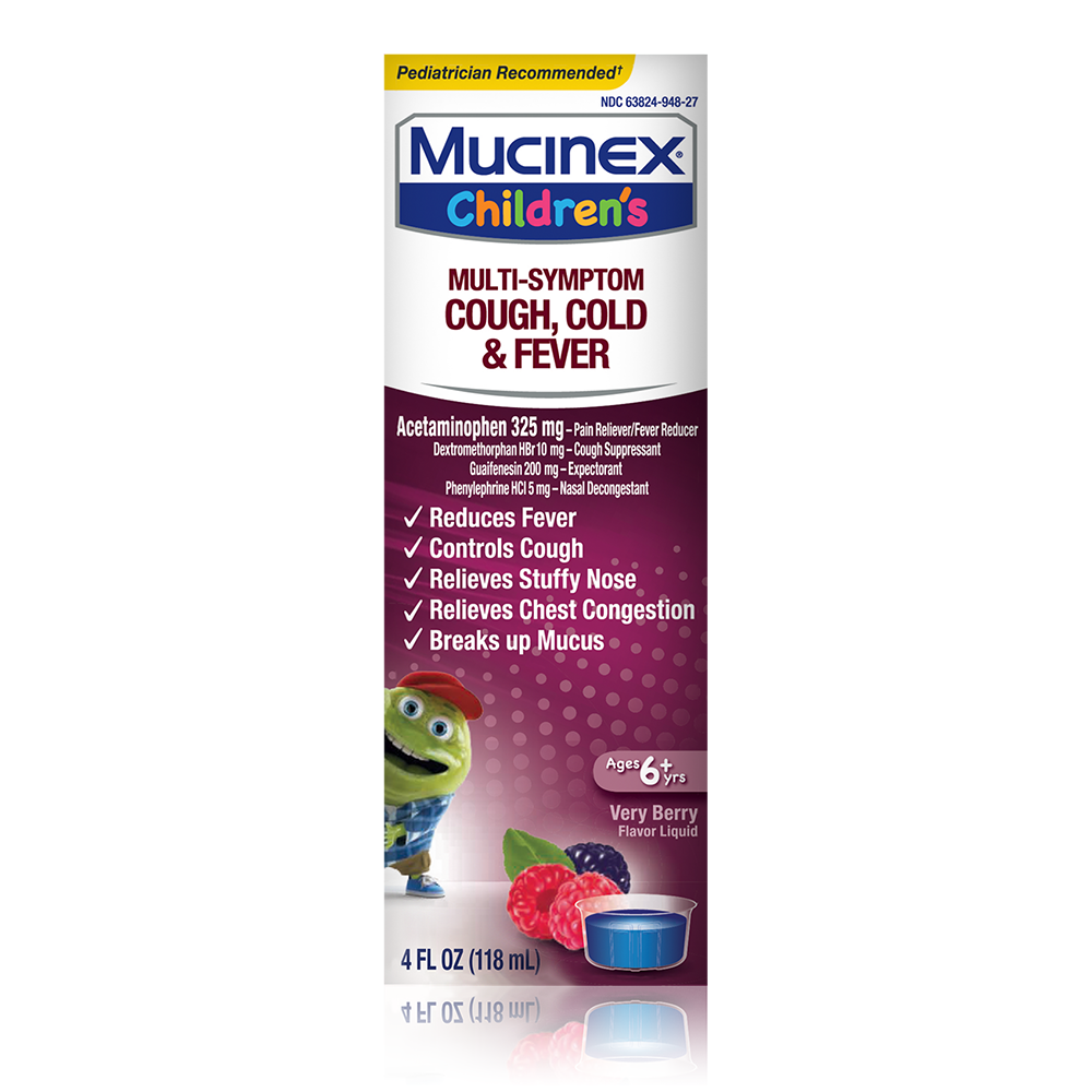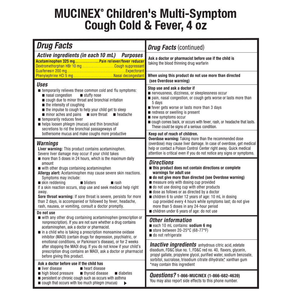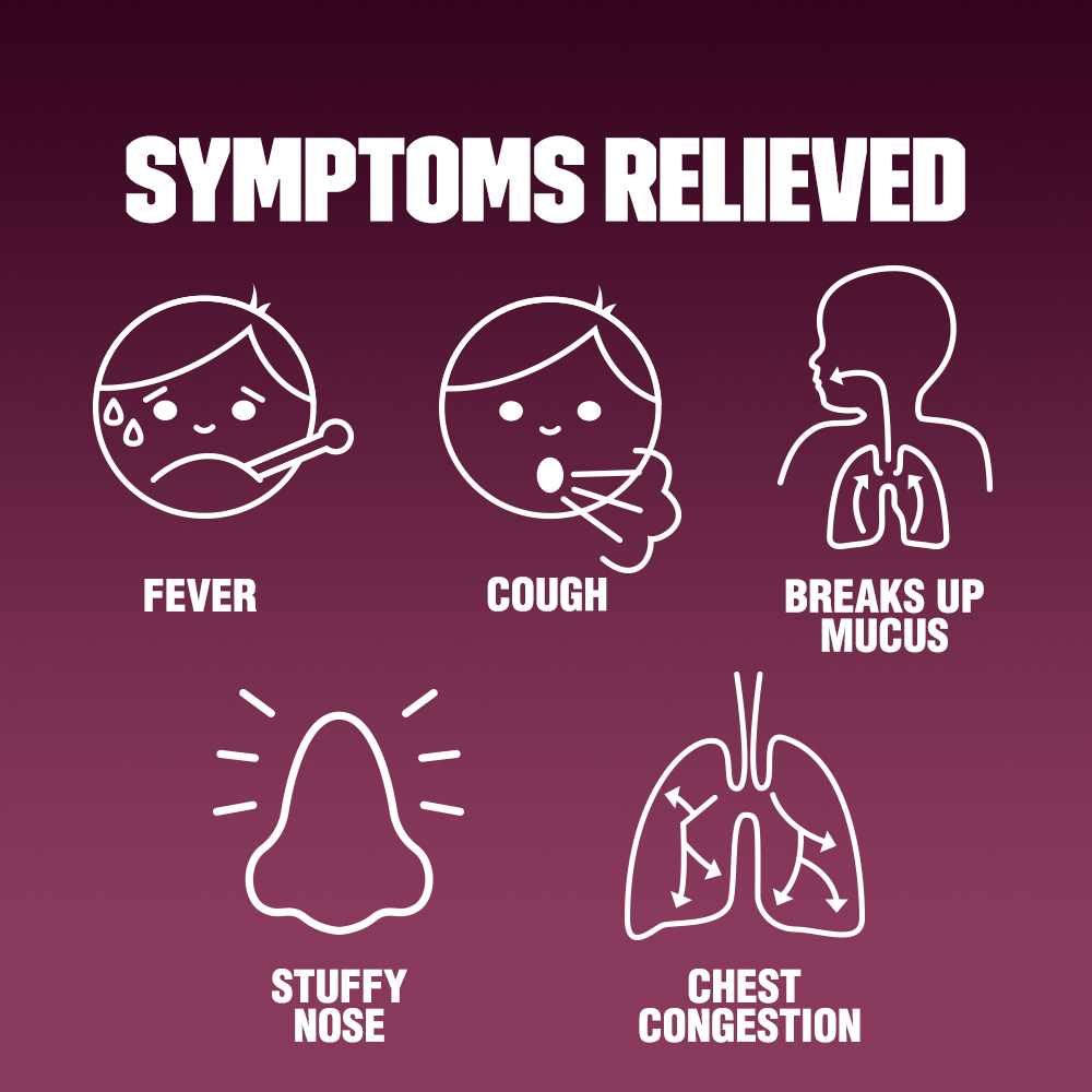 SYMPTOMS RELIEVED: Mucinex Children’s Multi-Symptom Cough, Cold & Fever reduces fever, helps control cough and relieves sore throat, stuffy nose, chest & nasal congestion, headache and minor aches and pains