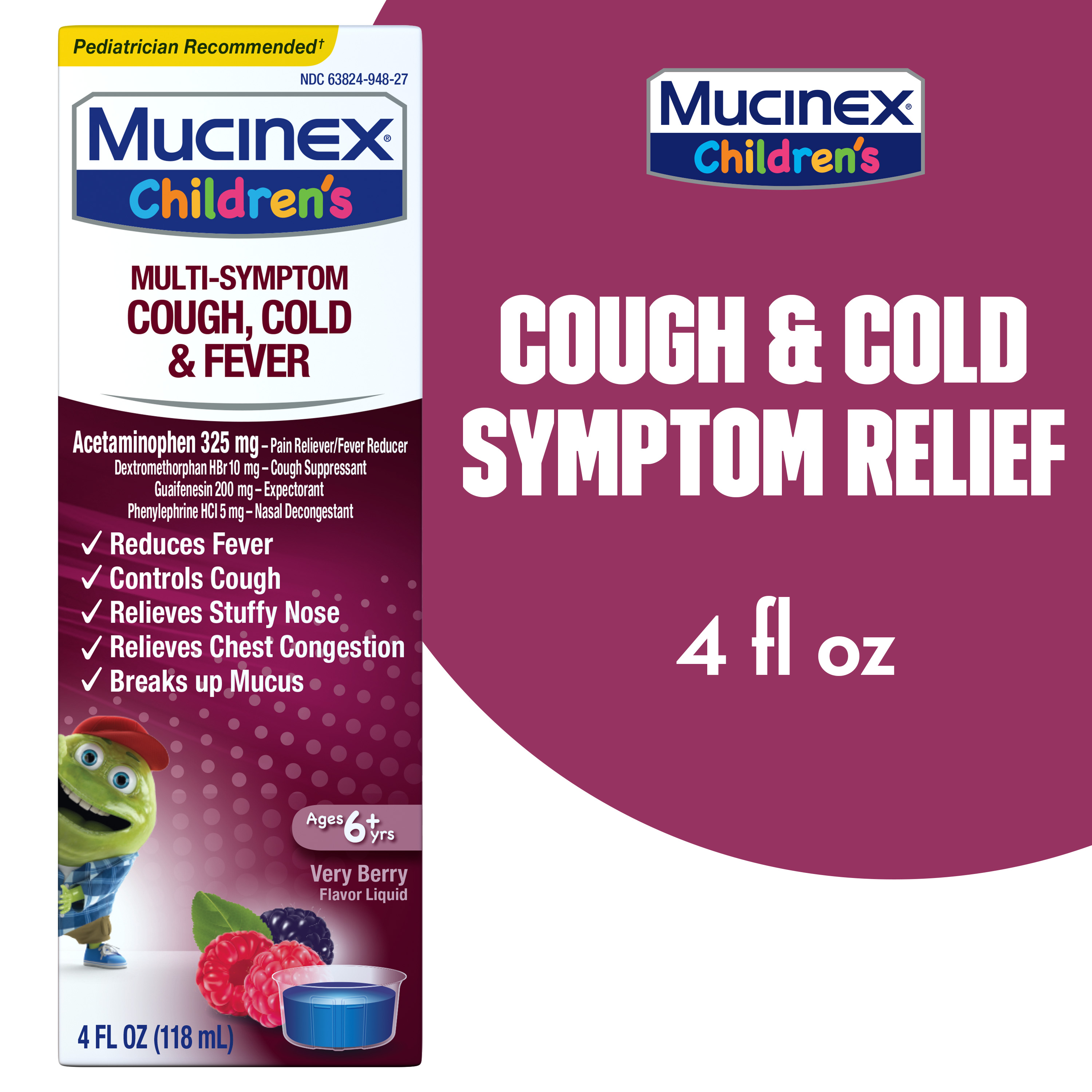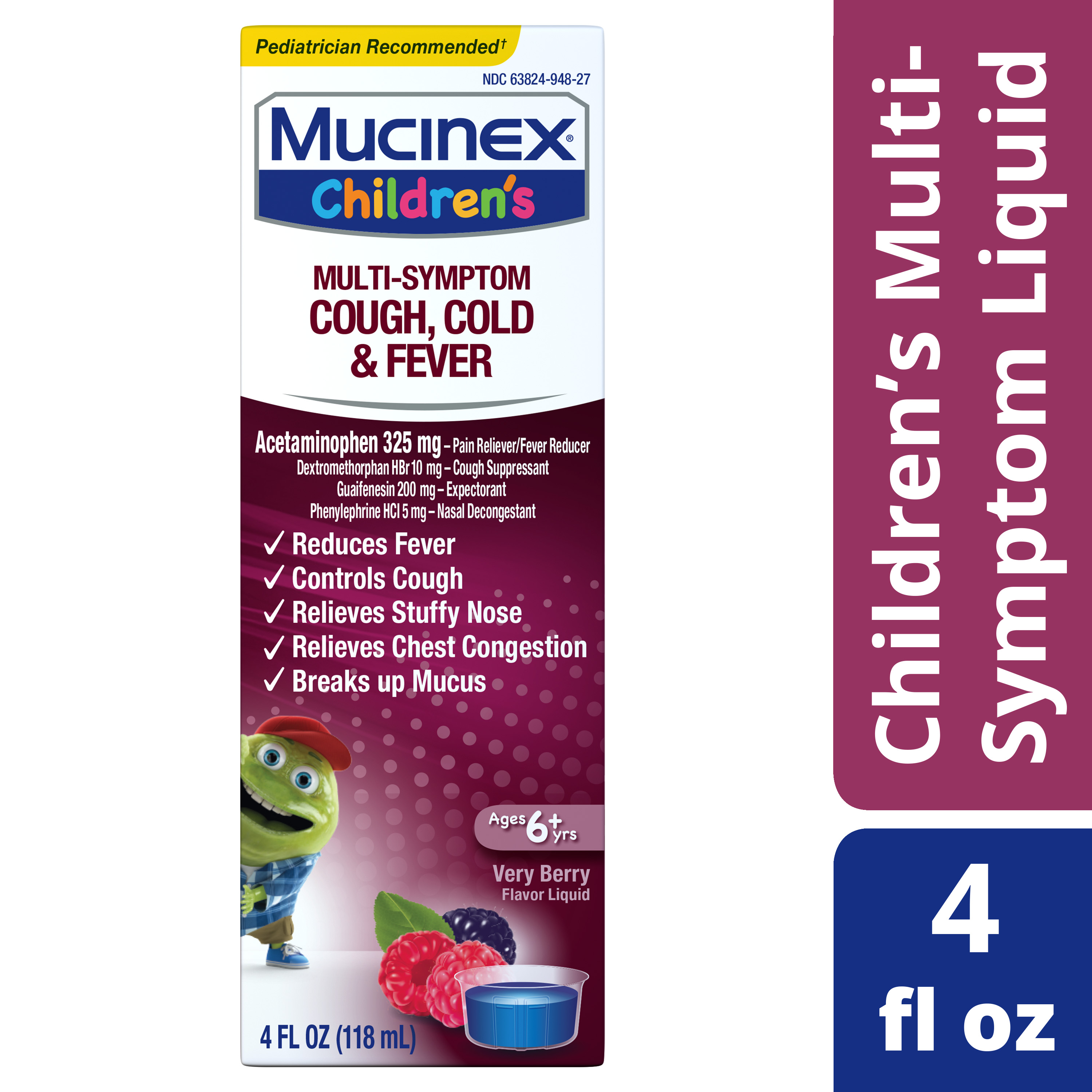 | Amazon Title | Mucinex Children’s Multi-Symptom Cough, Cold & Fever, Multi-Symptom Relief, Pain Reliever, Cough Suppressant, Expectorant, Nasal Decongestant, Very Berry Flavor, 4 FL OZ |