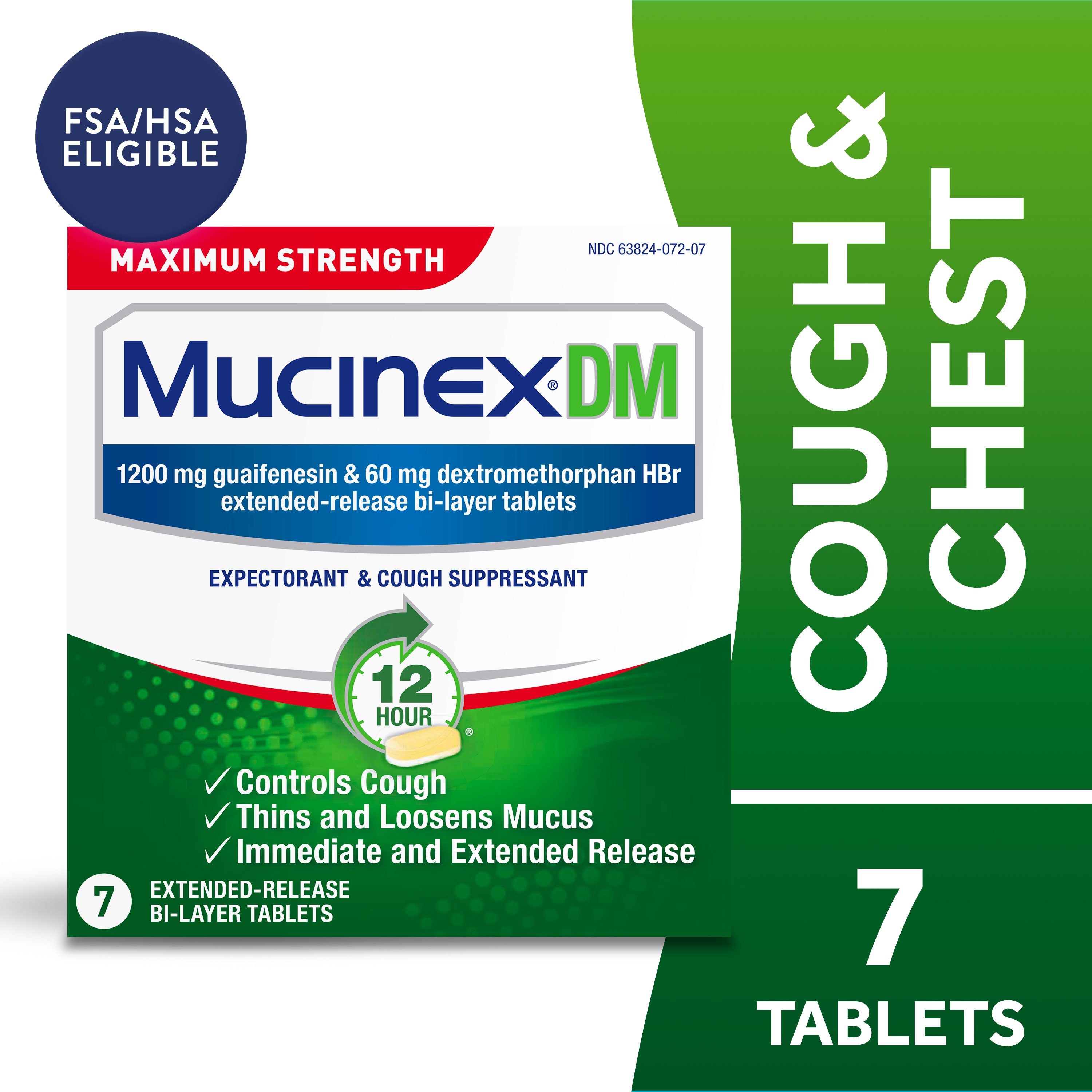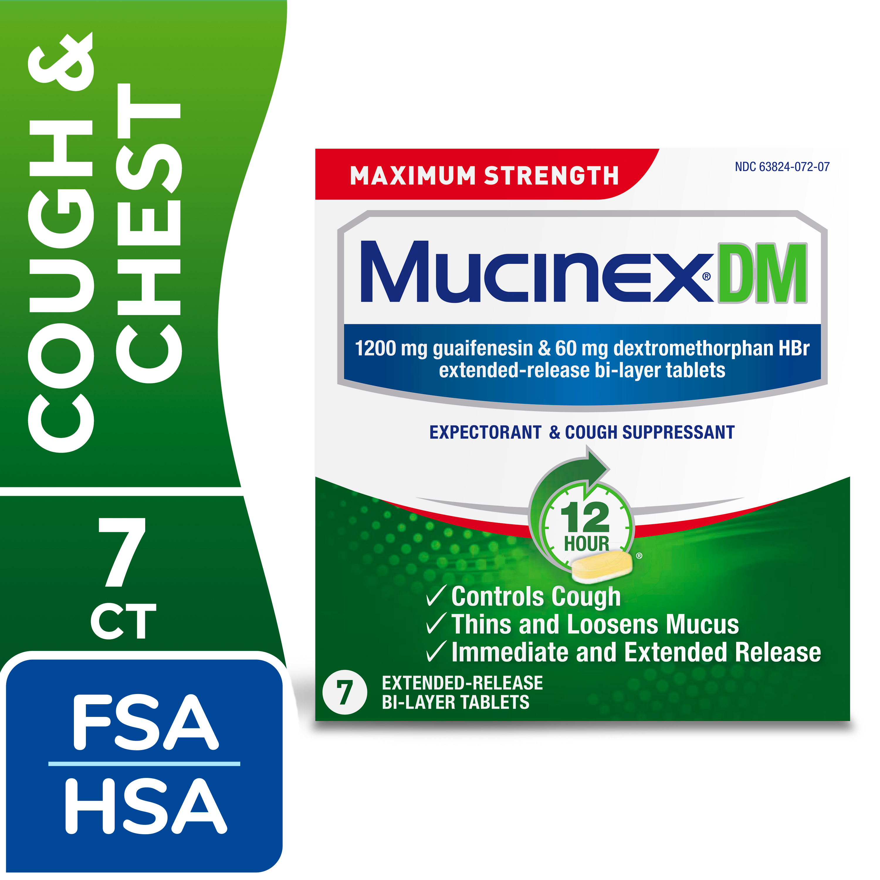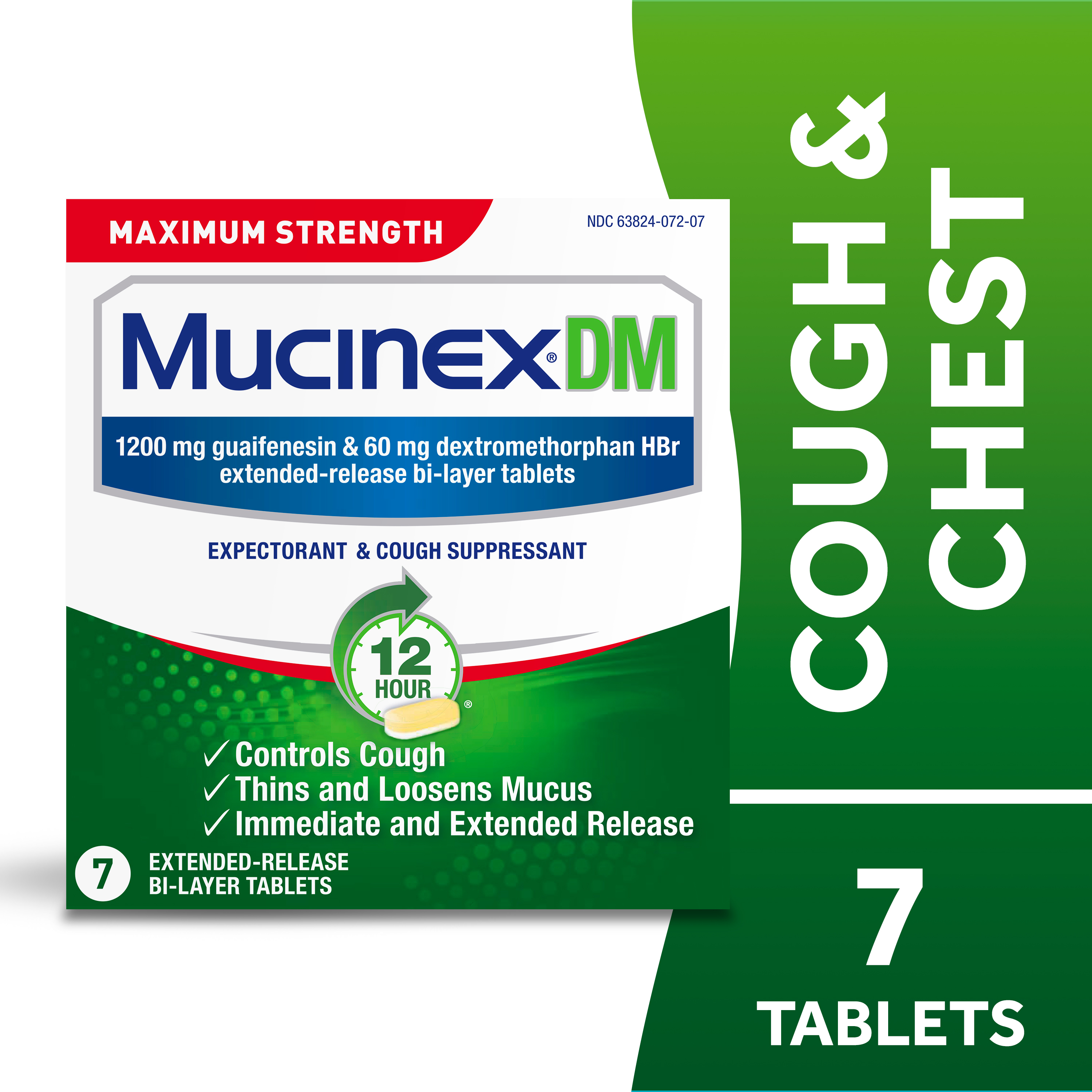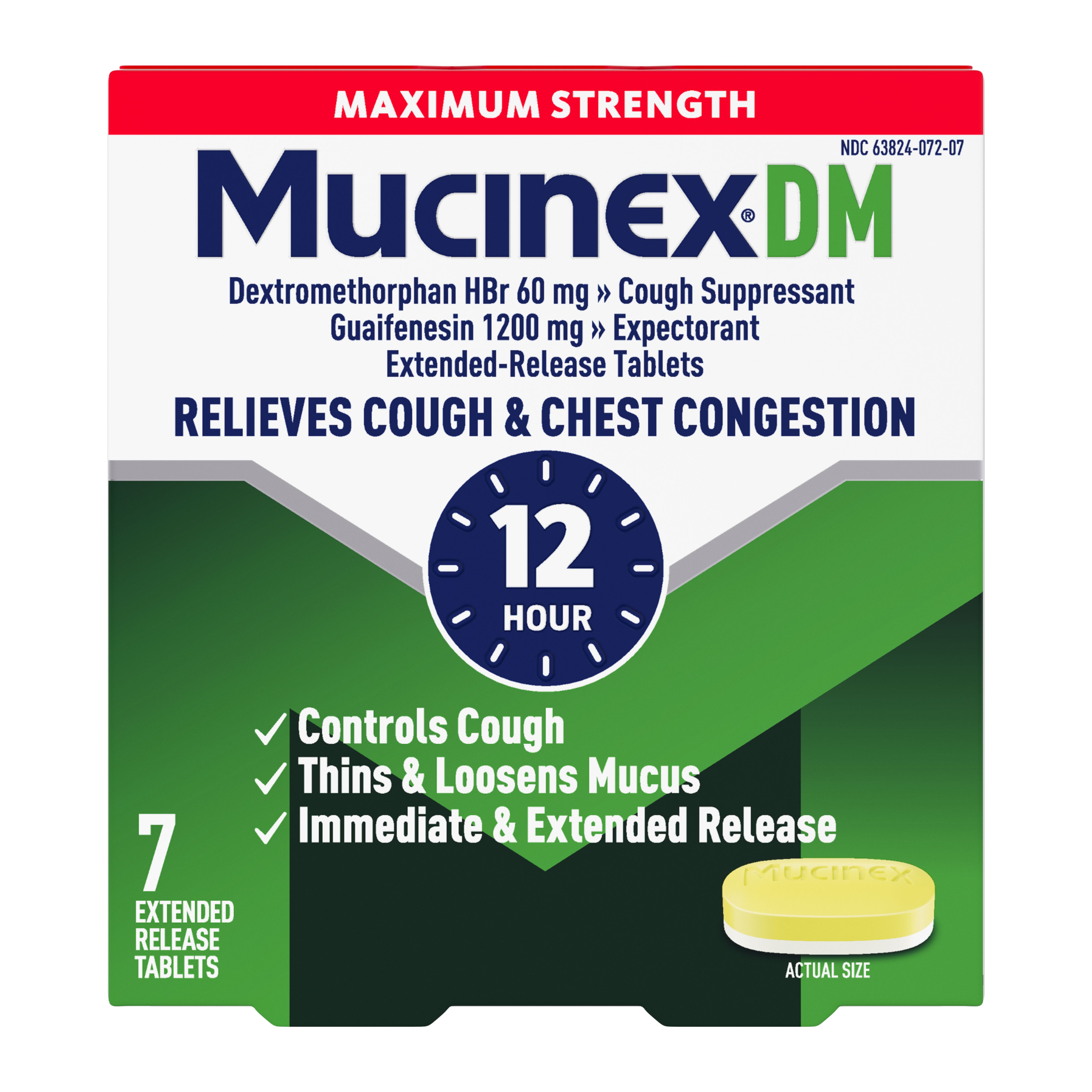 - EXTENDED RELEASE GUAIFENESIN & DEXTROMETHORPHAN HBr: Experience long-lasting symptom relief with Maximum Strength Mucinex DM 12 hr extended-release 1200 mg guaifenesin and 60 mg dextromethorphan HBr tablets