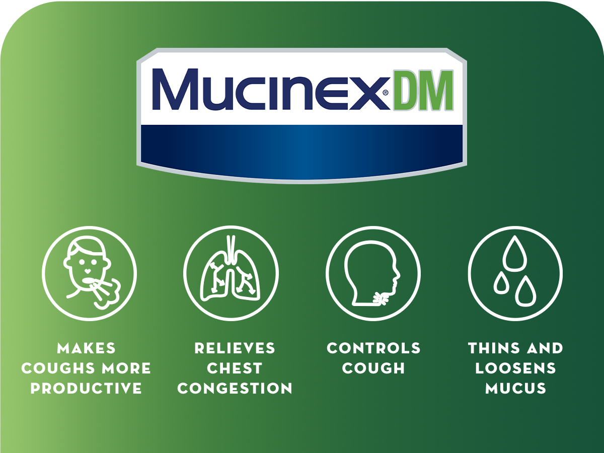 - EXPECTORANT FOR ADULTS: Maximum Strength Mucinex DM helps clear lungs of excess mucus and phlegm; Say goodbye to chest congestion and cough, say hello to excess mucus relief with our original bi-layer tablets