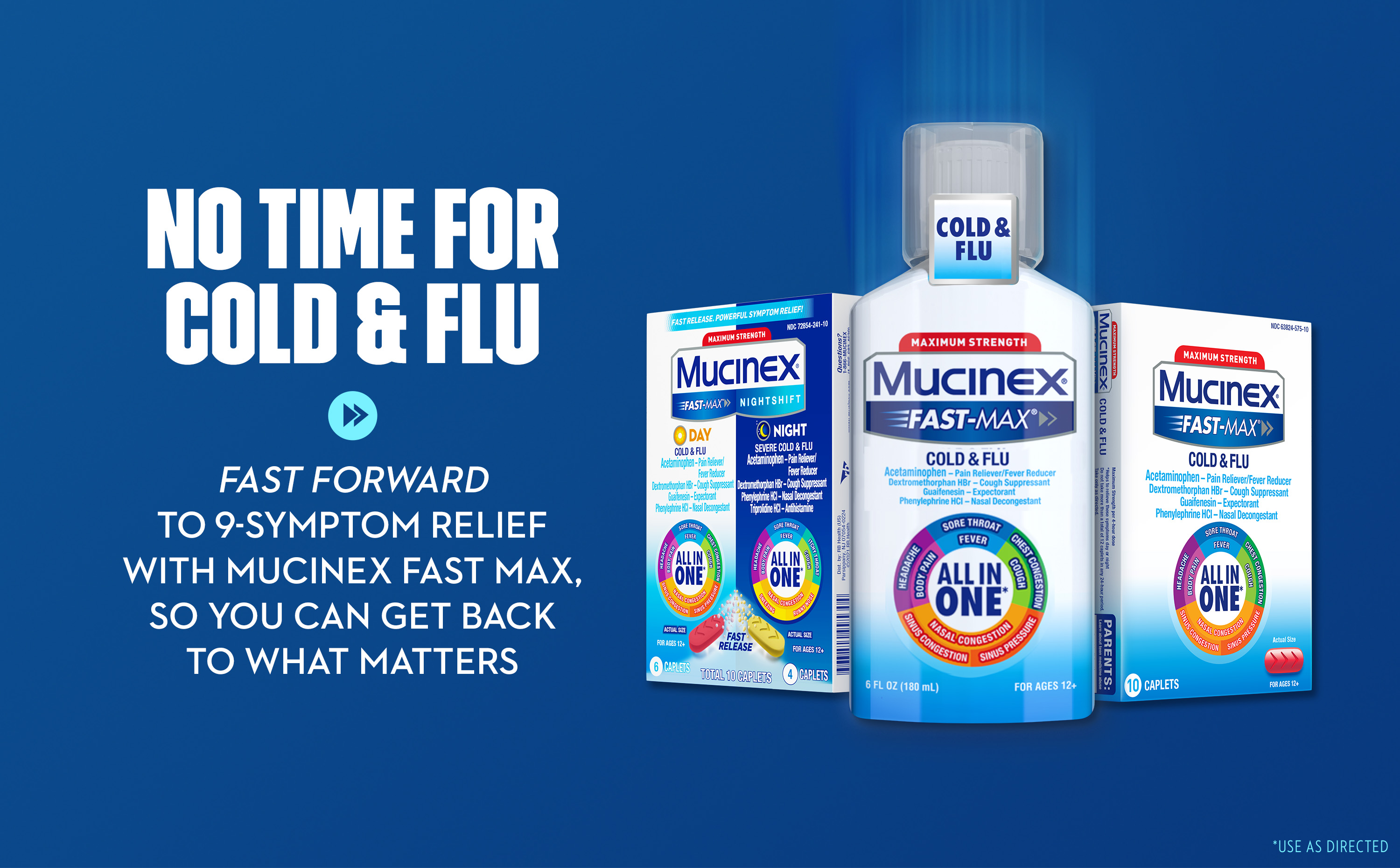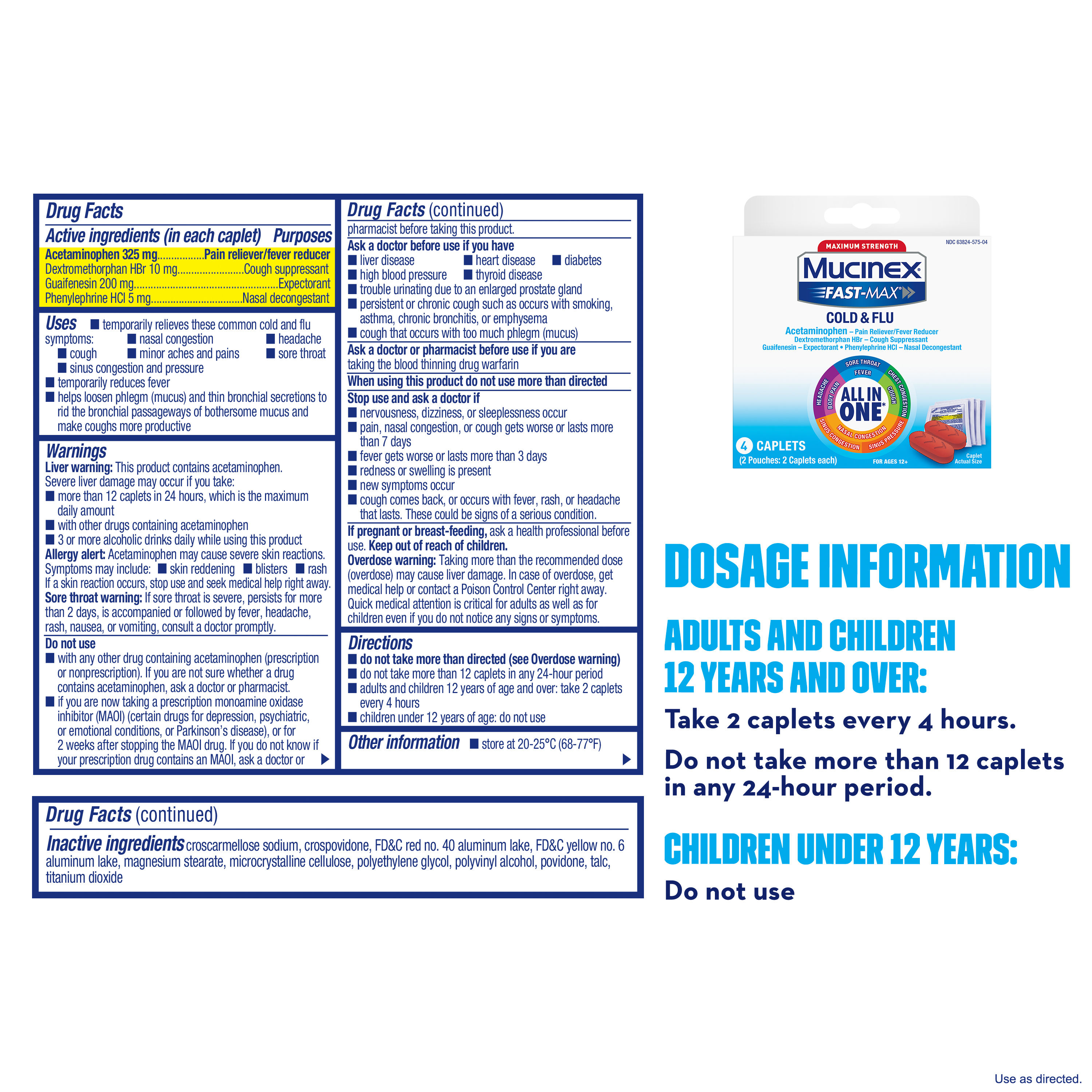 - ALL-IN-ONE COLD MEDICINE: With just two Mucinex Cold and Flu caplets, you can relieve your worst cold and flu symptoms for up to 4 hours; Use as directed
