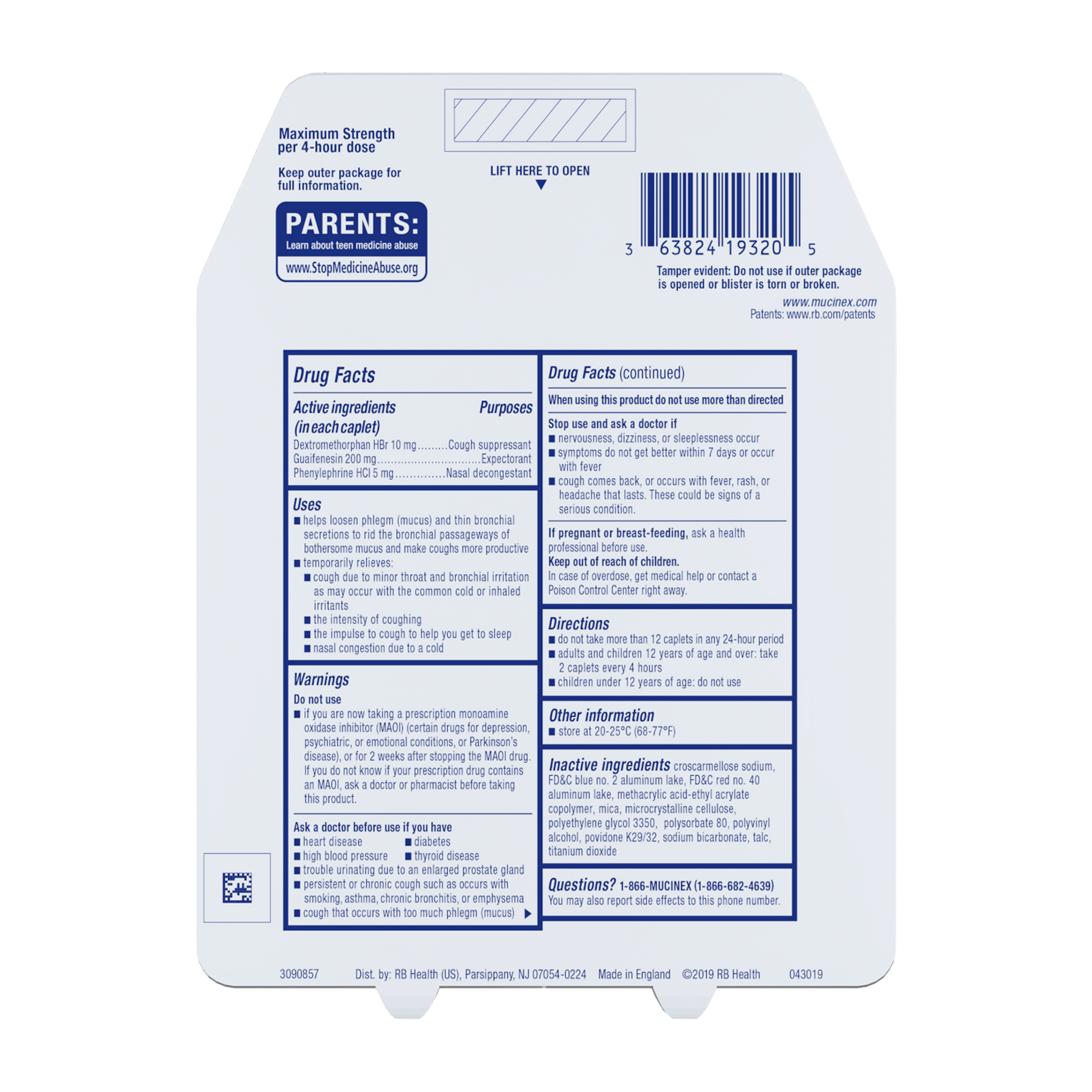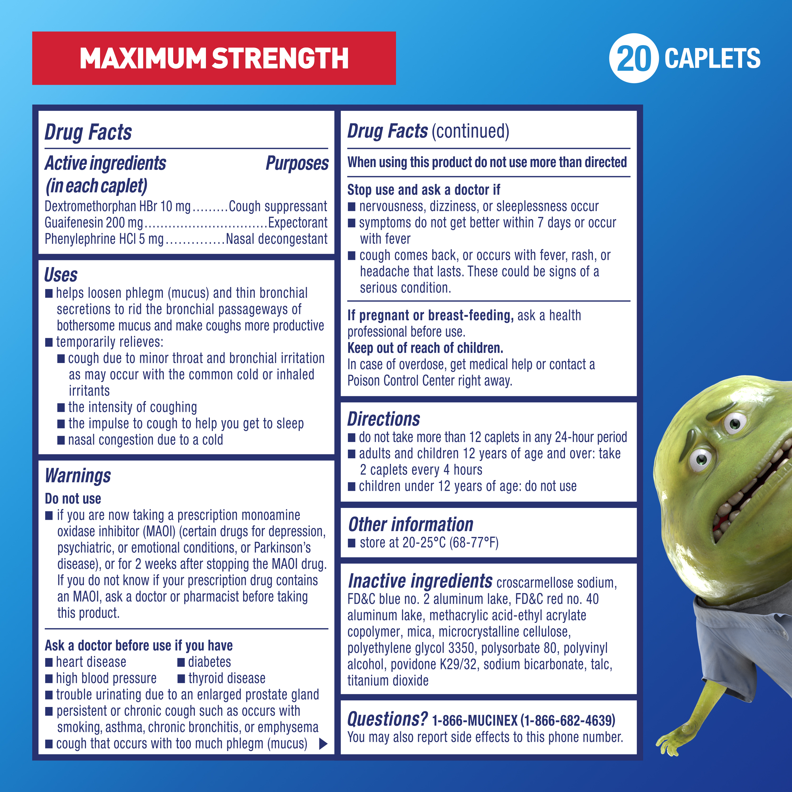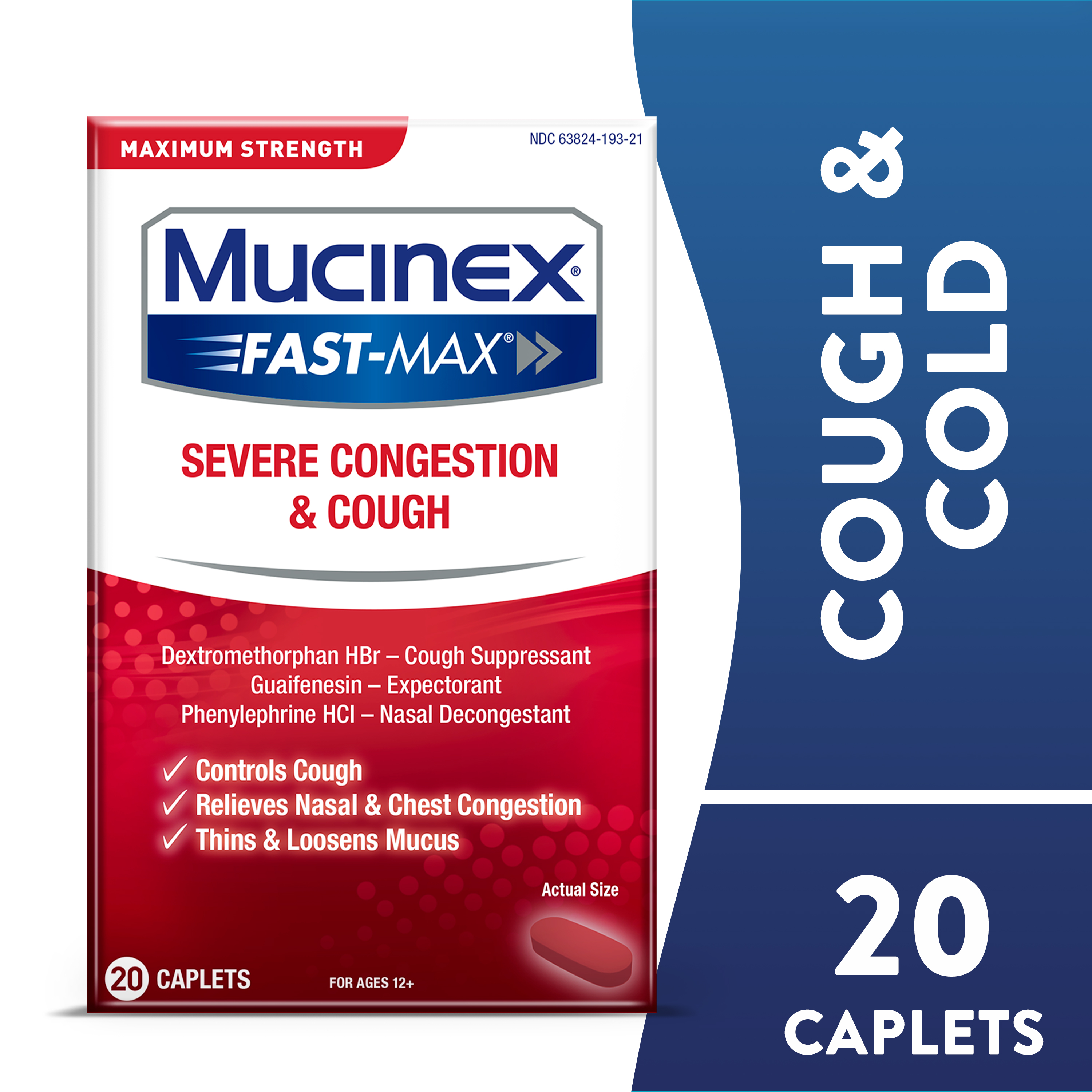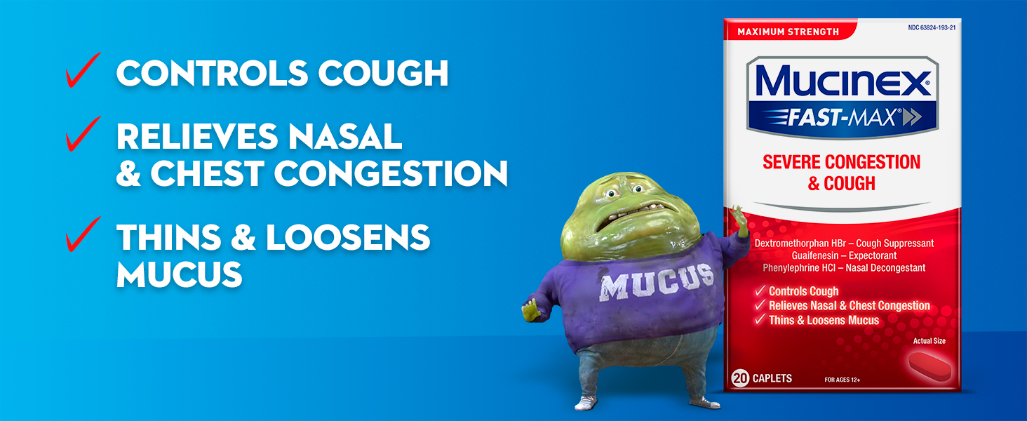 | Product Description | Maximum Strength Mucinex Fast-Max Severe Congestion & Cough is a Multi-Symptom Relief medicine for your Congestion & Cough Symptoms. Maximum Strength Mucinex Fast-Max Severe Congestion & Cough helps relieve cough, thins and loosens mucus and relieves chest and nasal congestion. Mucinex is the #1 Cough & Cold Brand Doctors Trust* and #1 Pharmacist Recommended Brand†. This product contains 20 caplets. Use as directed, for Adults and Children 12 years of age and over.