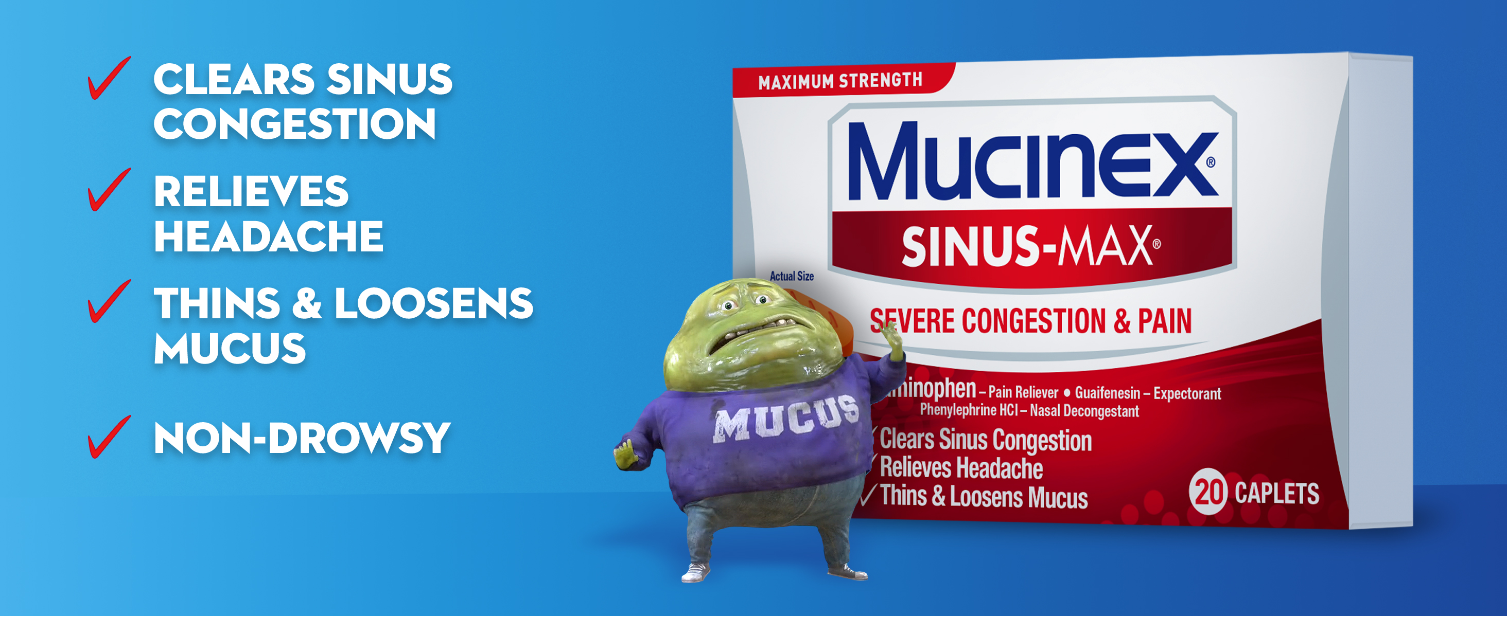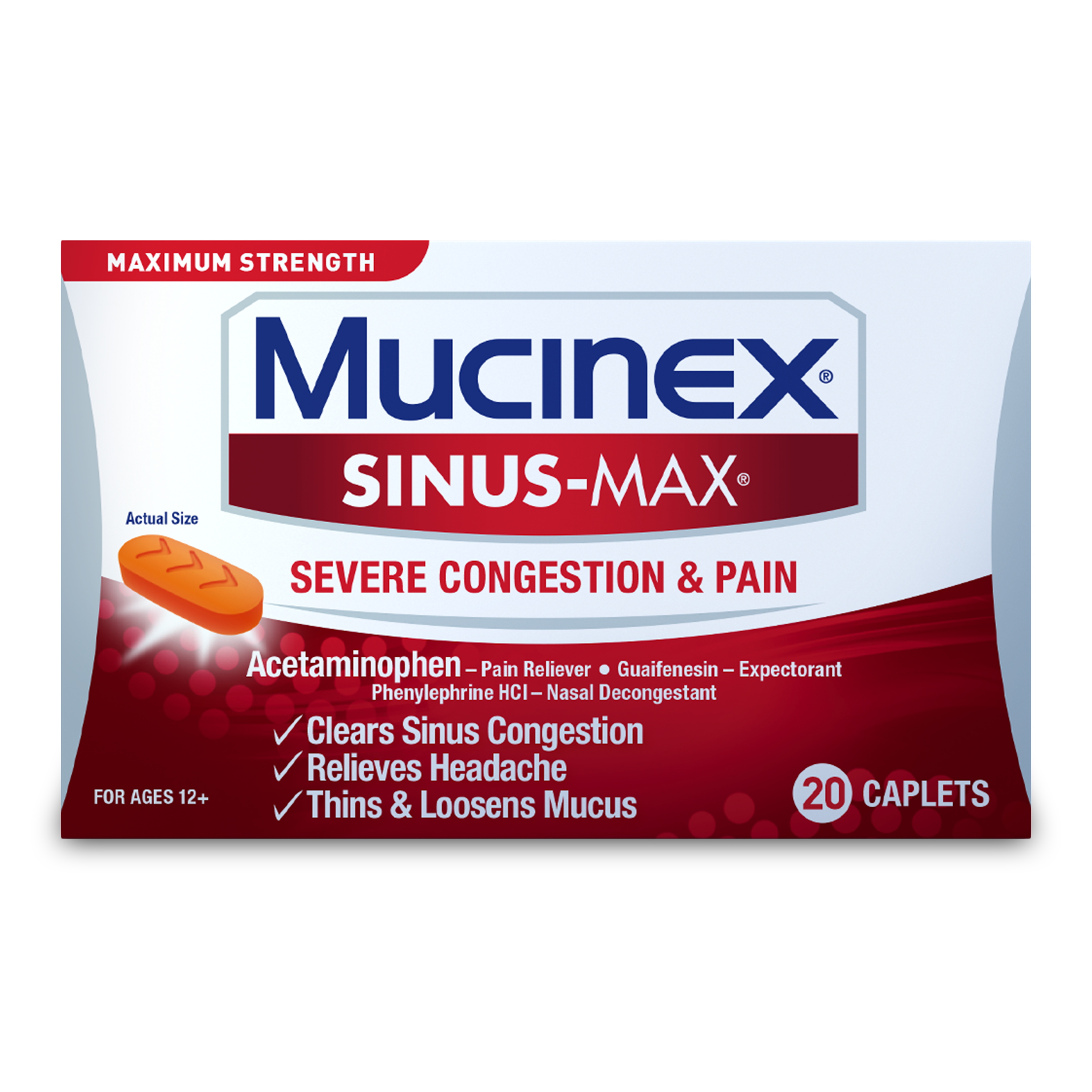- MUCINEX® SINUS MAX: A powerful formula for congestion relief; Mucinex® Sinus-Max brings you nasal & sinus congestion relief with a blend of Acetaminophen, Guaifenesin, & Phenylephrine to target severe nasal & sinus congestion & to relieve headaches
