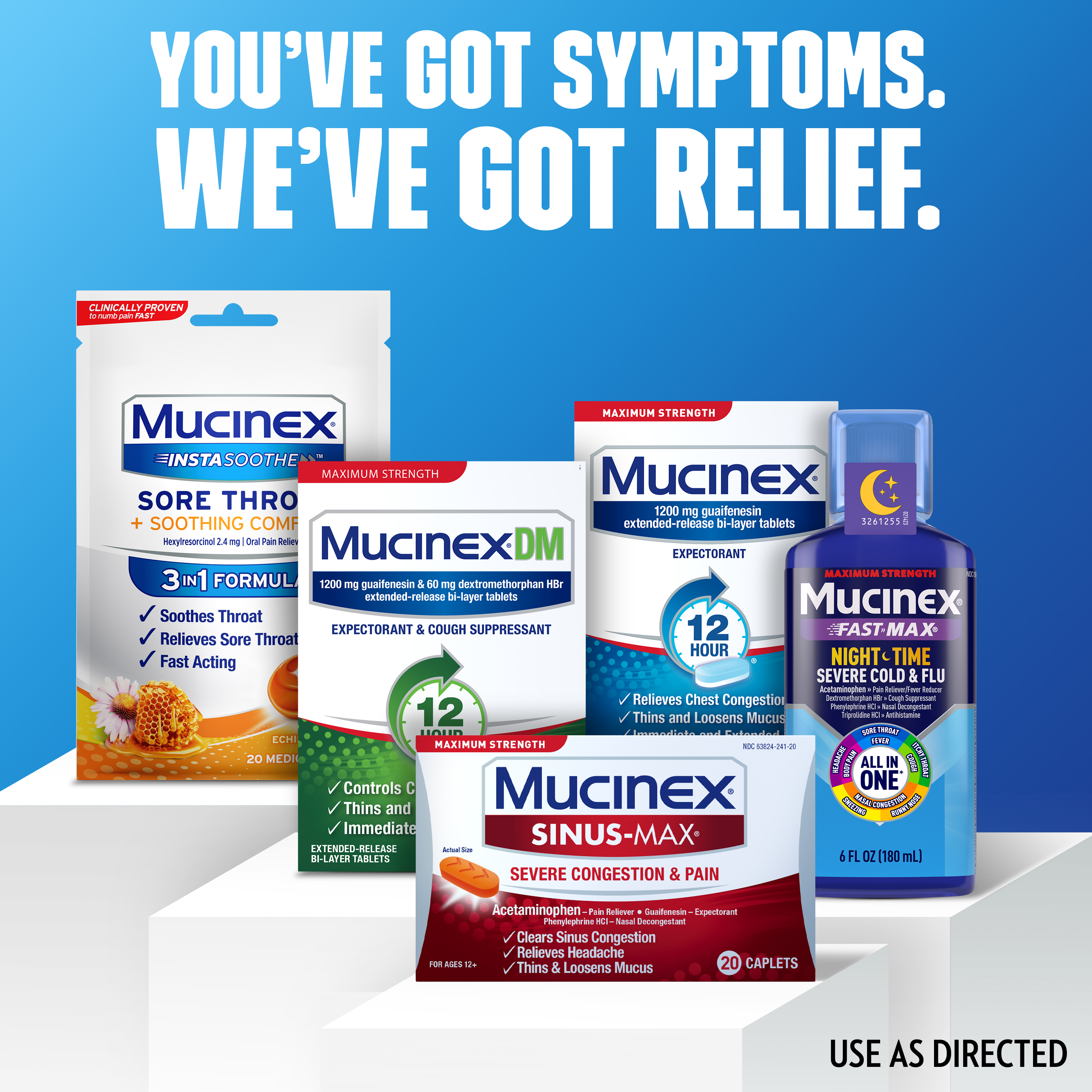 - OVER-THE-COUNTER-MEDICATION: Mucinex® is a trusted brand for over-the-counter-medication that treats most common cold & flu symptoms including nasal congestion, sinus congestion and sinus pressure, headache, and minor aches and pains