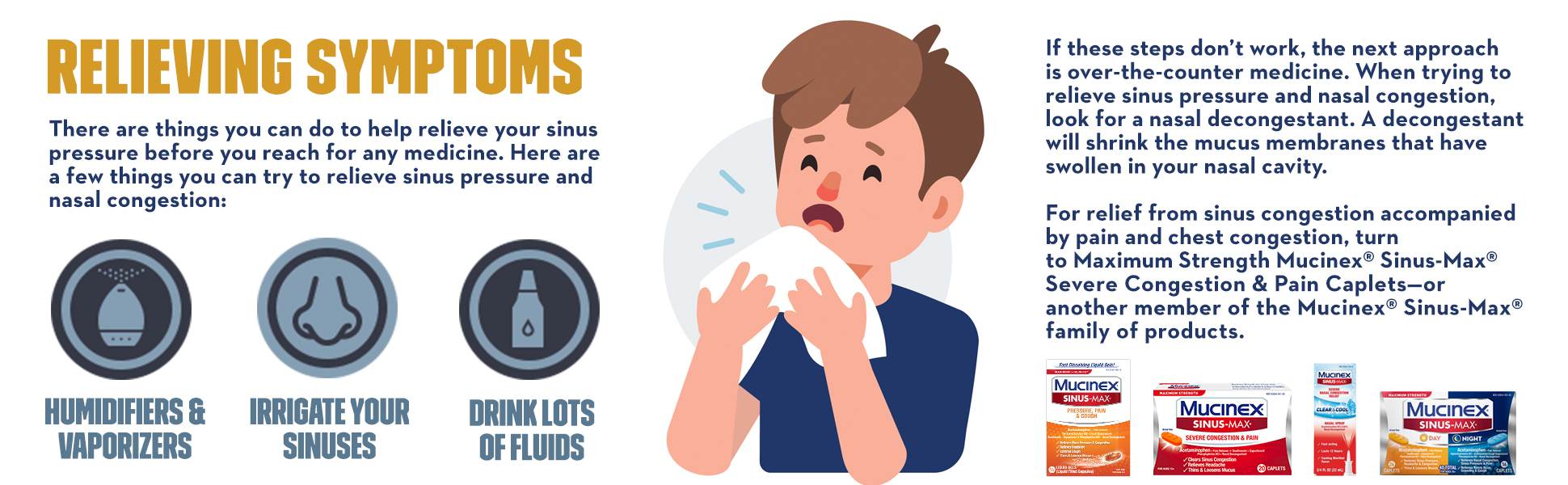 - MAXIMUM STRENGTH MUCINEX SINUS-MAX NIGHT: Helps relieve pain, sinus pressure, nasal congestion, cough, and runny nose & sneezing