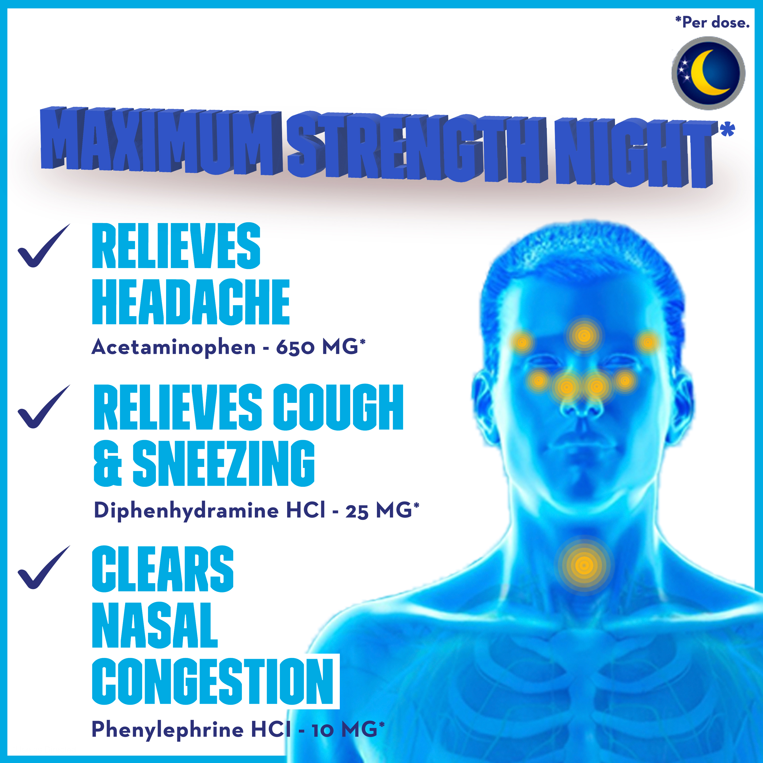 - ACTIVE INGREDIENTS IN NIGHT: Contains Acetaminophen for pain relief, Diphenhydramine HCI as an Antihistamine/Cough Suppressant and Phenylephrine HCl for nasal decongestion