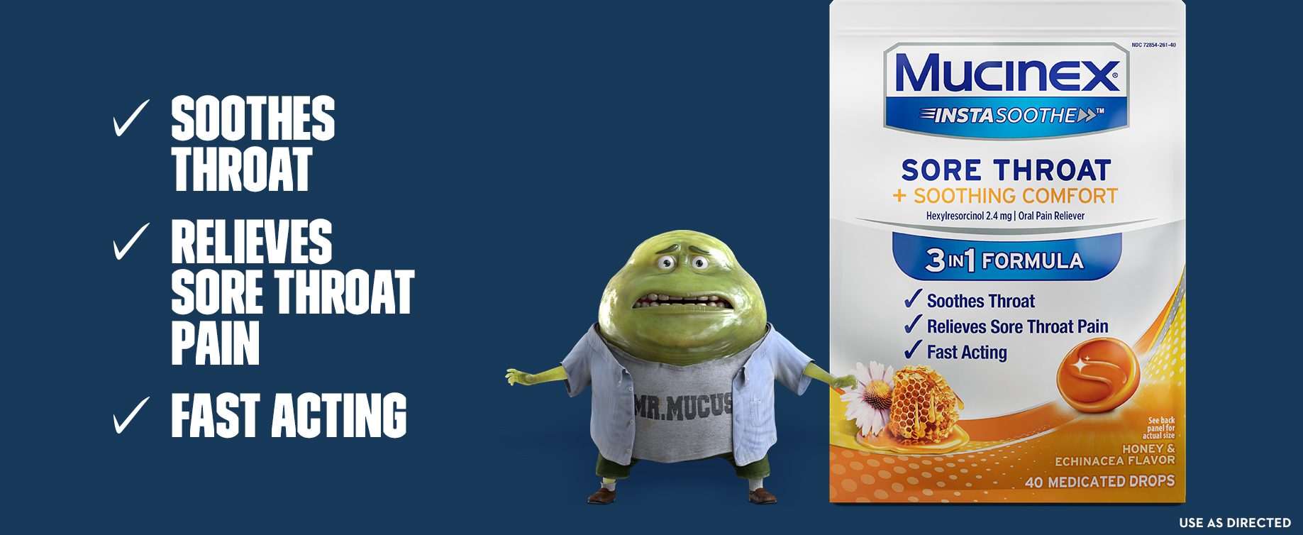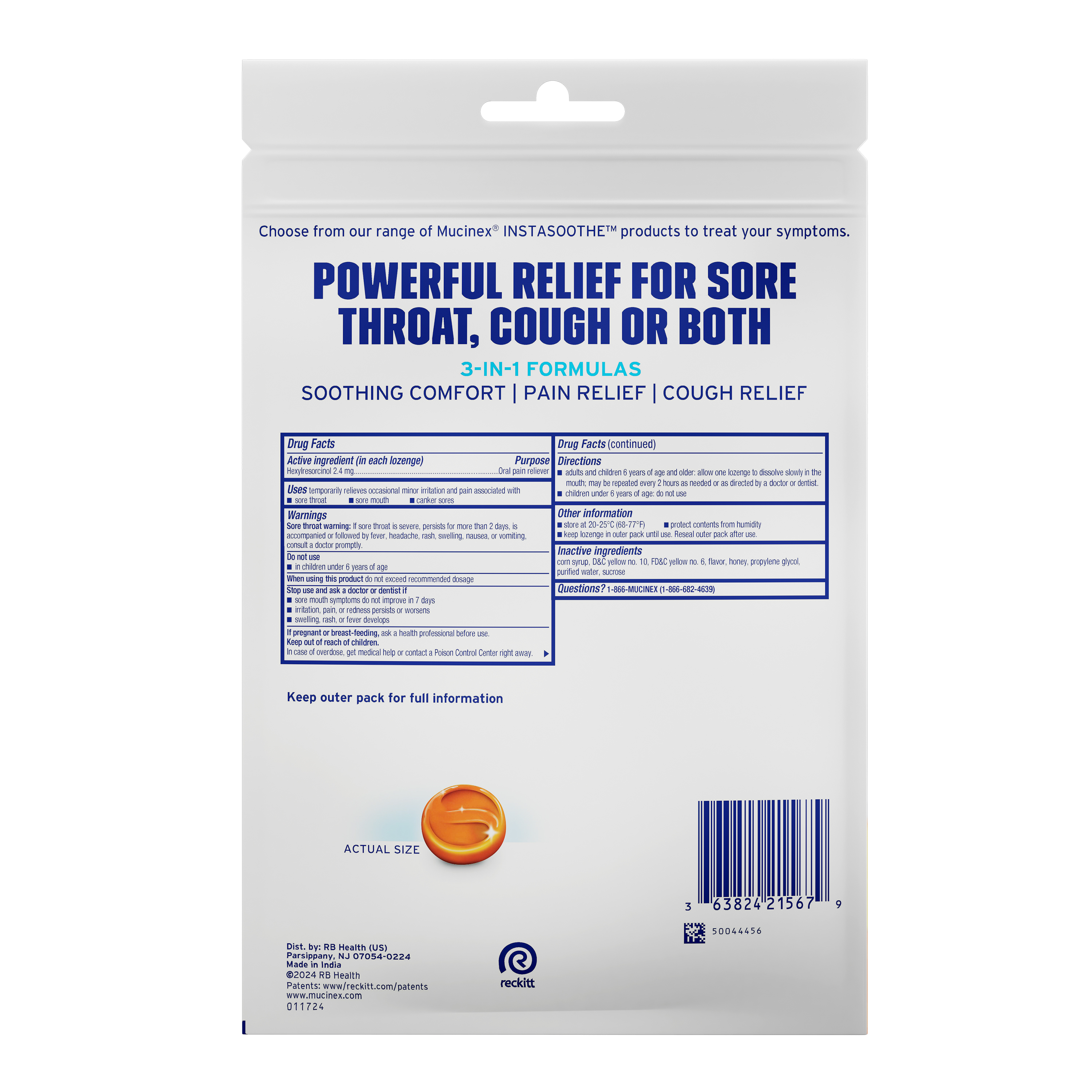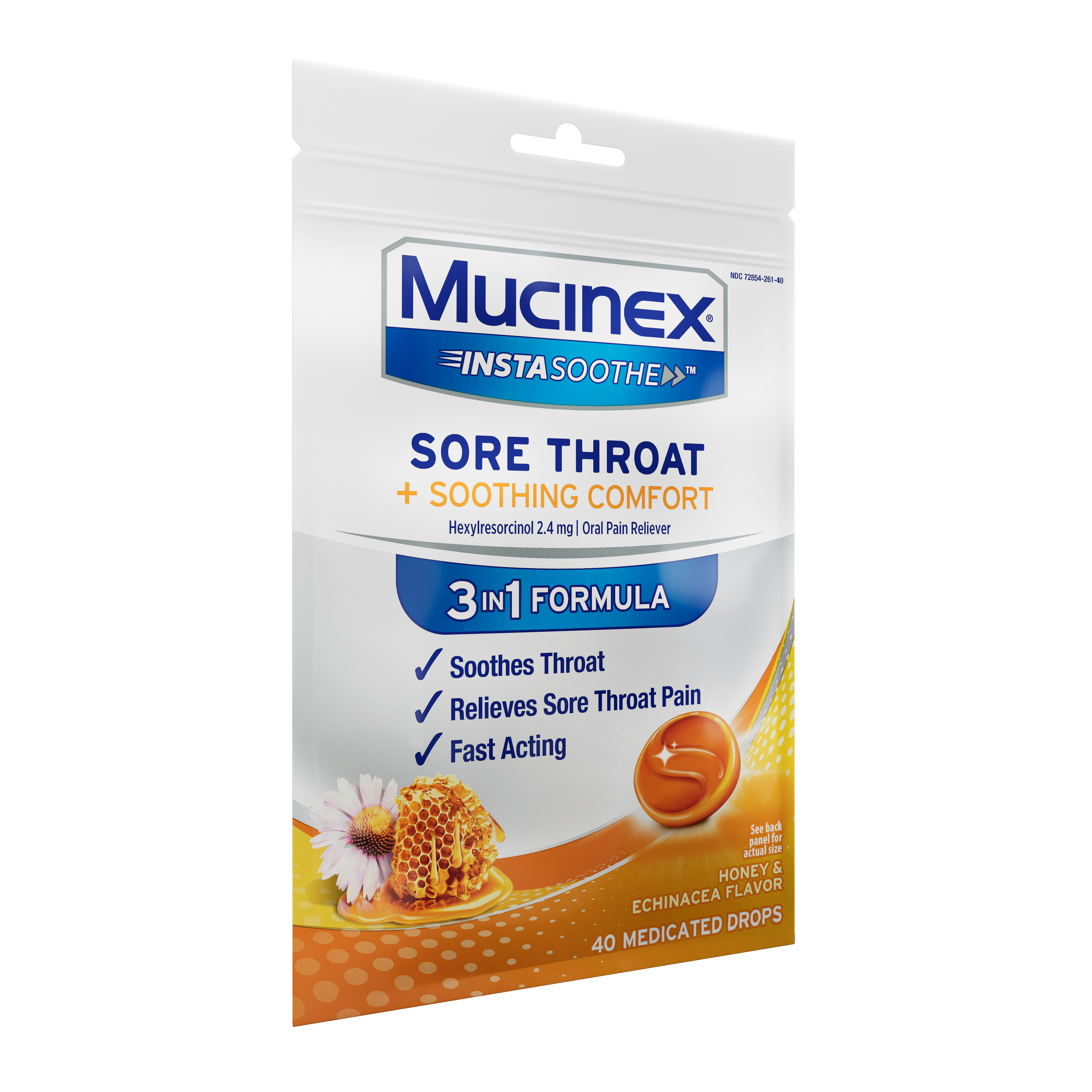 - FAST ACTING SORE THROAT LOZENGES: Mucinex Instasoothe Sore Throat Drops provide rapid relief that lasts up to 2 hours