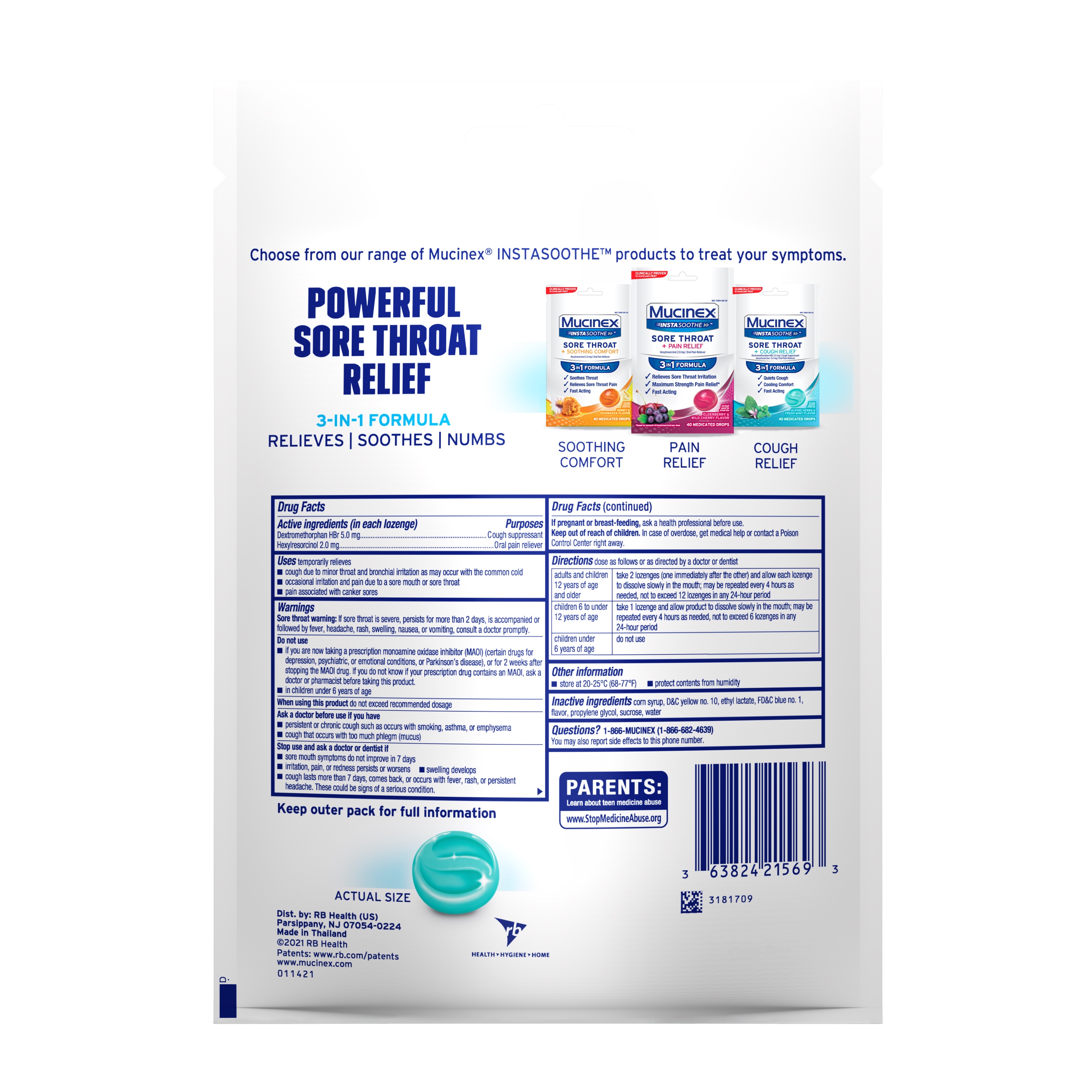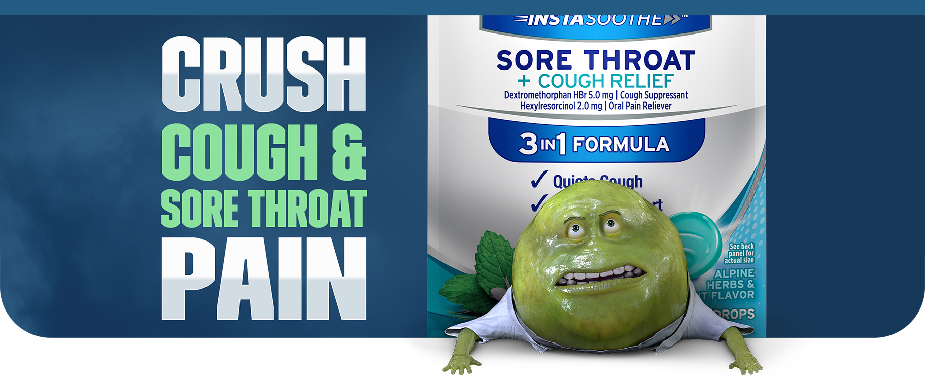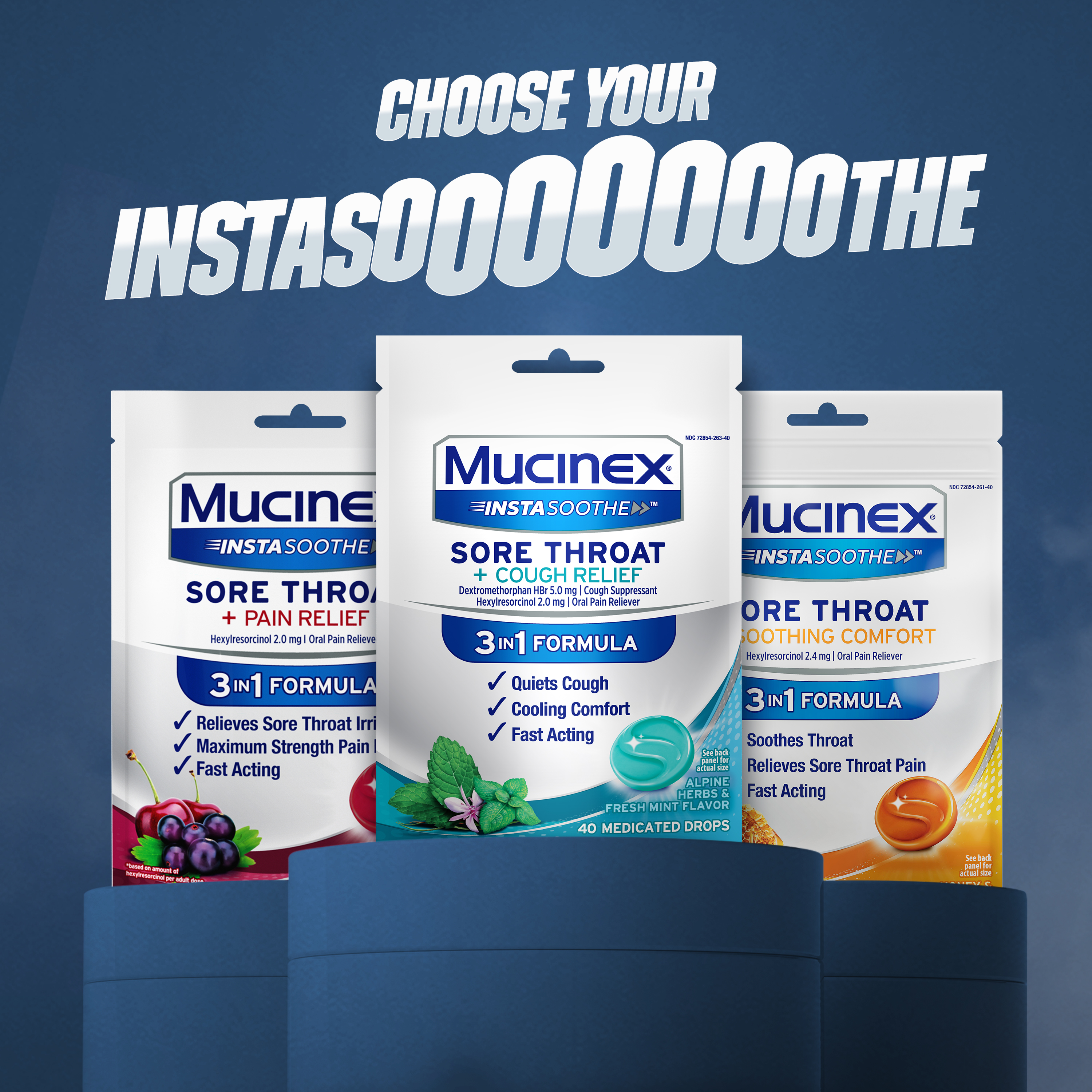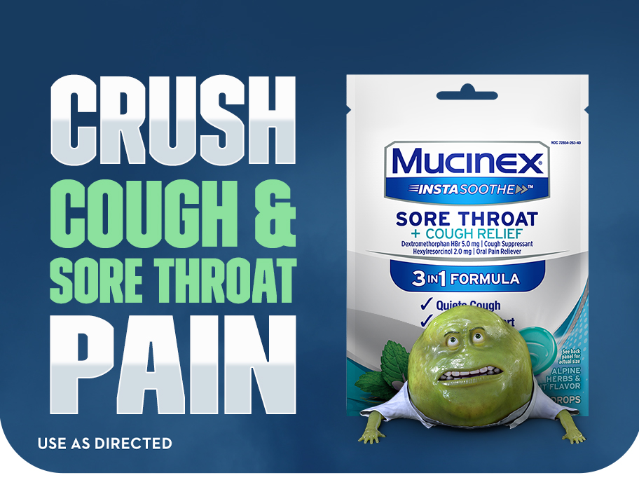 - MUCINEX SORE THROAT + COUGH RELIEF DROPS: Kick that pesky cough to the curb with Mucinex Instasoothe Sore Throat + Cough Relief medicated drops; Contains a cough suppressant & an oral pain reliever that provides sore throat relief