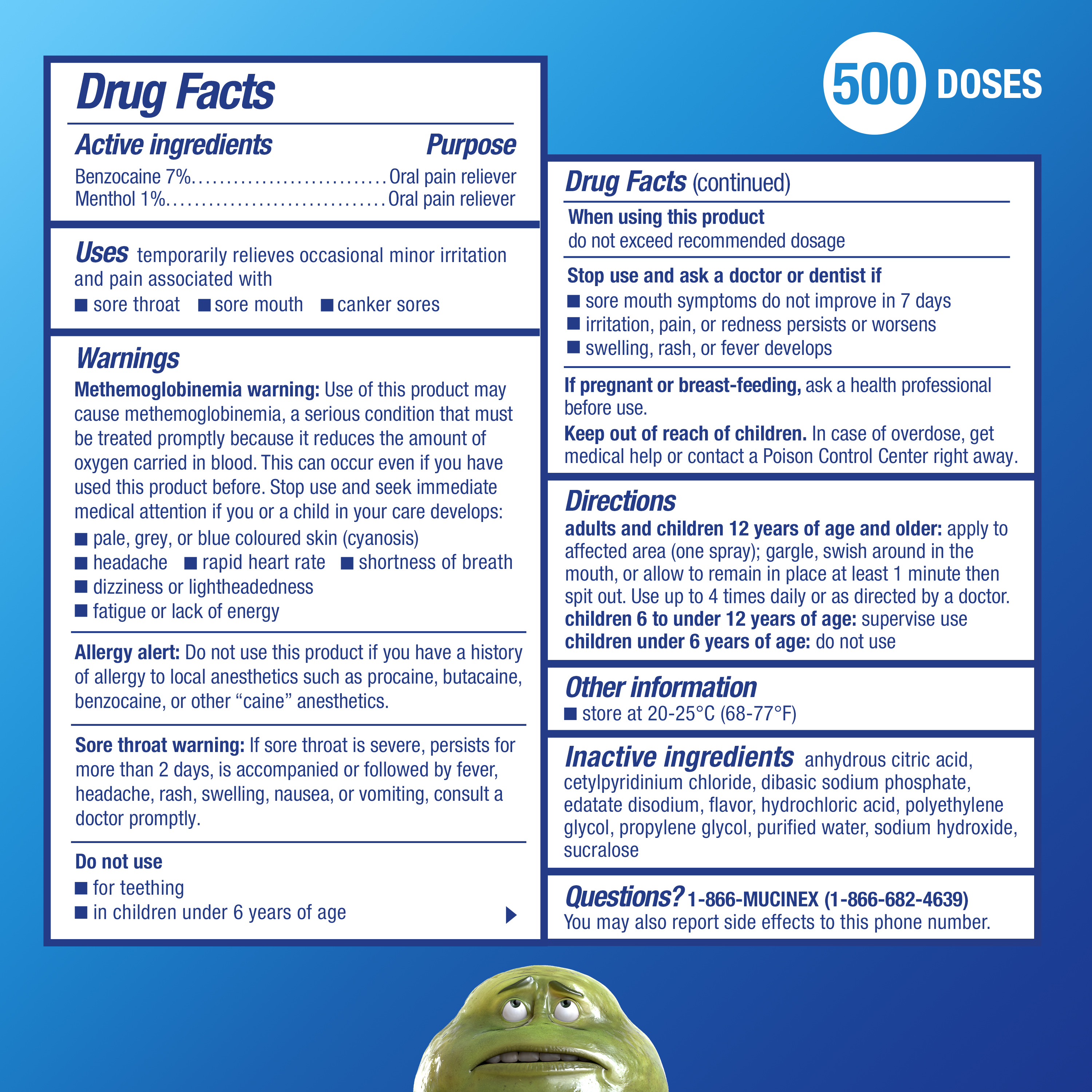 - SORE THROAT PAIN MEDICINE: Mucinex Instasoothe Sore Throat Spray contains 3.8 fl oz / 500 doses and relieves pain associated with sore throats